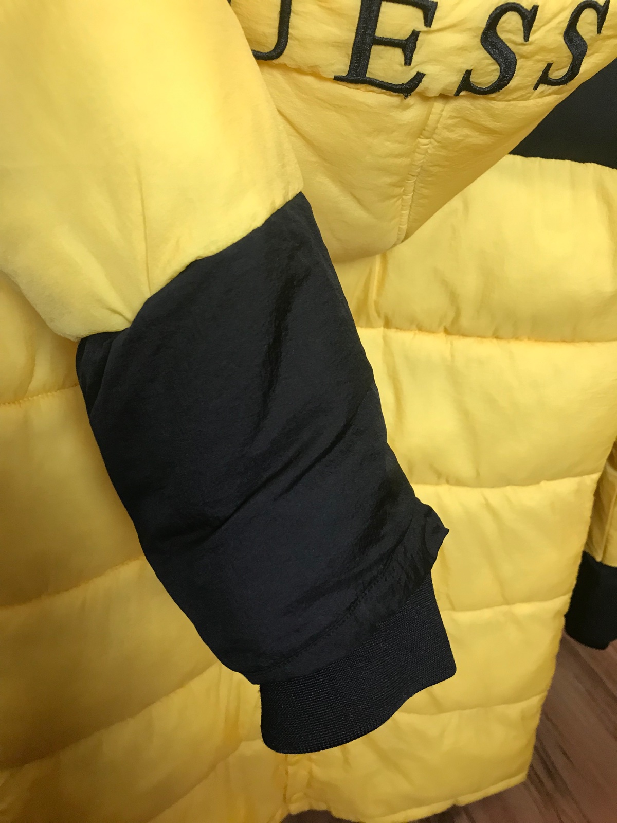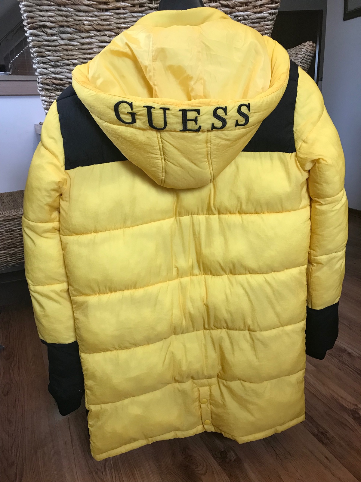 Perfektna bunda v super stave, oblecena len parkrat. Lahka, zateplena, predlzena, s vysokym golierom a kapucou s ochrannym siltikom. Sirka: 54 cm, dlzka 74, rukav 64 cm. K dispozicii aj ciapka Gues...