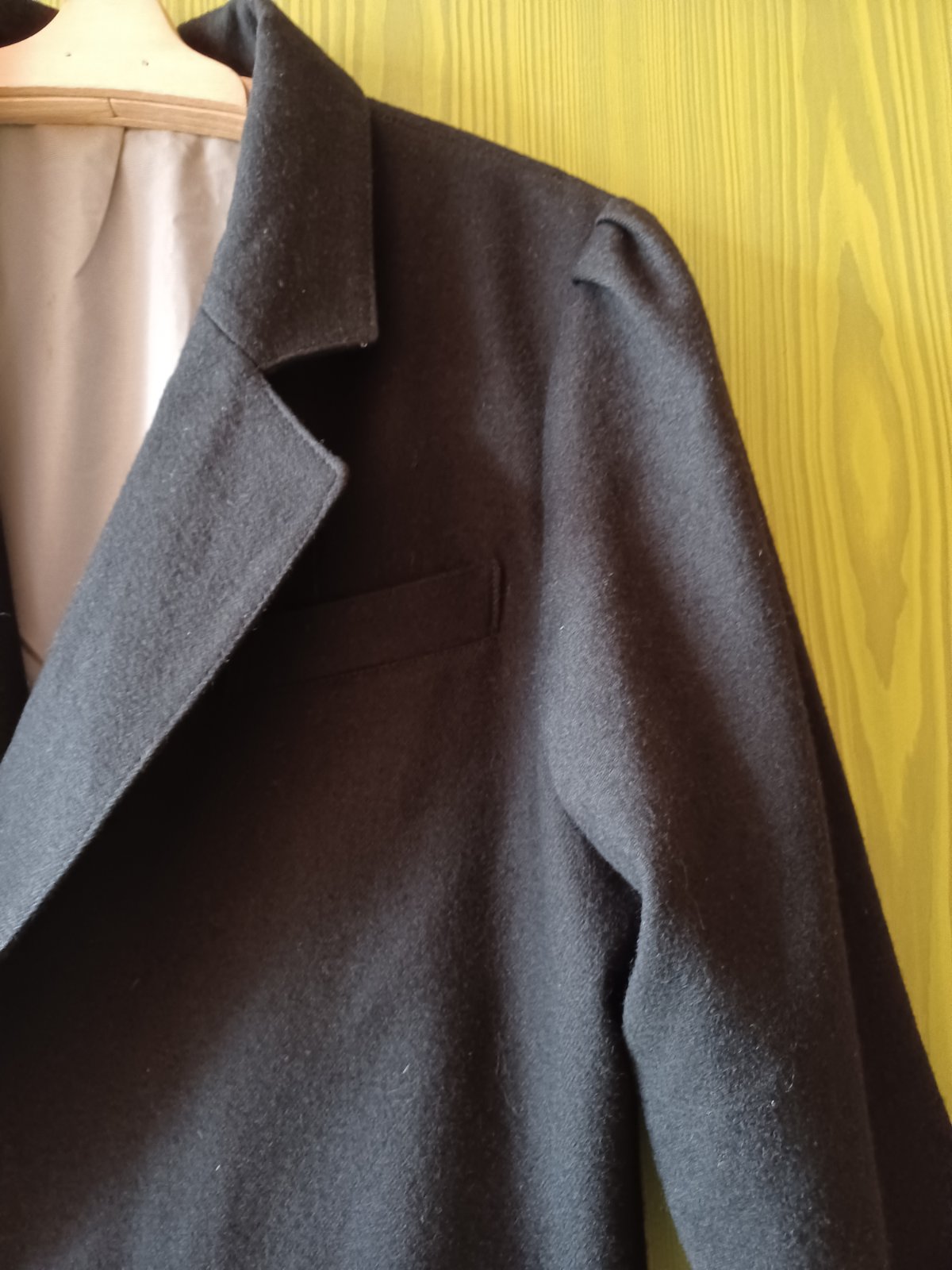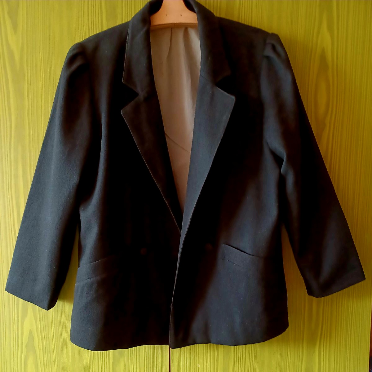 Sako vlnene v módnom štýle. Je málo nosené. Má voľný strih, nabraté plecia, vhodné na prechodné obdobie.
