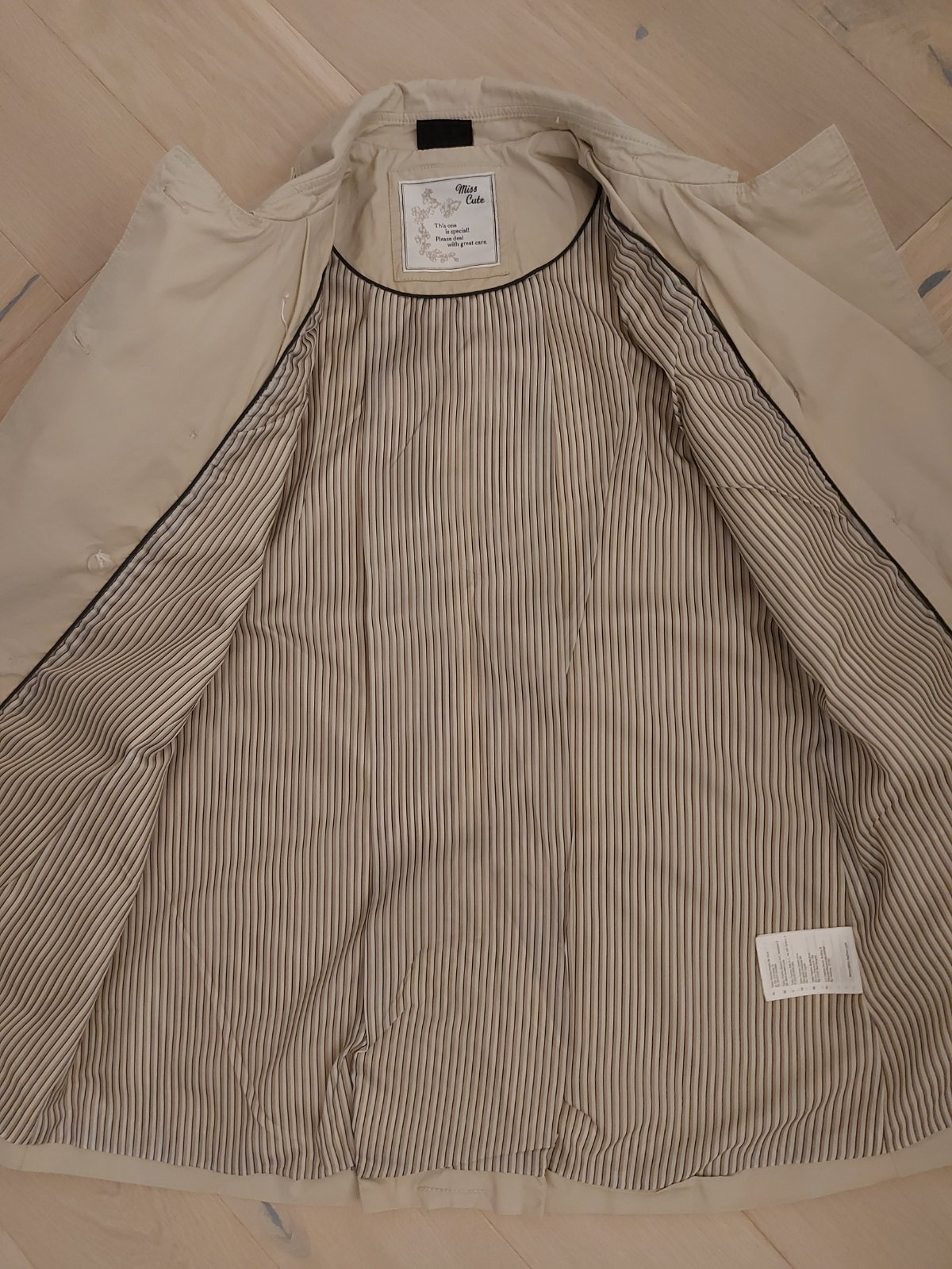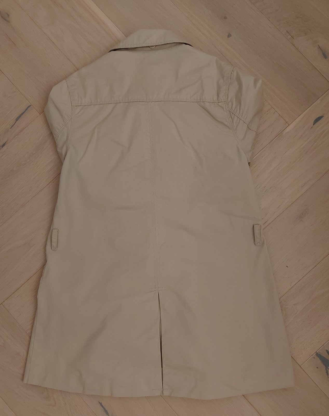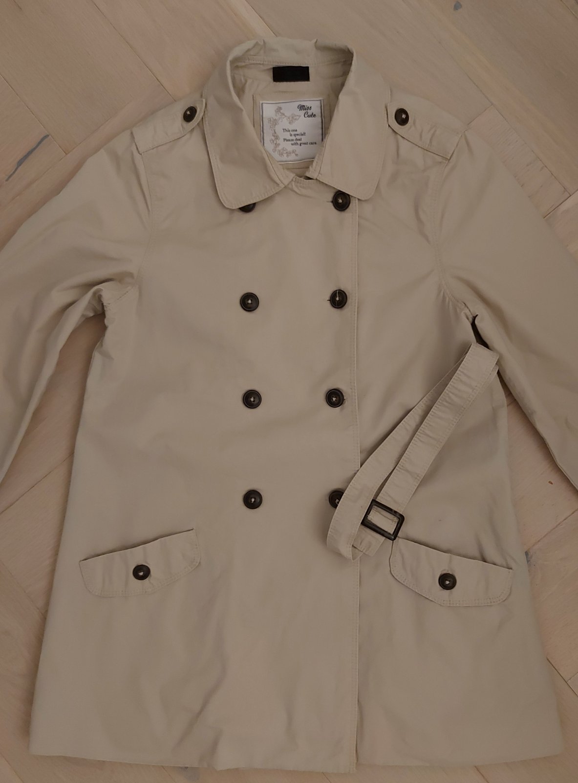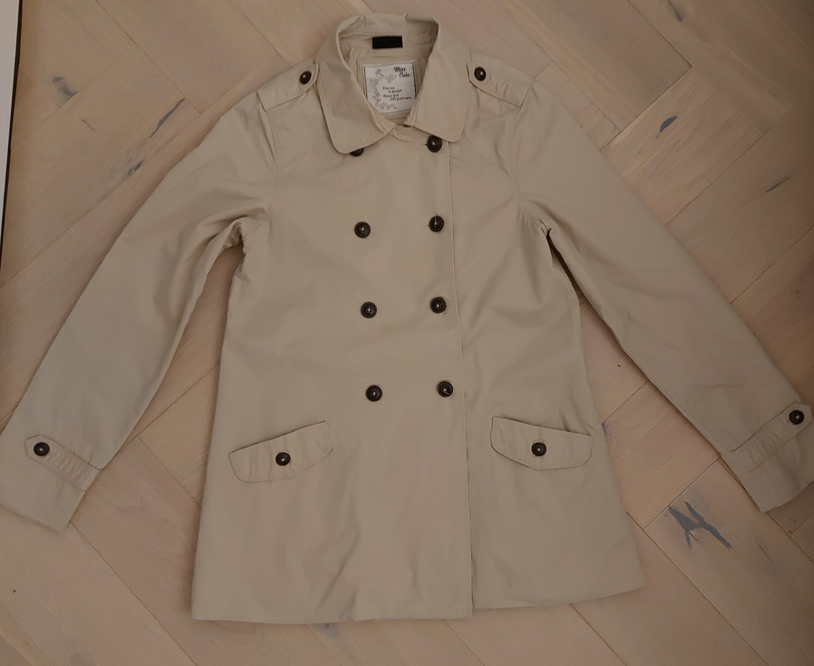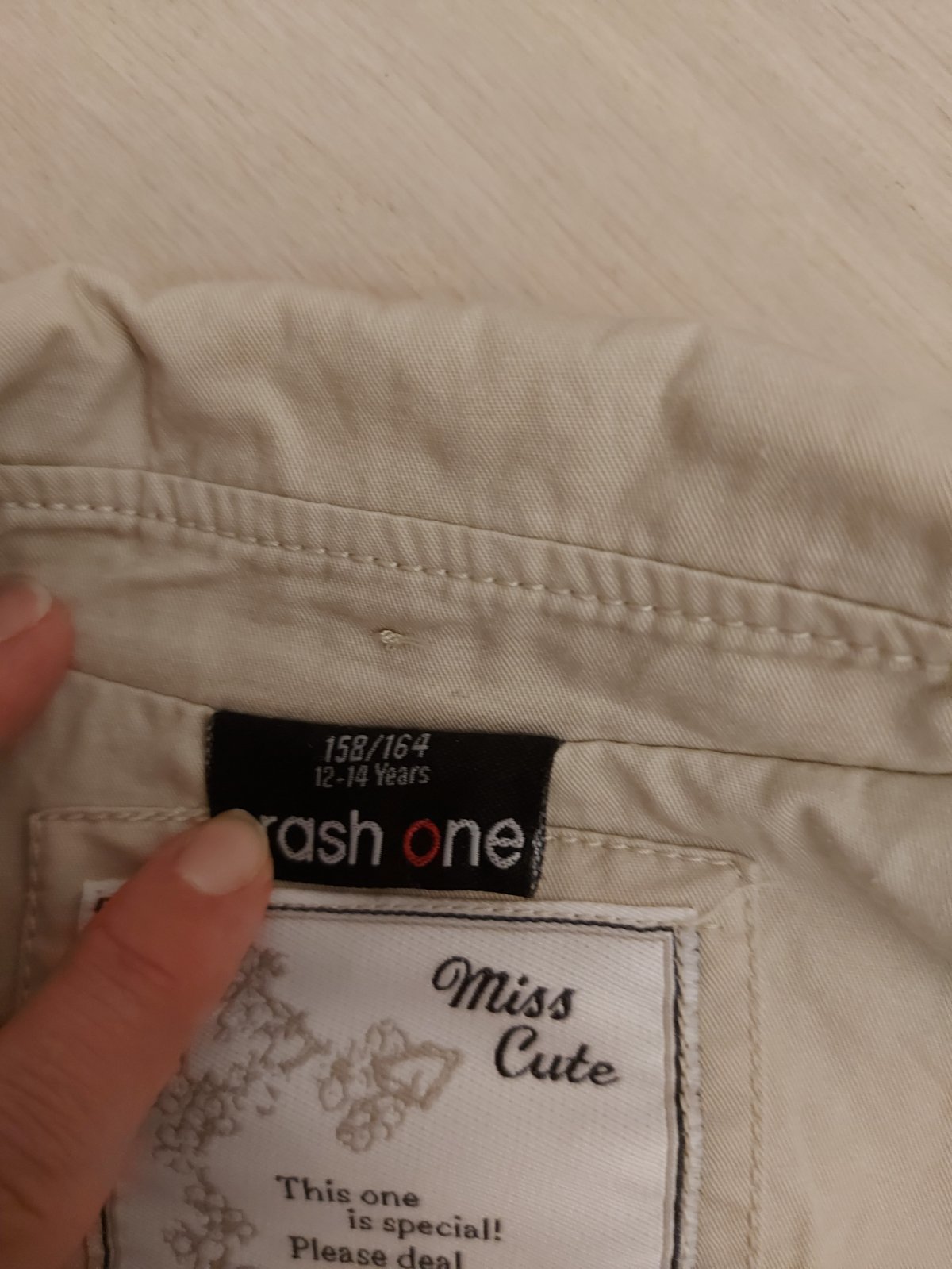 Ponúkam na predaj plášť béžovej farby, podšitý, veľkosť 158/164, zapínanie na gombíky, s previazaním opaskom v páse (dá sa nosiť s alebo bez), kupovaný z druhej ruky tu na MK, pôvodne súčasťou bola aj odopinateľná kapucňa, ja som kupovala už bez nej, (preto sú na foto vidieť aj gombíky), noseniu to nijak nevadilo.