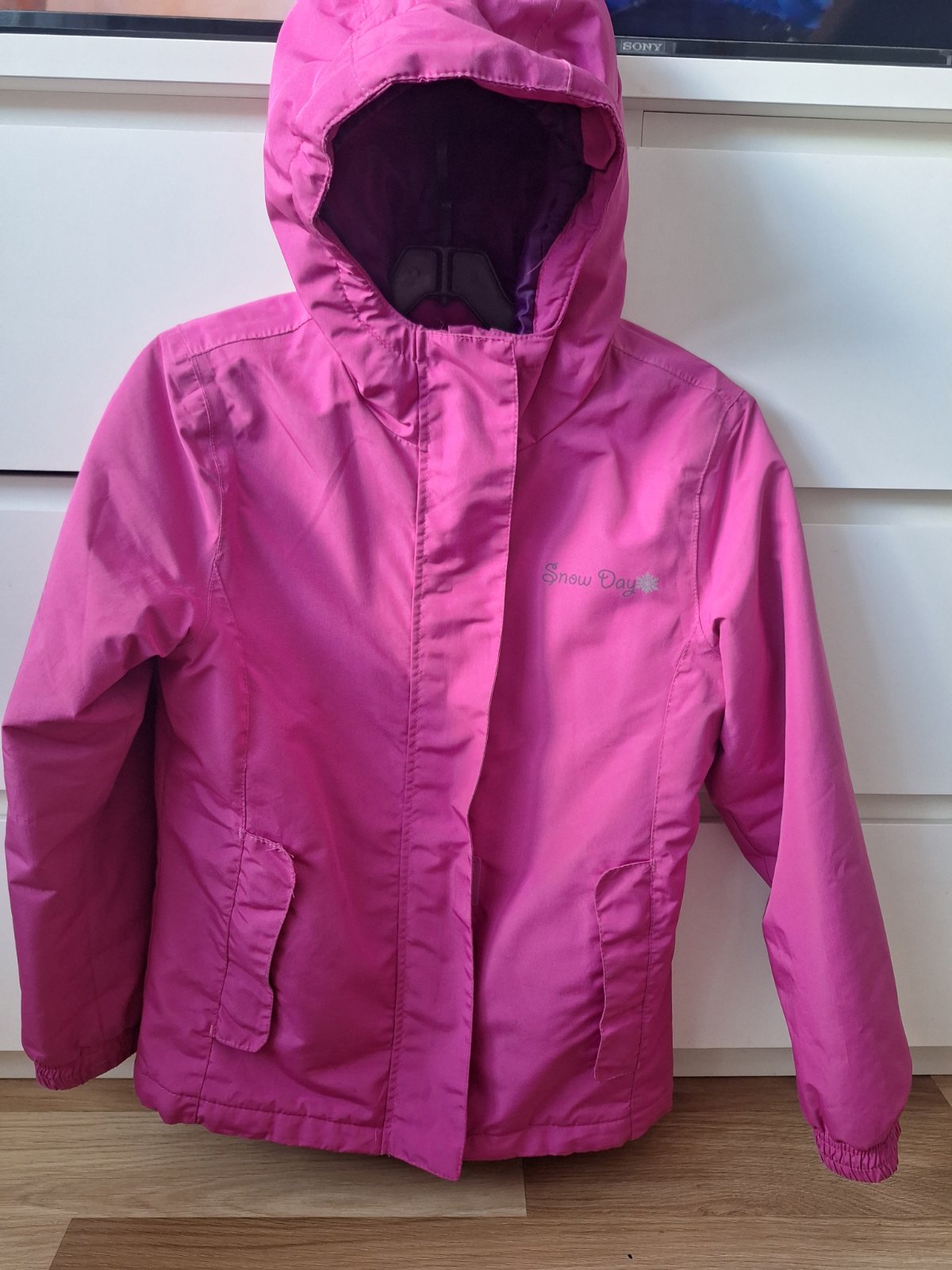 Zimná bunda vhodná do školy, aj lyžovanie. Vrecká na zips, pás proti podfúknutiu, na rukávoch patent, zapínanie na zips, Dĺžka 54 cm Šírka 45 cm