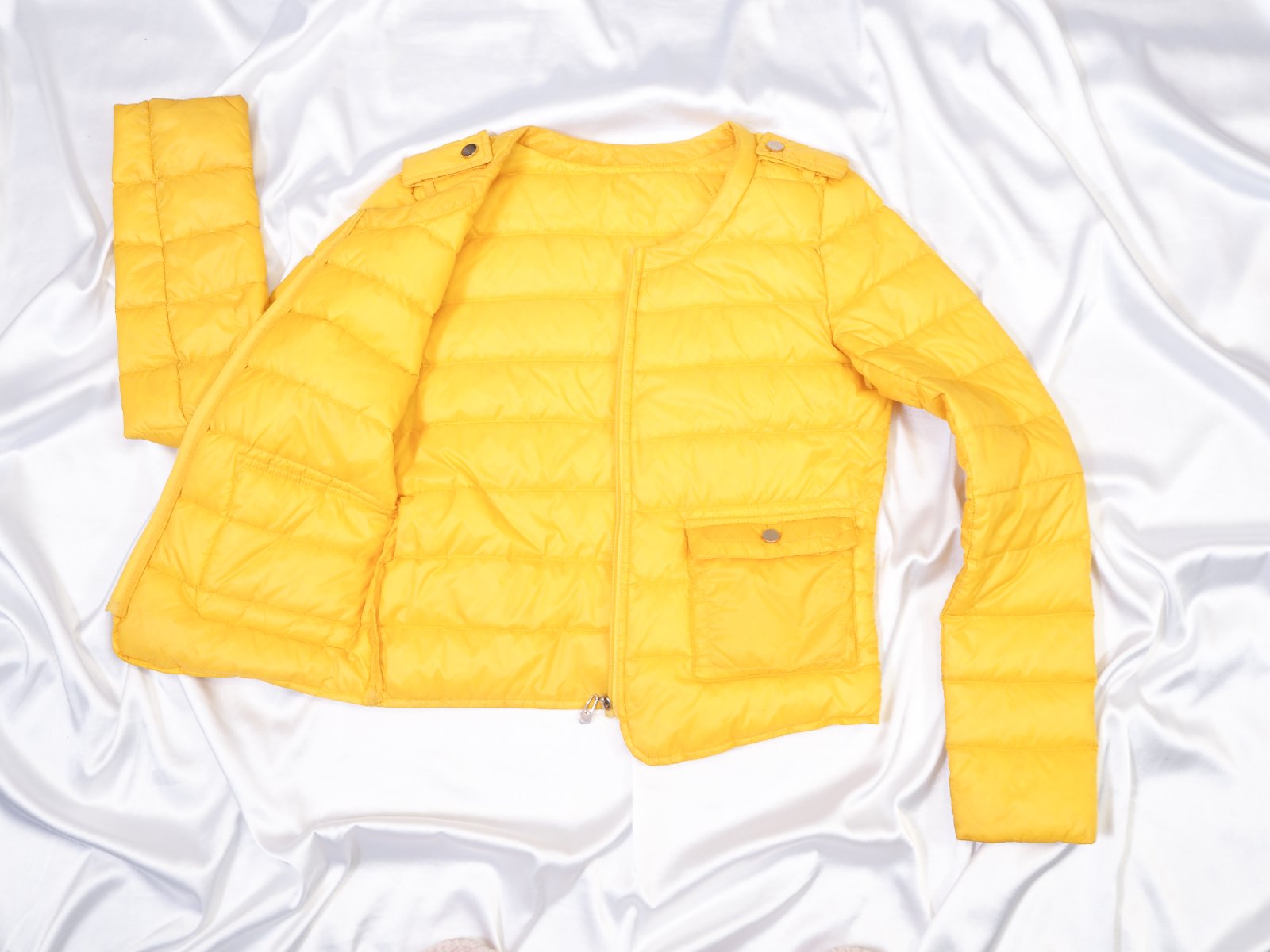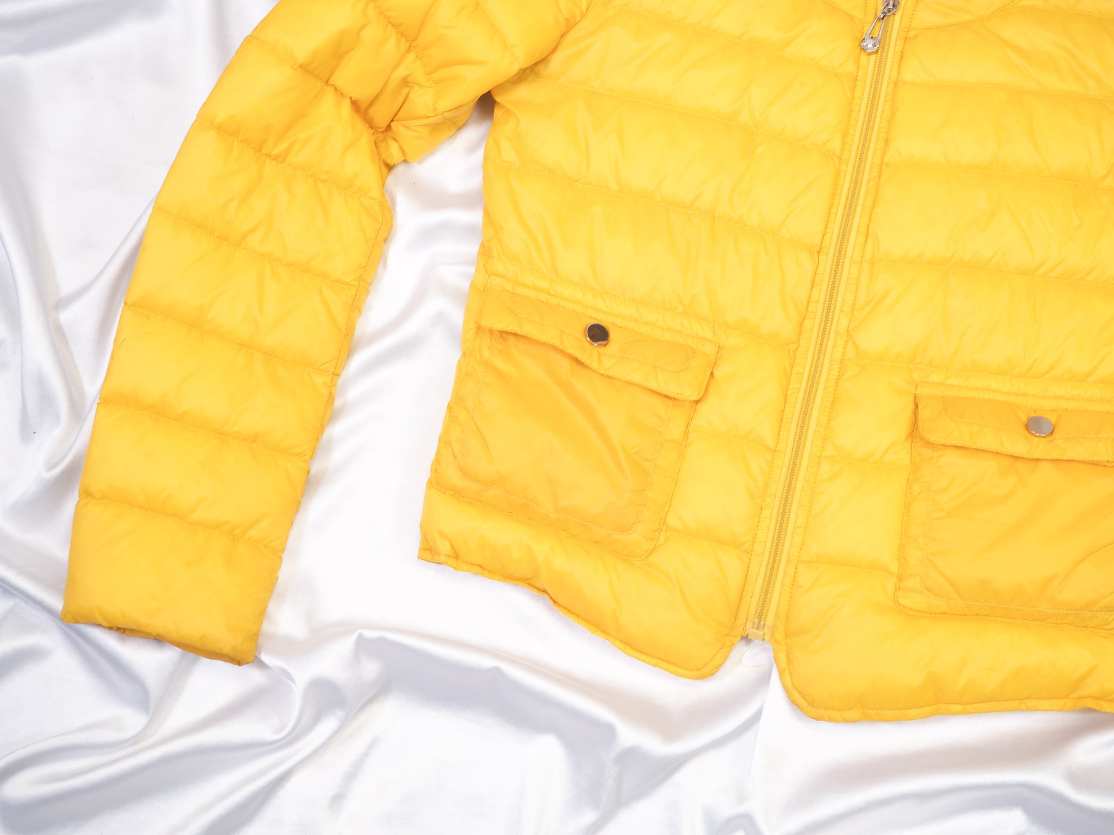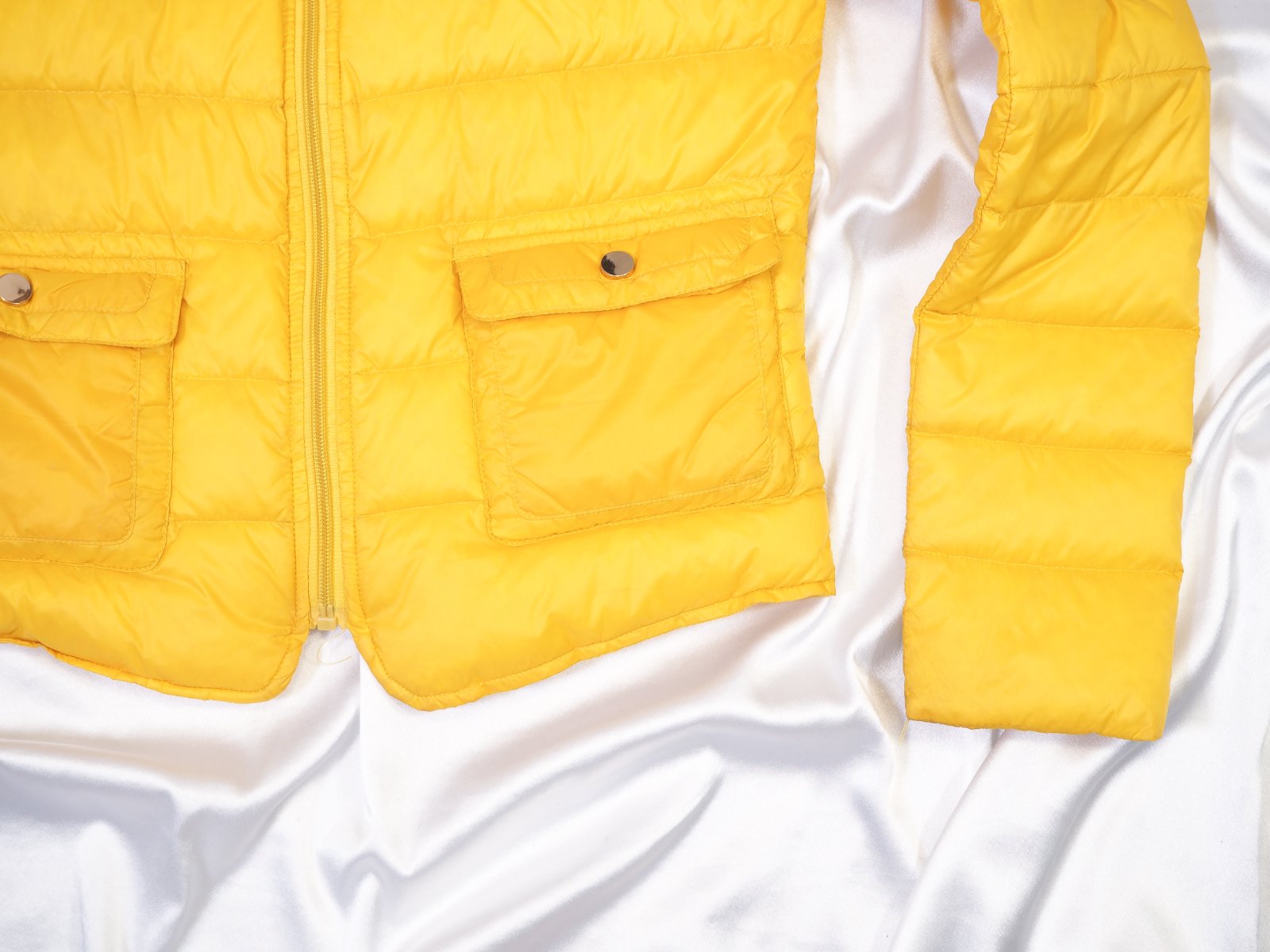 Kvalitná pierková bunda žltej farby, zapínanie na zips, materiál 100% polyester, super stav.
