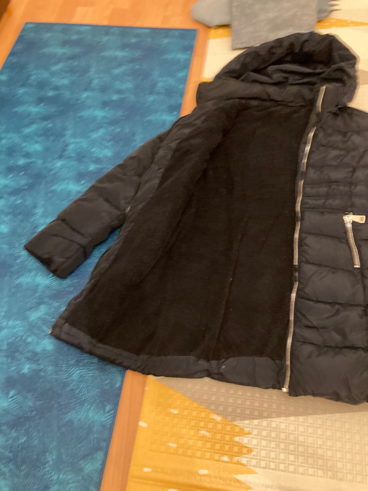 Nenosena, iba vyskusana, tepla vnutri kozusinka, vhodna aj na tuhsiu zimu je hrubsia, velkost sadne xs s aj m postavam, farbaje tmavomodra. Kapuca sa da odopnut, je k nej i kozusinka.