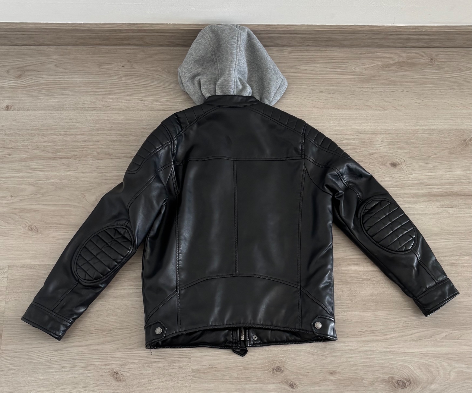Ponukam ciernu frajersku kozenkovu ,motorkárskou bundu. Cela je podsita, v prednej časti vrecka funkcne vrecká na zips. Zaujímavé detaily, presúvania. dlzka 54,6cm Šírka 48 cm rukav od krku 70,6 cm