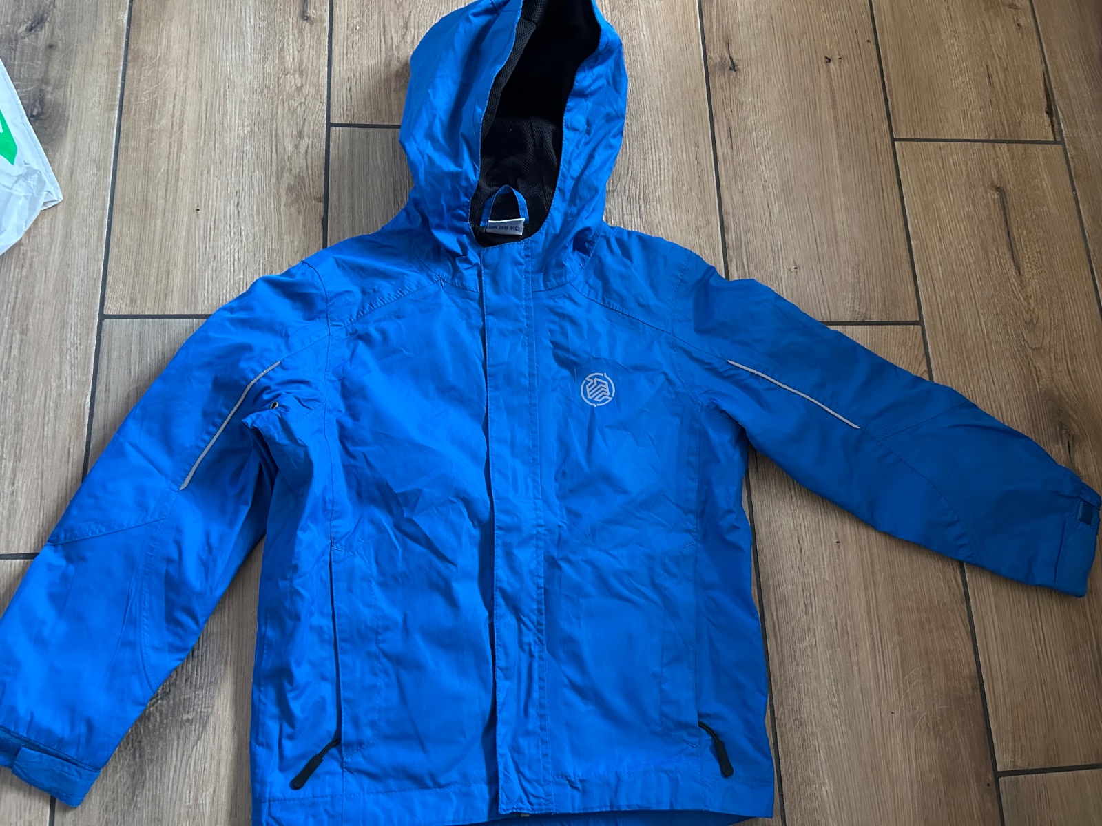 Nepremokavá bunda, veľkosť 128, podšitá sieťovinou, rukávy podšité šuštiakom, reflexné prvky, odopínateľná kapucňa, dolu na stiahnutie