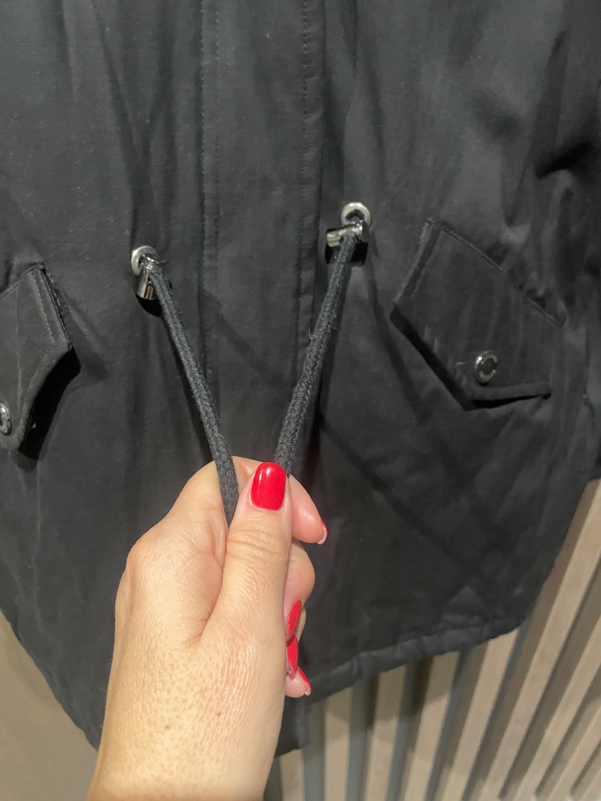 V páse sa dá stiahnuť šnúrkou, kapucňa je napevno, vnútro je kožušinka. Zadný diel bundy je mierne predĺžený. Kožušinka na kapucni je pekná, nepolepená. Cena s poštou.