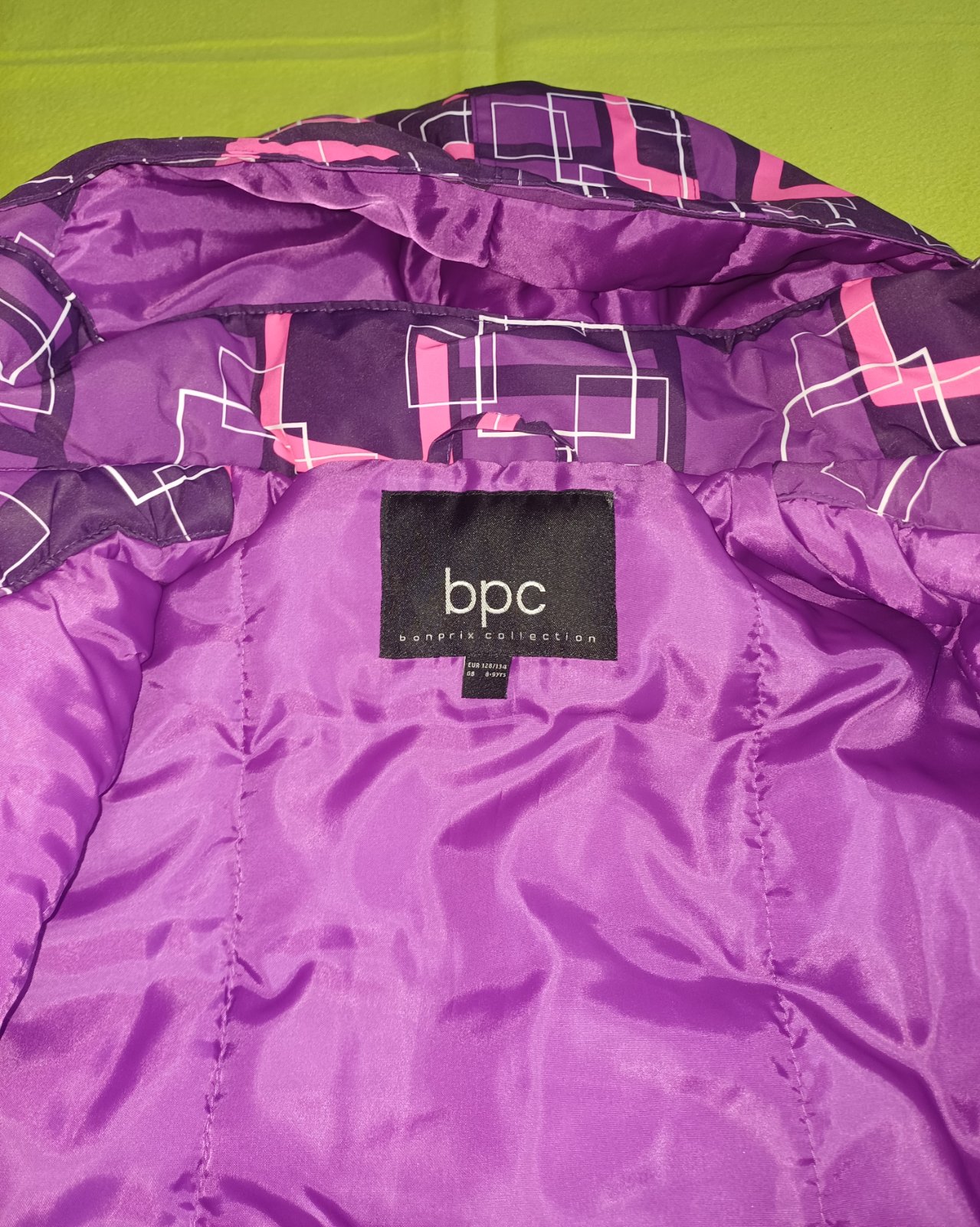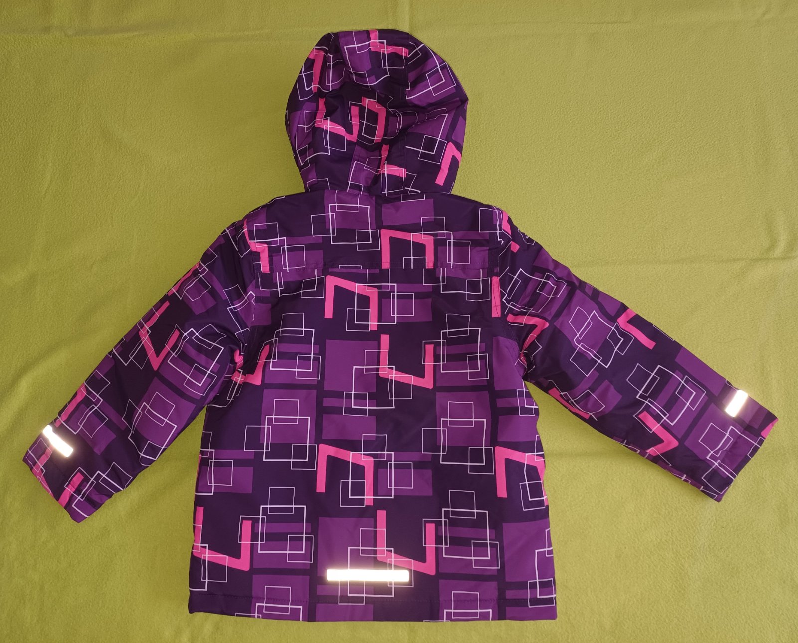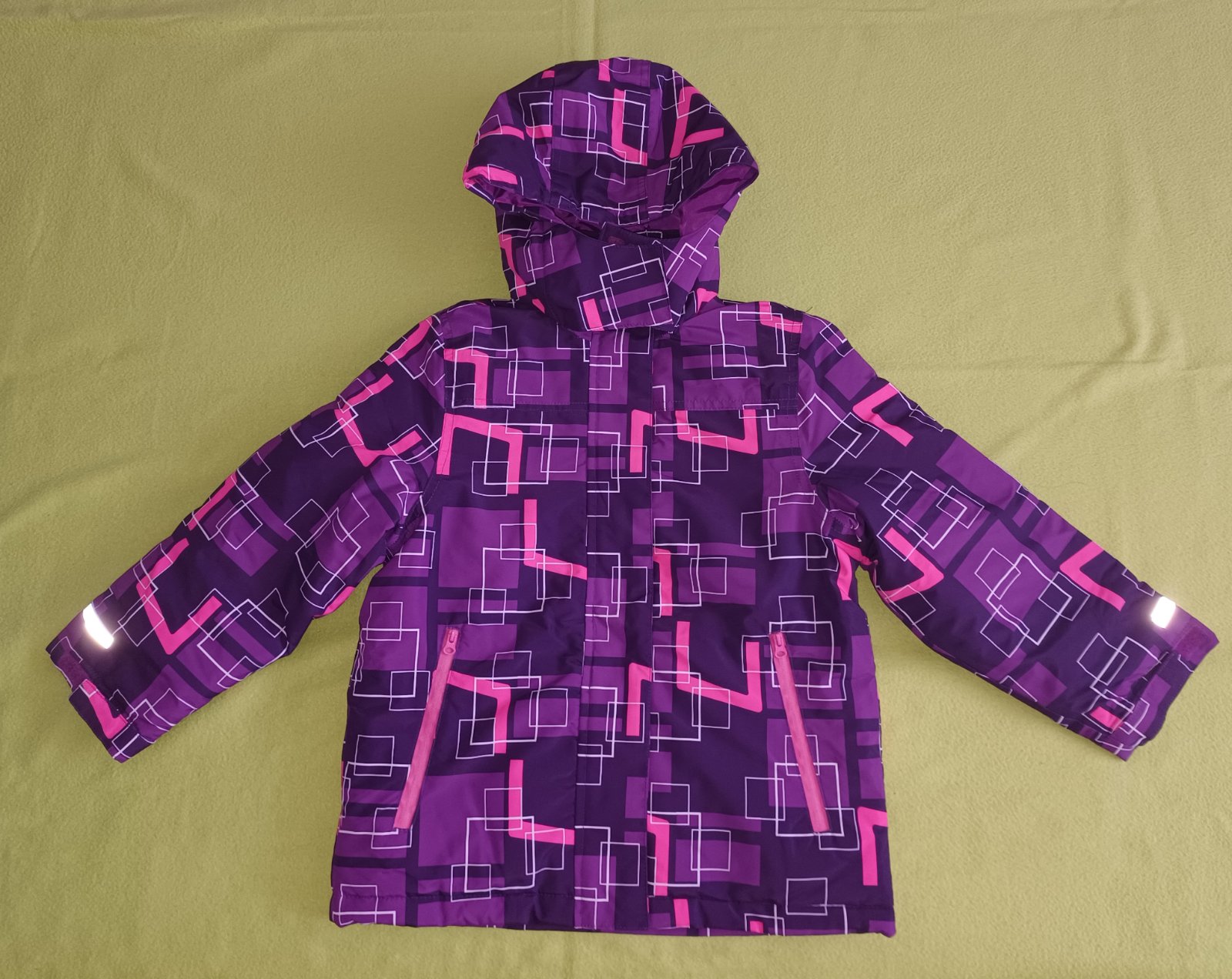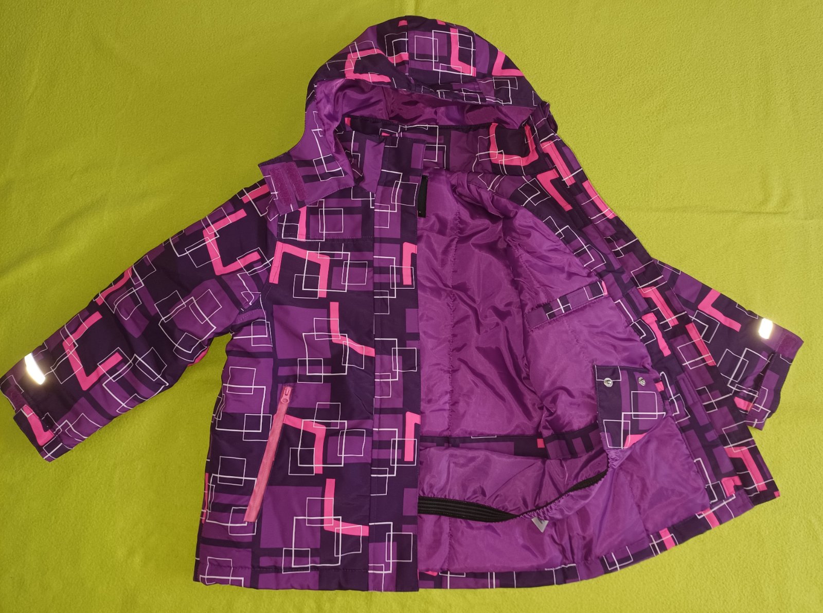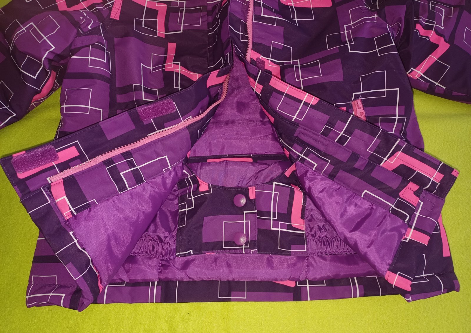 Bunda je kombináciou viacerých farieb - svetlofialovej, tmavofialovej ružovej a bielej farby s reflexnými prvkami a neodnímateľnou kapucňou. Zapínanie na zips a suchý zips. Vnútri bundy zapínanie aj v páse.