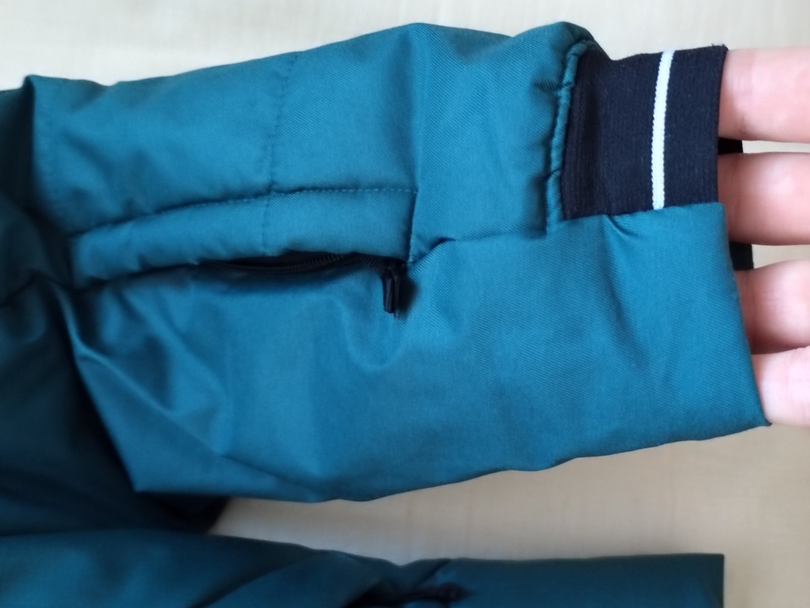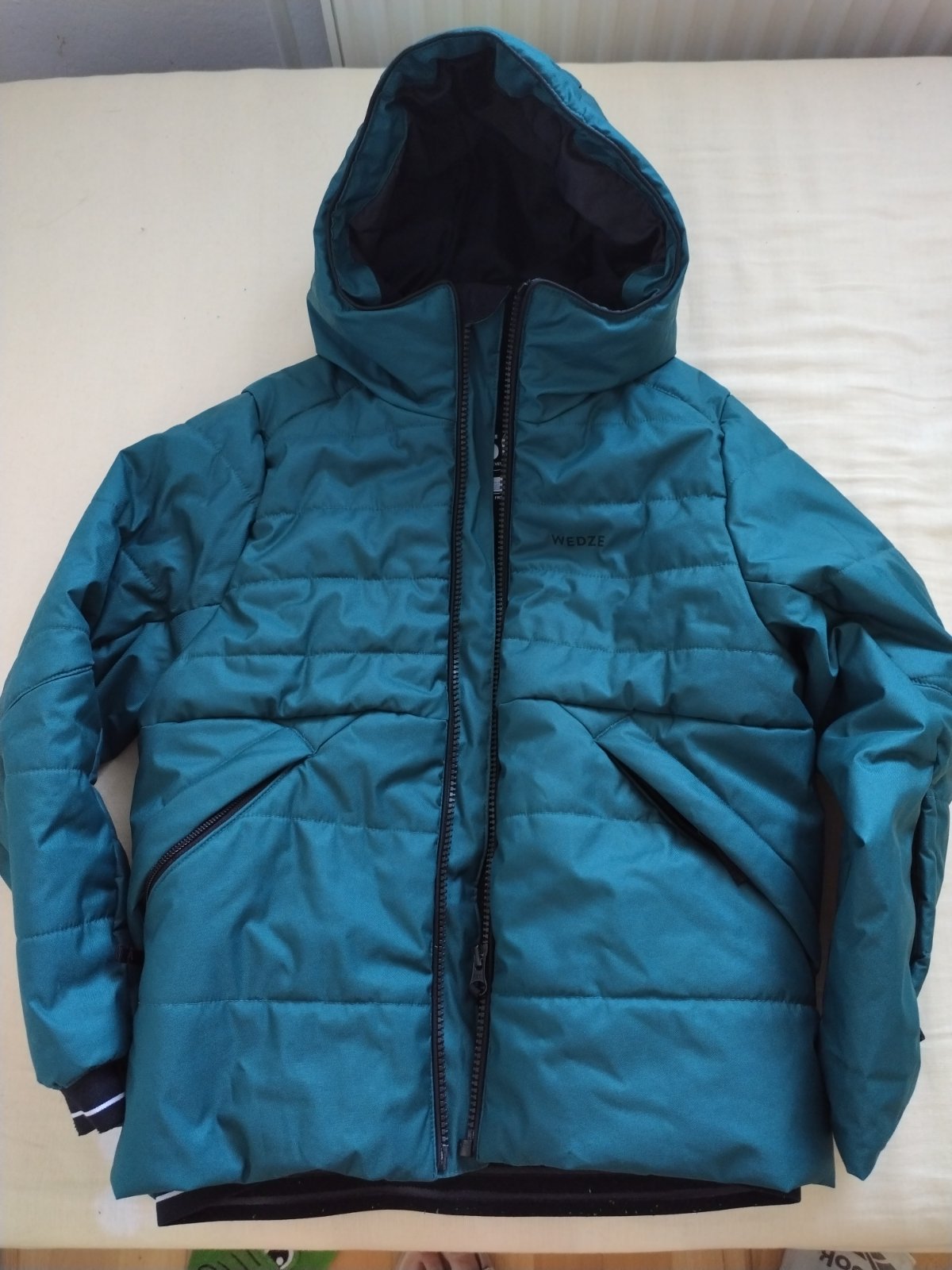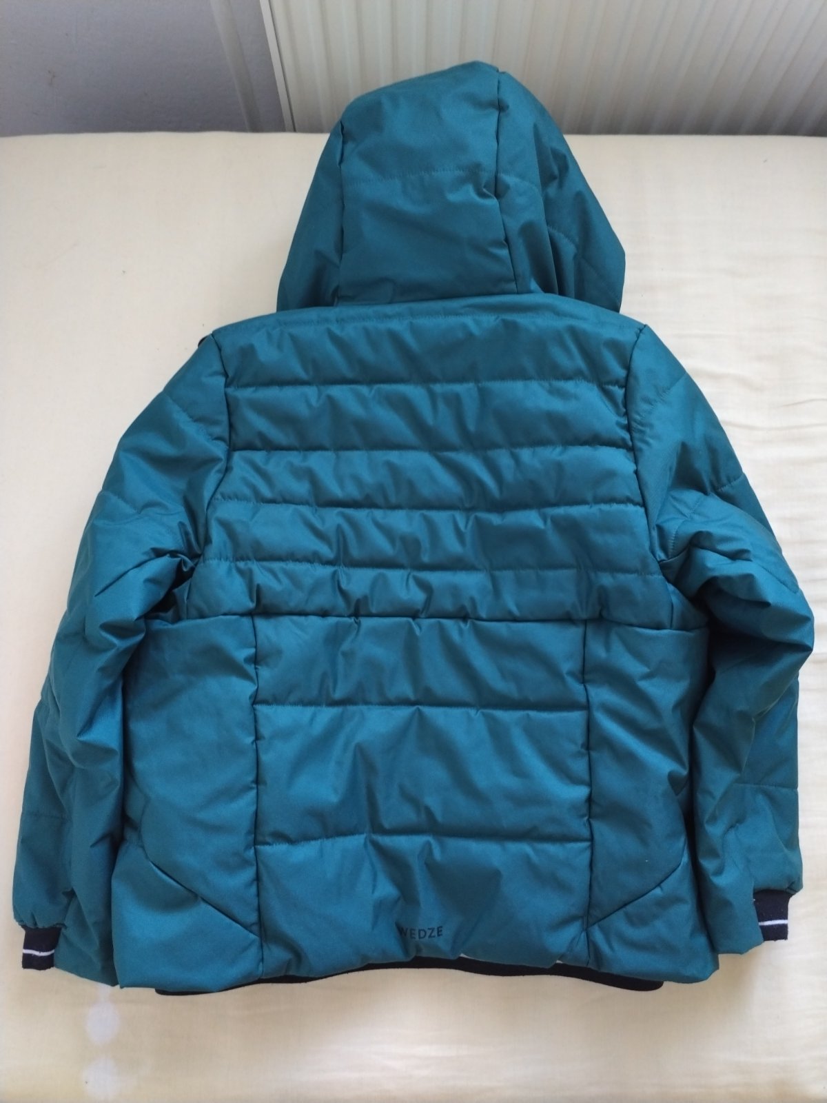 Lyžiarská nepremokavá bunda, vhodná na zimu, aj do snehu, má pás, kapucňu, v predu 2 vrecká na zips. Jedno vrecko na rukáve. Nie je uvedená veľkosť, ale asi by to bola v.128 na dieťa 5-6 ročné.