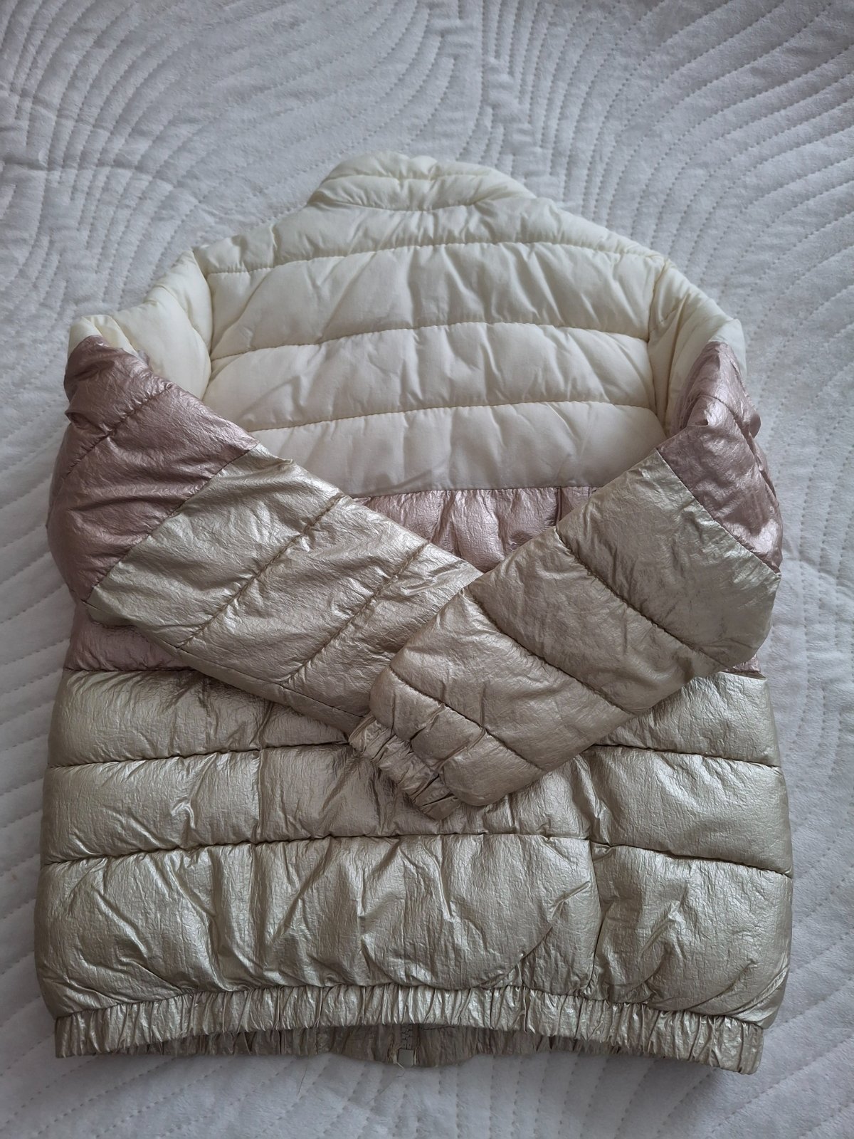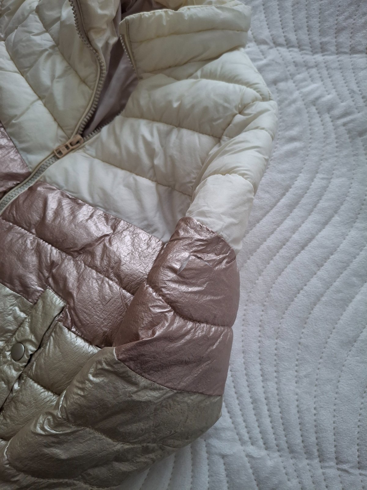 Bunda vhodná na obdobie jar/jeseň, farba: bielo-ružovo-zlatá. Má jedinú chybičku (viď foto) - na ľavom rukáve je trochu zatrhnutá, zohľadnené v cene.