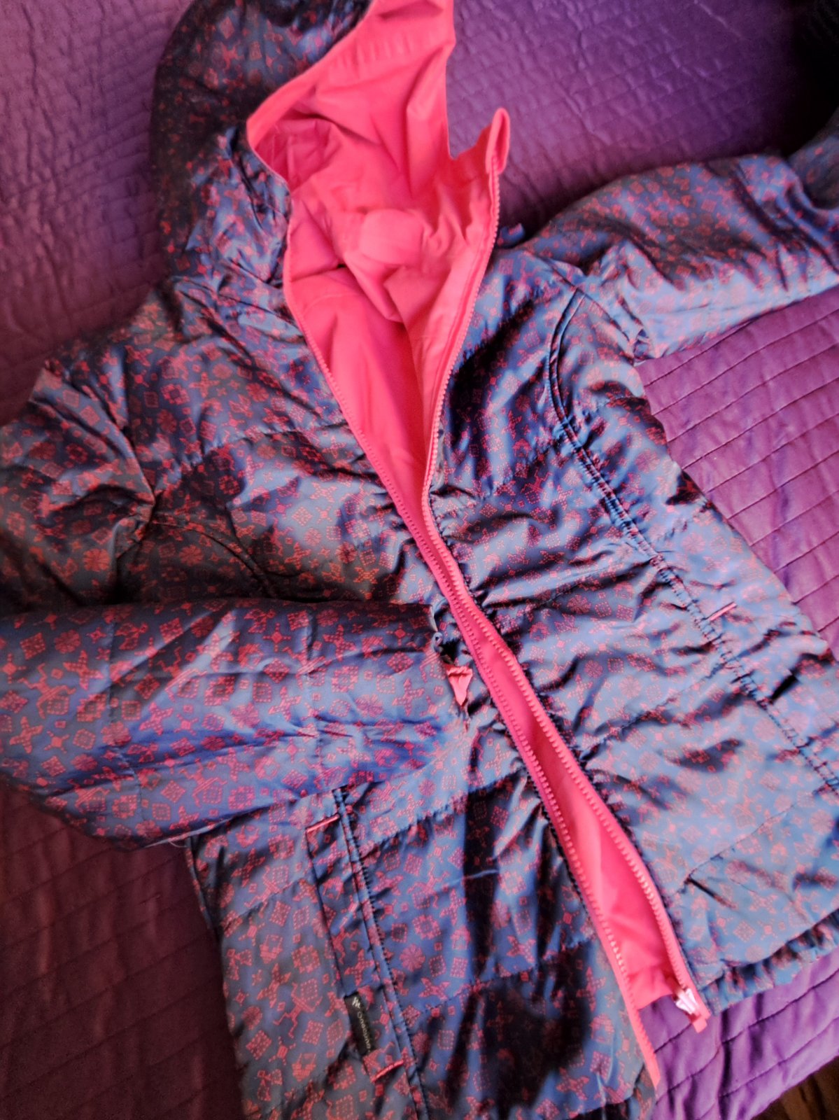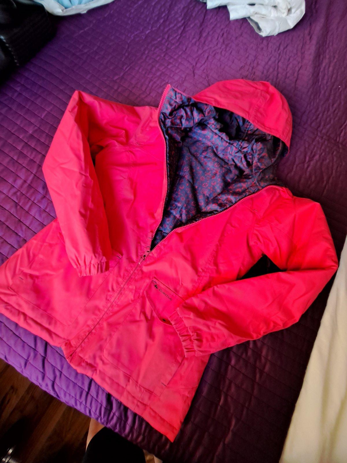 Predam obojstrannu vodeodolnu dievcensku bundu na 12 rokov, sytoruzova alebo fialova so vzorom. S kapucou.