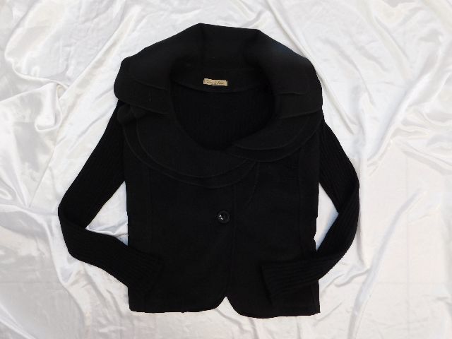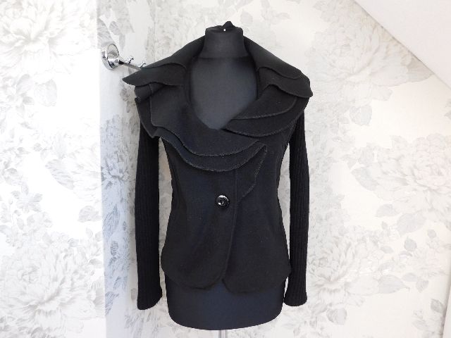 Luxusny trendy štylovy blejzer,čietrnej farby,pletene rukavy a zadny diel.70=polyester,28=viskoua,2%elastan.super stav.