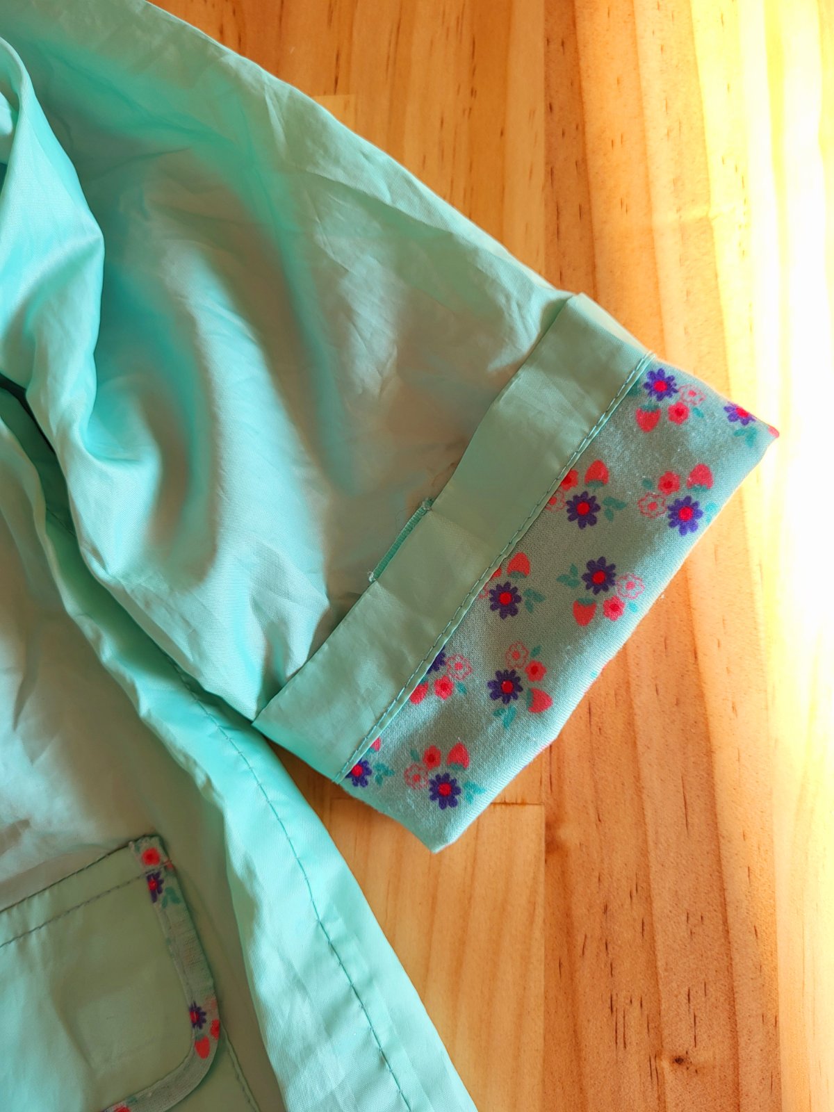 veľmi dobrý stav, originálna, veľmi pekná, s reflexiou, šuštiaková, predné vačky s príklopom na suchý zips, rukávy s ohnutím na suchý zips, na príklope zipsu našité rúžové drevené gombíky v tvare kvetinky, zapínanie na zips, jemná potlač Peter Rabbit, pošlem buď poštou alebo packetou