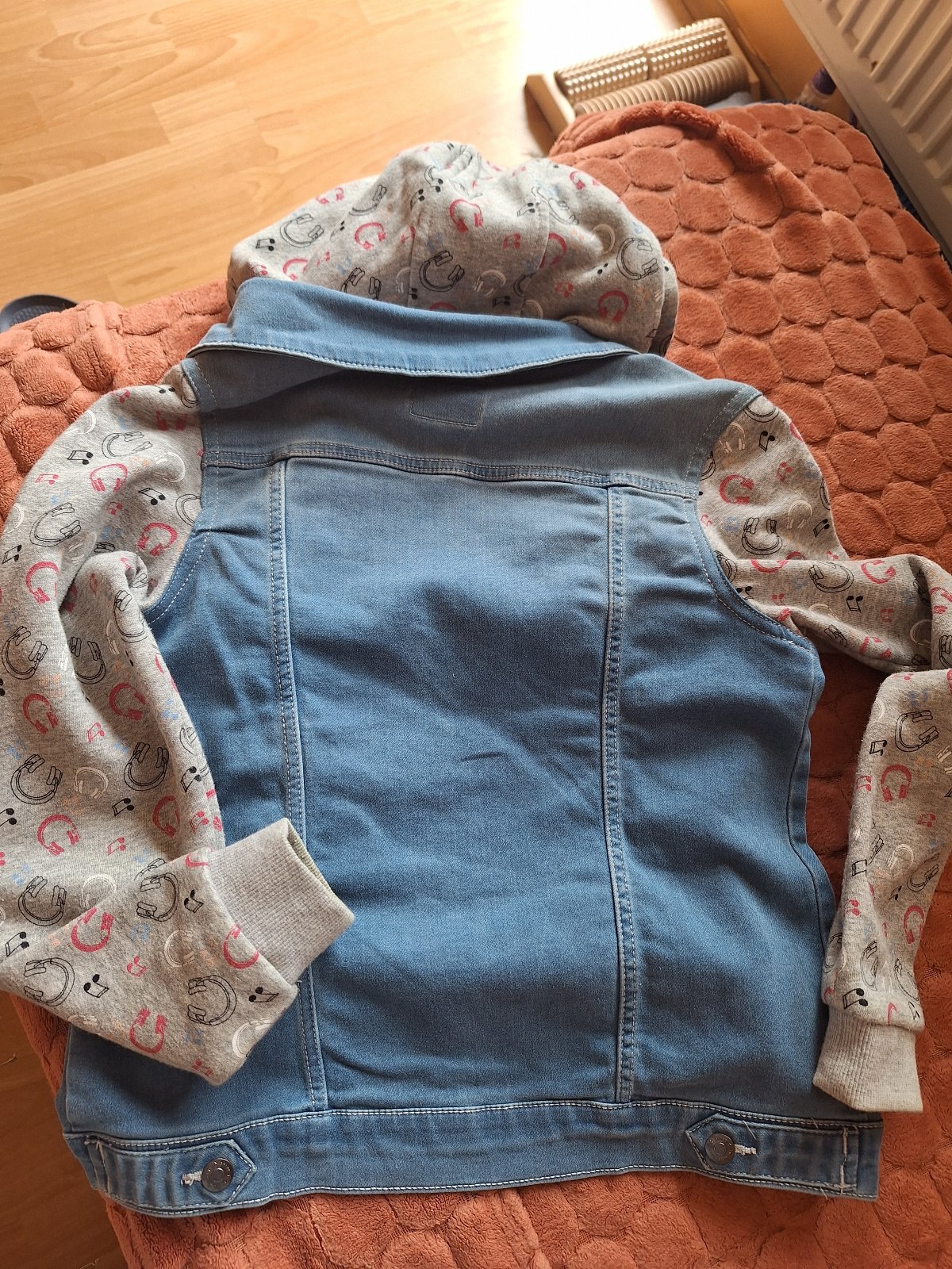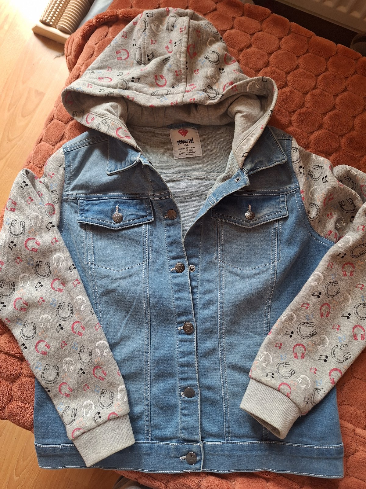 Predám dievčenskú riflovú bundičku, je v kombinácii s mikinovými rukávmi a mikinovou kapucňou, zapínanie na cvoky, prsné vrecká na cvoky, super stav, veľ.158, strih sa zdá menší, píšem aj miery : šírka cez prsia pod pazuchami 43cm., dĺžka od chrbátika od krku 49cm., dĺžka rukáva od krku 62,5cm., dĺžka rukáva od pleca 54cm., cena 8. , € aj s poštovným