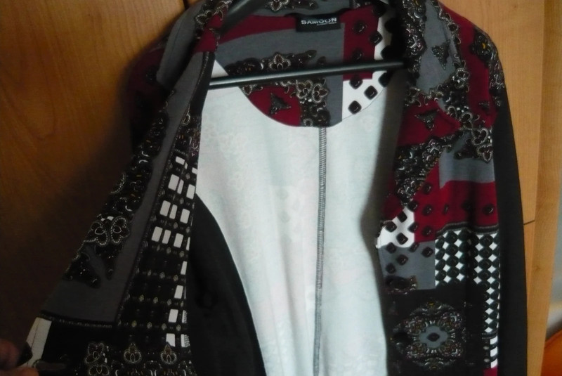 dámske zaujímavé štýlové sako , materiál ako pevná tričkovina. Značka Samoon by Berry Weber. Veľkosť XL, šírka cez prsia55 cm , dĺžka 72cm . Cena 11 eur