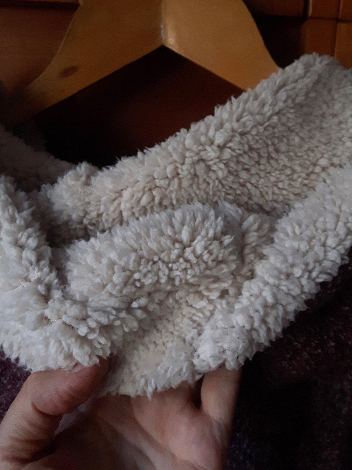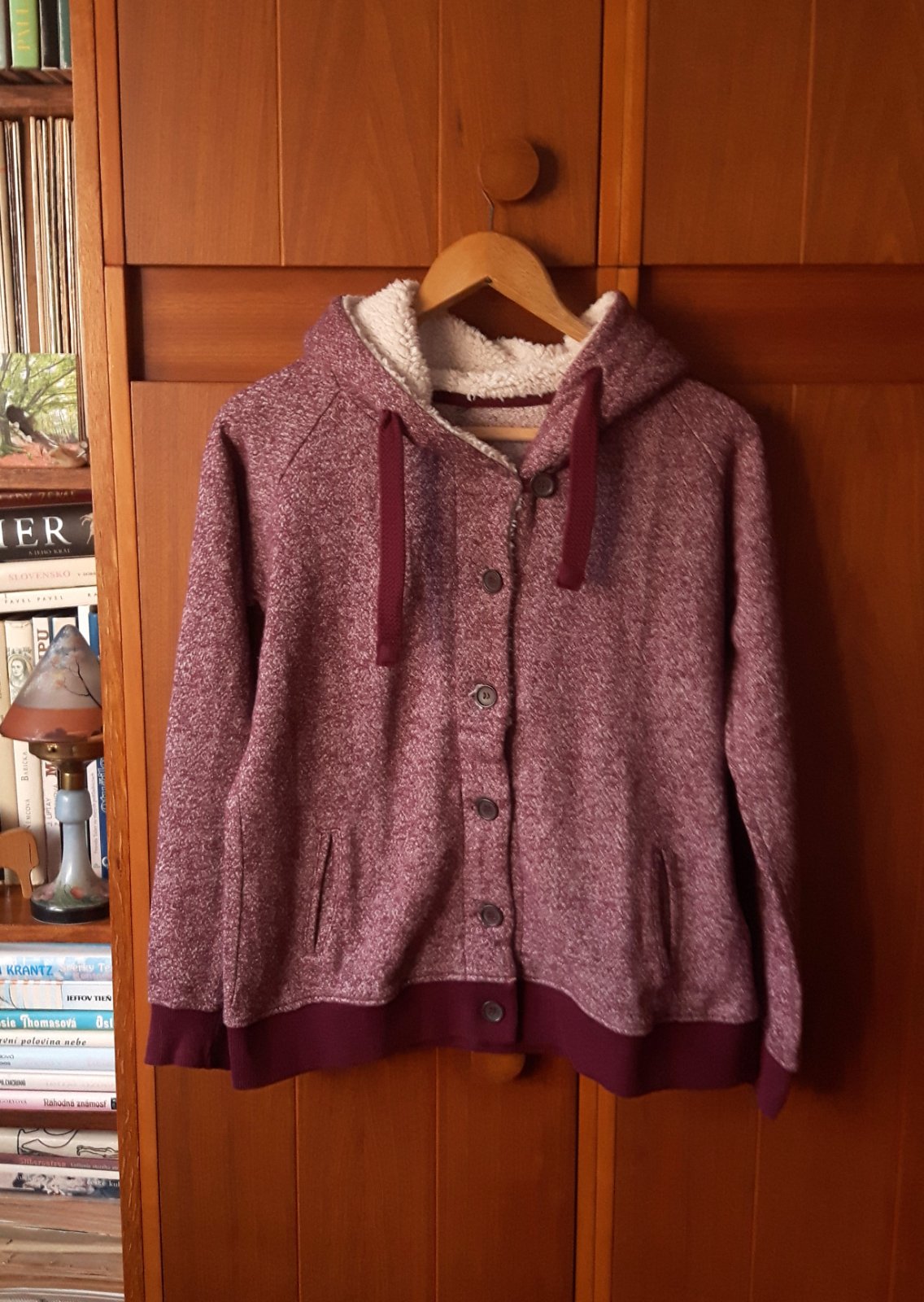 Pekná mikinová bunda vhodná na prechodné obdobie jar/jeseň s mäkučkou kapucňou. Je takej melírovanej vínovej farby, na gombíky, veľkosť L. Dĺžka je 60 cm a šírka pod pazuchami 49 cm. Bez poškodení!