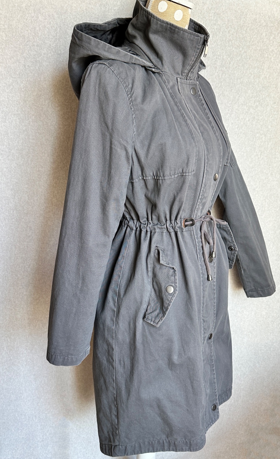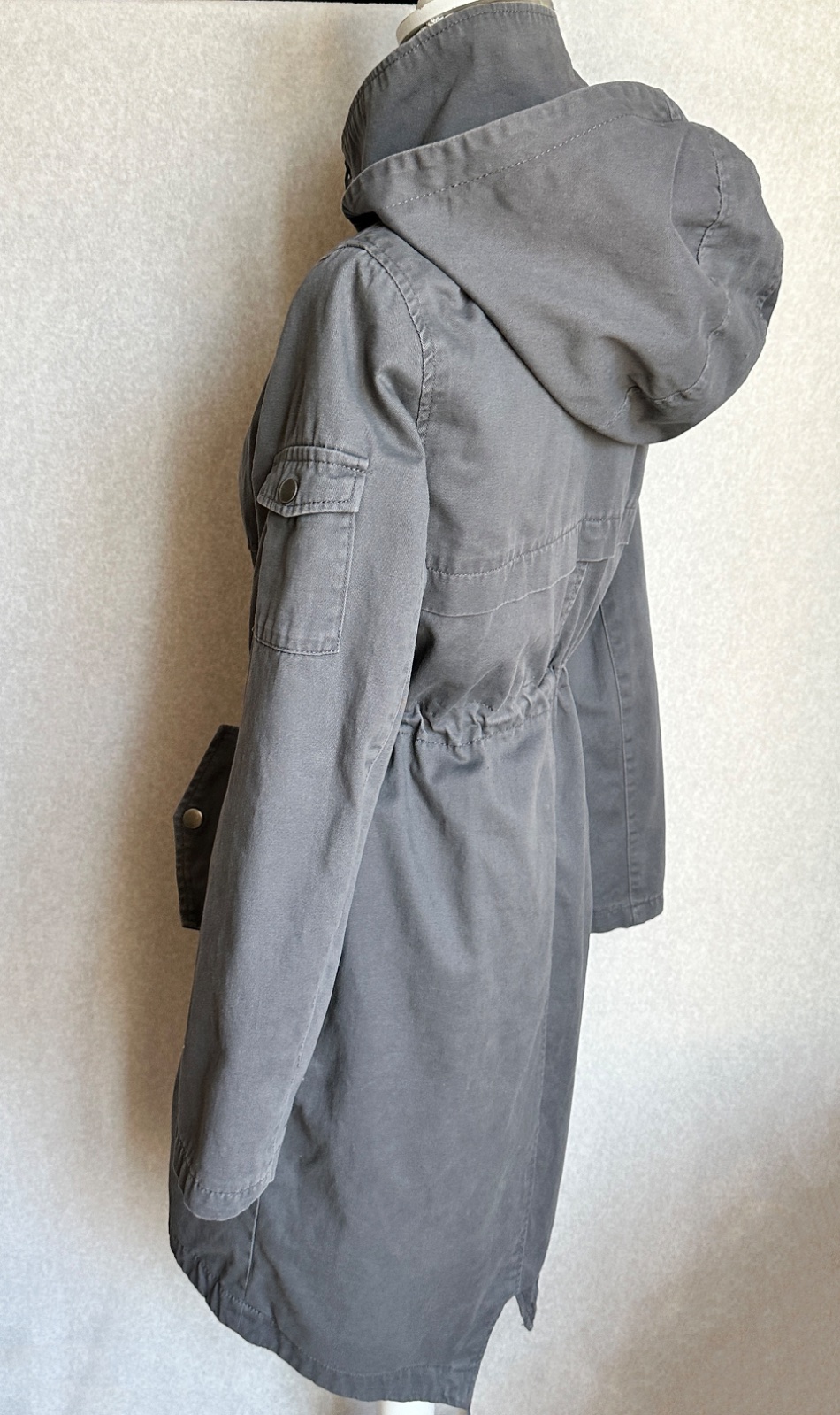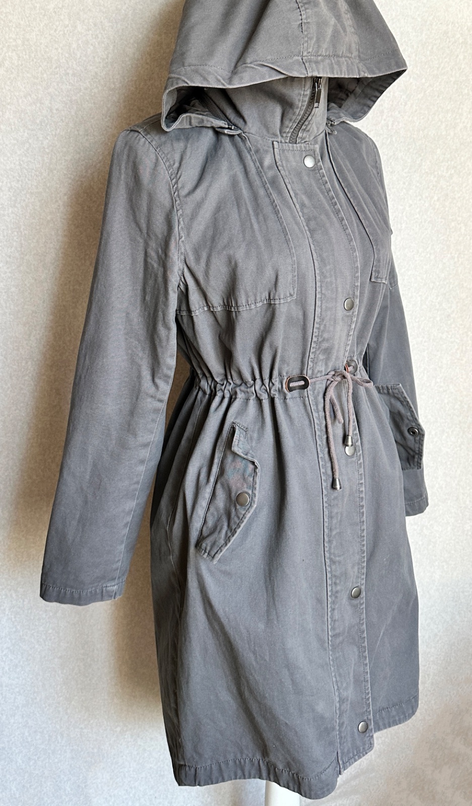 Príjemná bunda v matnej sivej farbe, mäkký pohodlný materiál, plne podšitá. Bunda má uško na zavesenie, odopínaciu kapucňu (na zips), zapínanie na zips s prekrytím na kovové cvokové gombíky. Po bokoch sú vrecká, v páse uťahovacia šnúrka. Na ľavom rukáve je v hornej časti malé vrecko. Zadný diel je predĺžený, v strede je rozparok. Materiál je mäkká bavlna (100%).