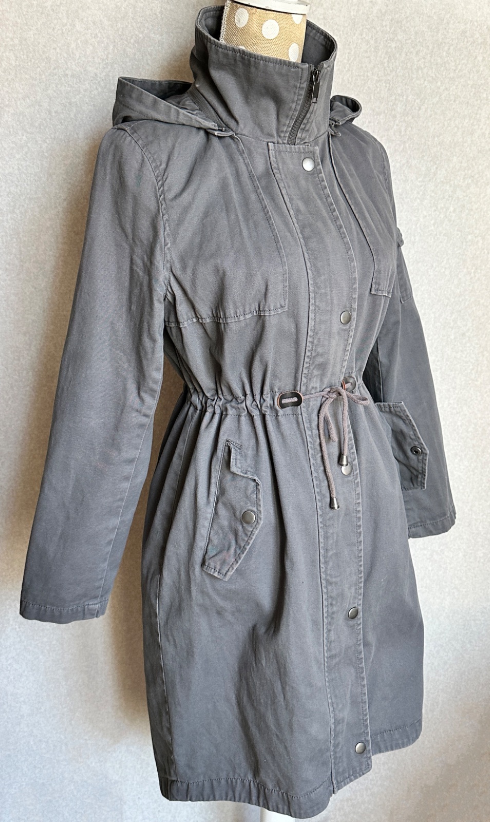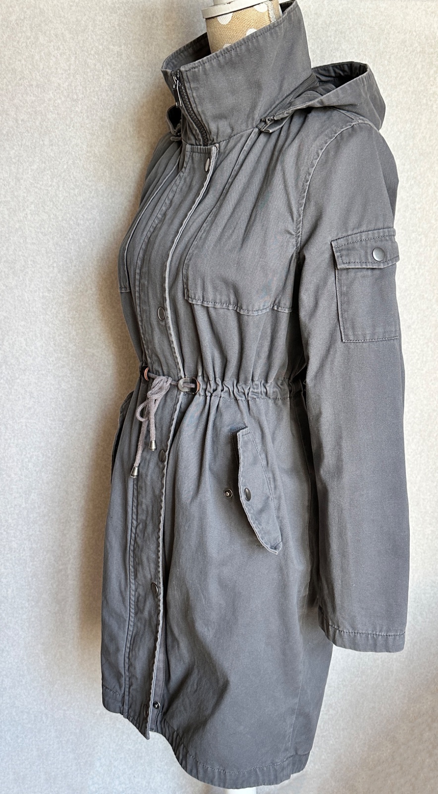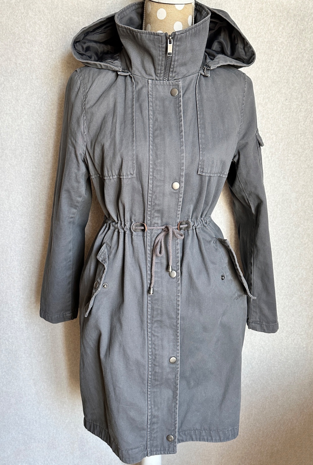 Príjemná bunda v matnej sivej farbe, mäkký pohodlný materiál, plne podšitá. Bunda má uško na zavesenie, odopínaciu kapucňu (na zips), zapínanie na zips s prekrytím na kovové cvokové gombíky. Po bokoch sú vrecká, v páse uťahovacia šnúrka. Na ľavom rukáve je v hornej časti malé vrecko. Zadný diel je predĺžený, v strede je rozparok. Materiál je mäkká bavlna (100%).