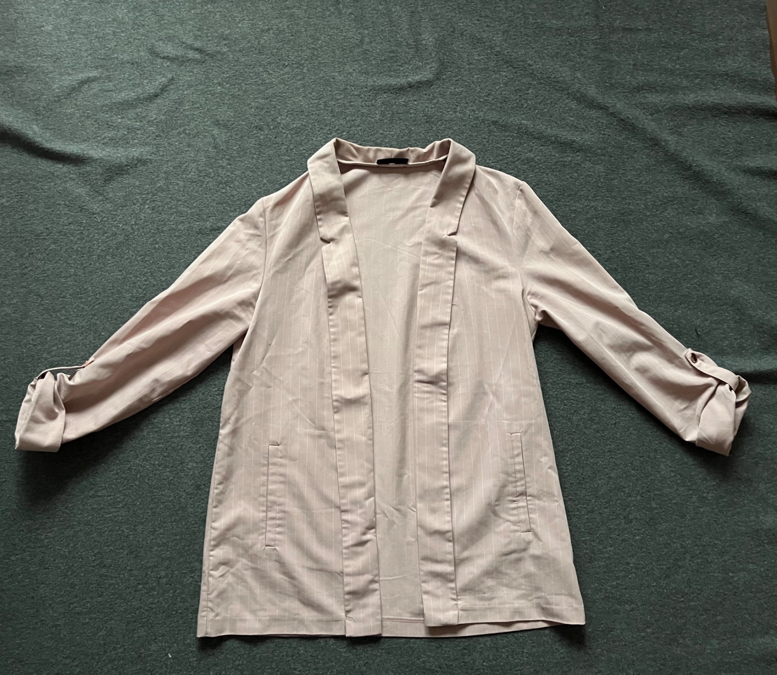 Asi 2x oblečené tenšie sako. Ako nové. Veľkosť L. Dĺžka cca 70cm, šírka pod pazuchou 2x50cm, dĺžka rukáva 63,5cm.