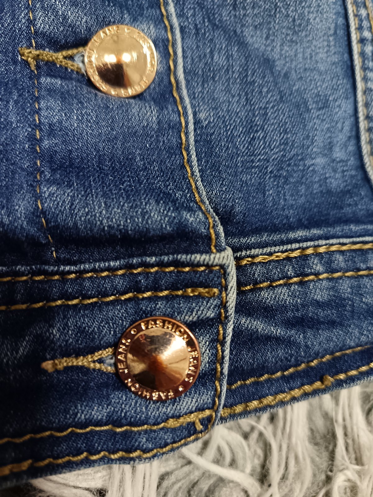 Predám iba vyskúšanú rifľovú bundu zn. EVENT s hnedou kožušinou, ktorá sa nedá odopnúť. Celková dĺžka bundy je 56,5 cm, prsia 62,5 cm a dĺžka rukávov je 62 cm od ramien. Cena je 10 eur + poštovné