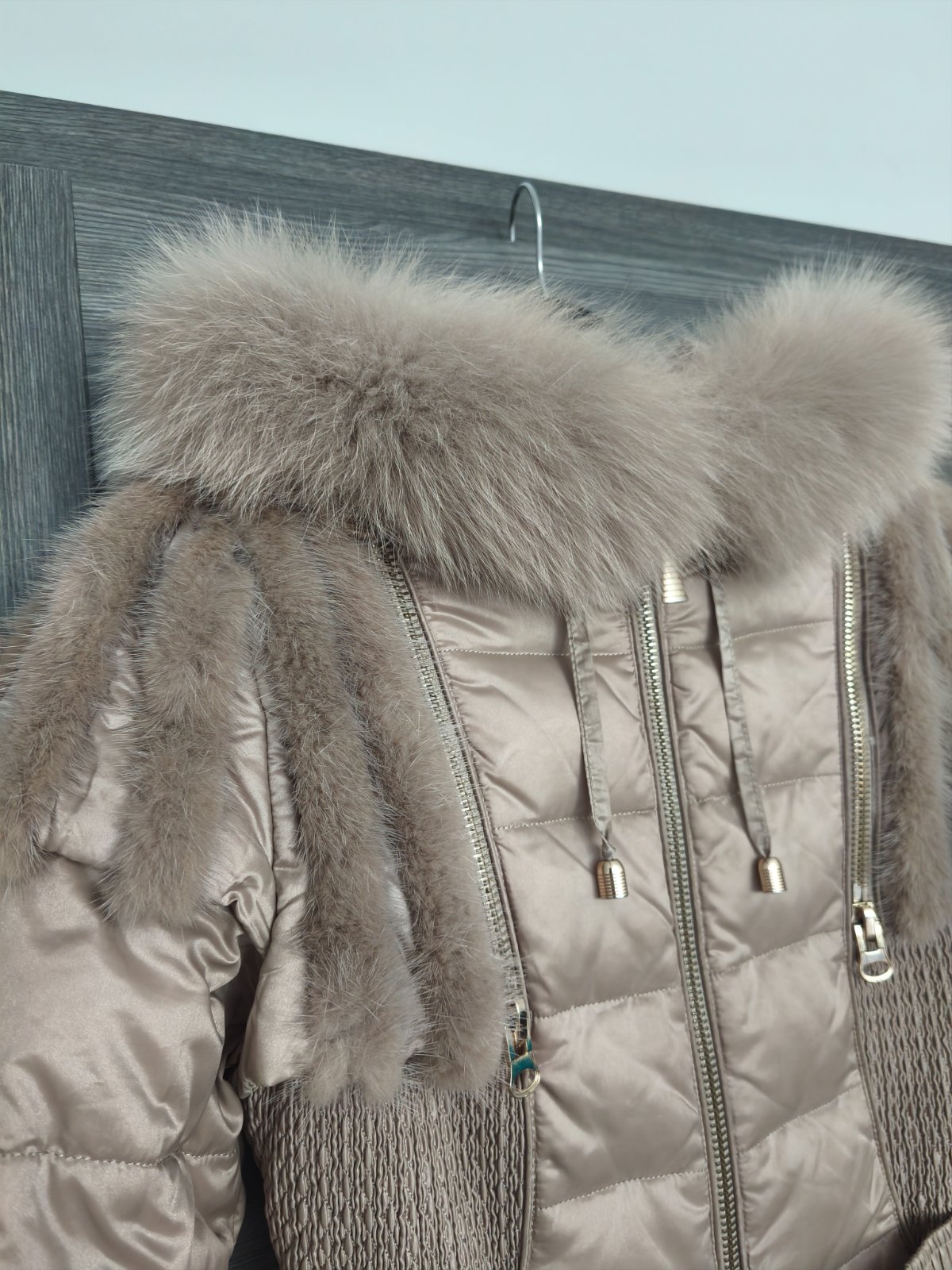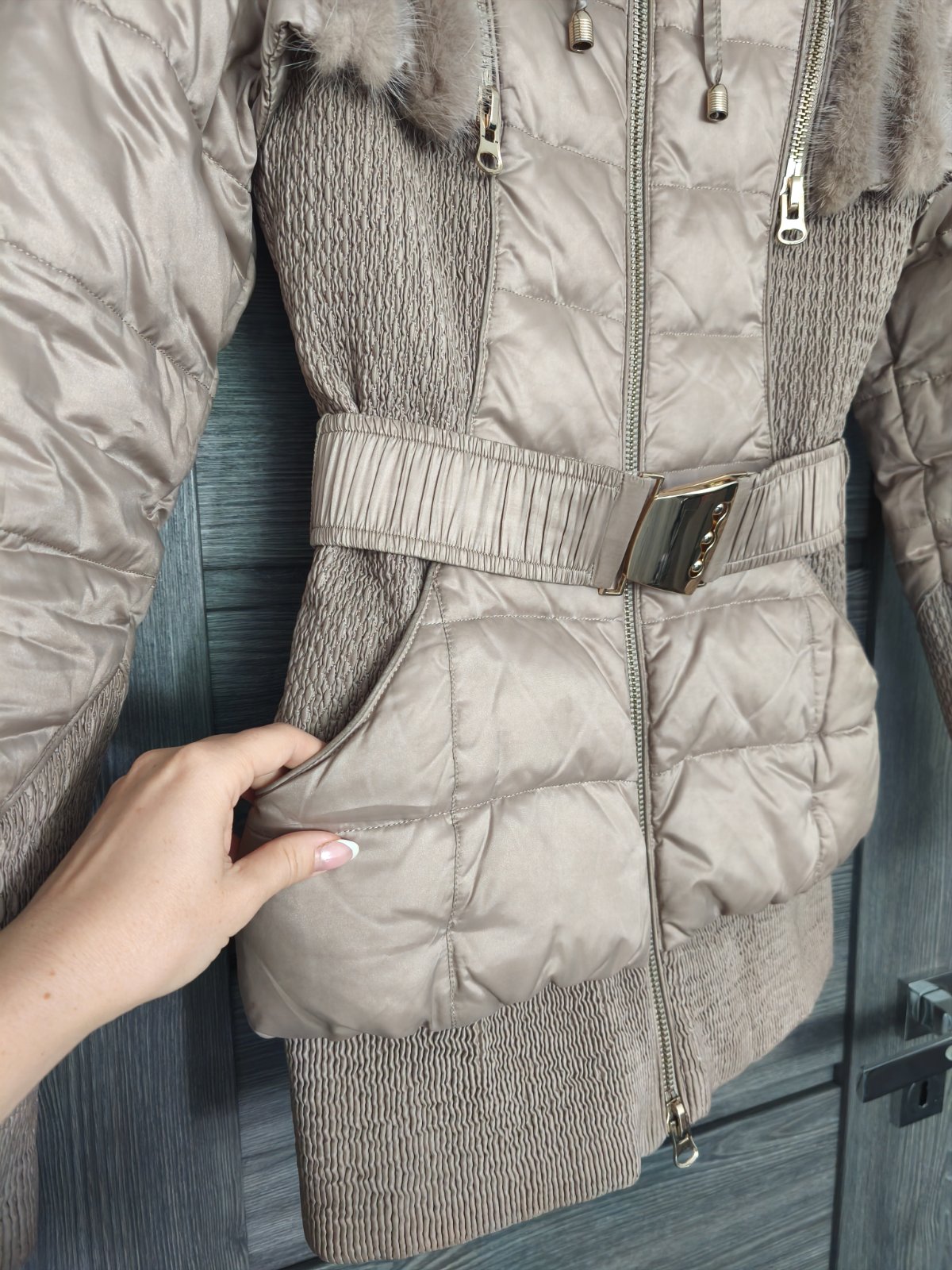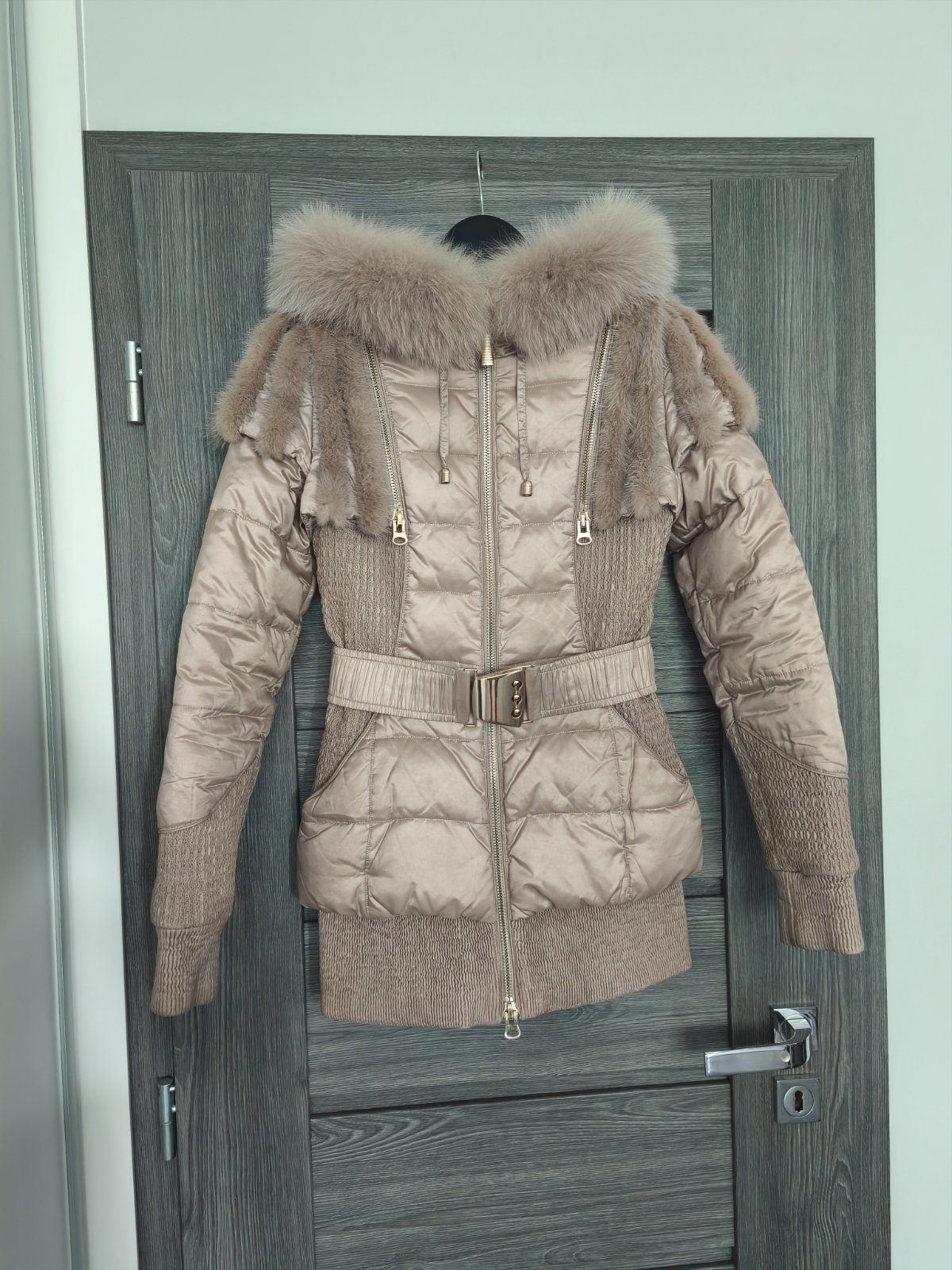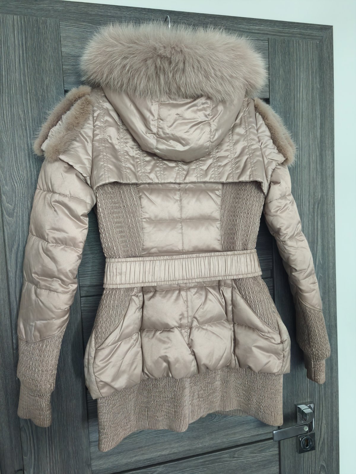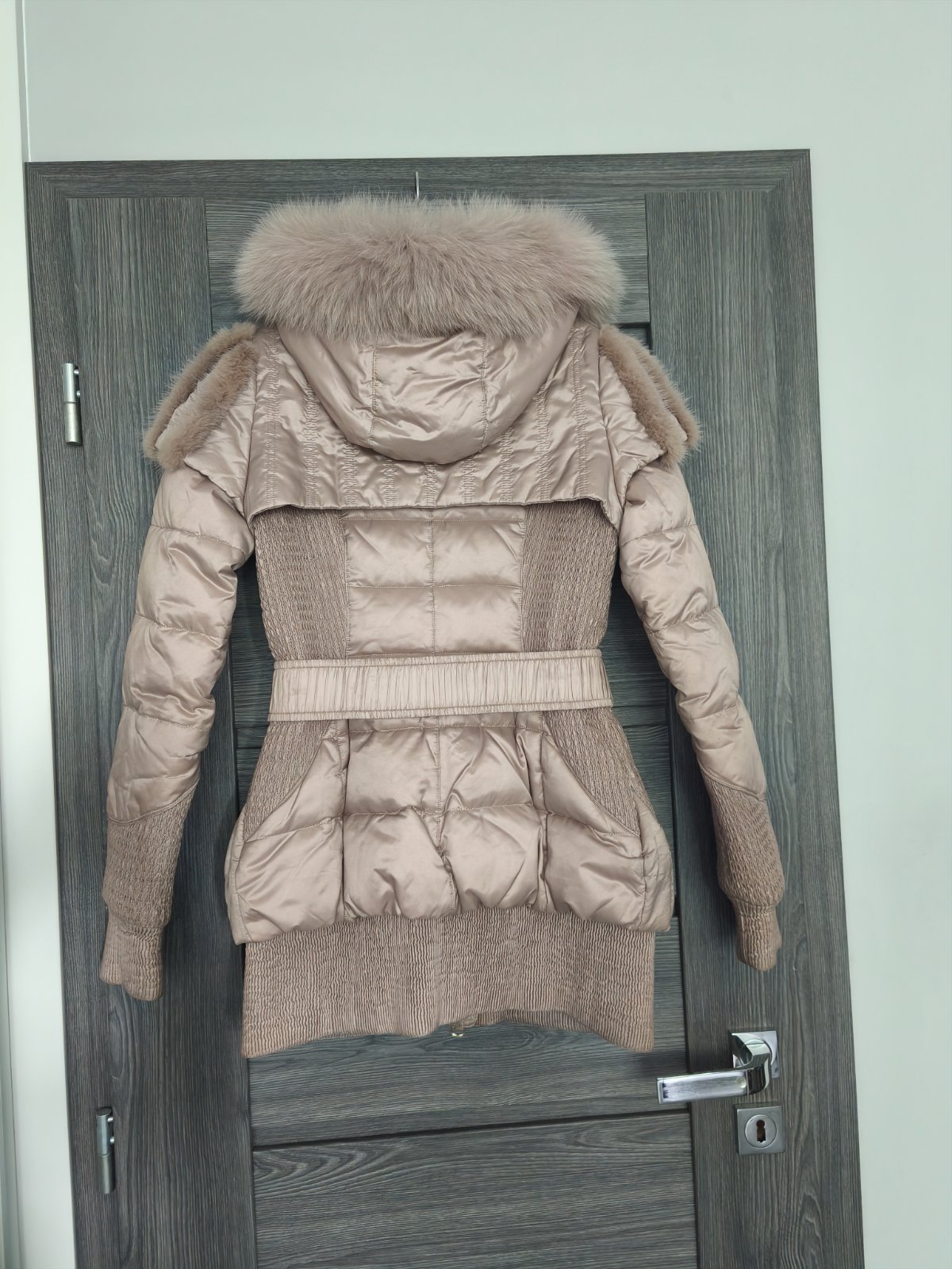Nadherna paperova nesmierne tepla bunda luxusnej znacky Peercat s pravou kozusinkou na kapucni liska na pleciach prava norka. Vdaka opasku krasne tvaruje postavu je obtiahnuta a neprefuka vhodna aj do tuhej zimy. Farba je pekna bezovo-hneda az malicko medena. Spodny patent krasne drzi je elasticky obtiahnuty. Najlepsie sedi na XS/S. Nosena na striedacku s vela inymi v top stave ako nova. Jedine na zlatej pracke je malicko skrabancov ktore pri noseni nie su vobec vidiet len detailne. Povodna cena bola velmi vysoka.