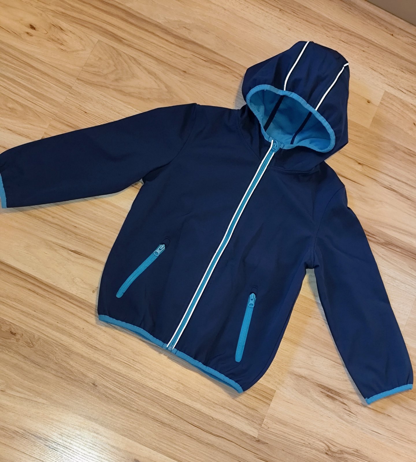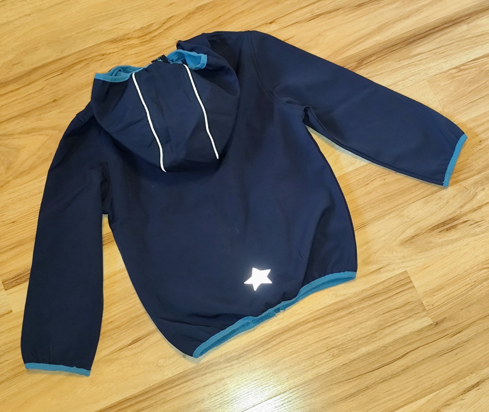 Softshalova vetrovka. Kapucňa sa dá odzipsovať. Malý fliačik vpredu pri zipse. Možno ide dole neskúšala som. Vzadu na vetrovka odrazko sa v jednom rohu pára. Všetko vidieť na fotkách.