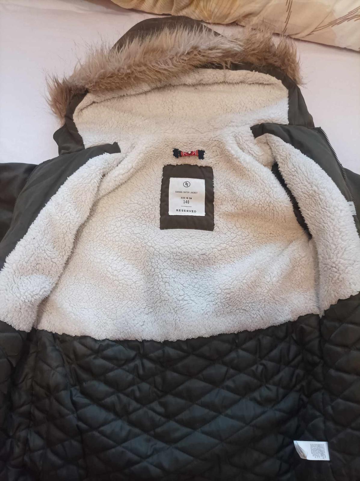 Predám velmi teplú bundu zn. Reserved, velkost 140. Bunda je hnedej farby vnútri je bledo barencekova umelá kožušinka tak isto aj na kapuce je kozusinovy lem. Bunda je na zips aj cvoky, v pase sa da regulovat šnúrkou.Ma bočné vačky so strieškou na cvok. Pôvodne stale cez 40€.