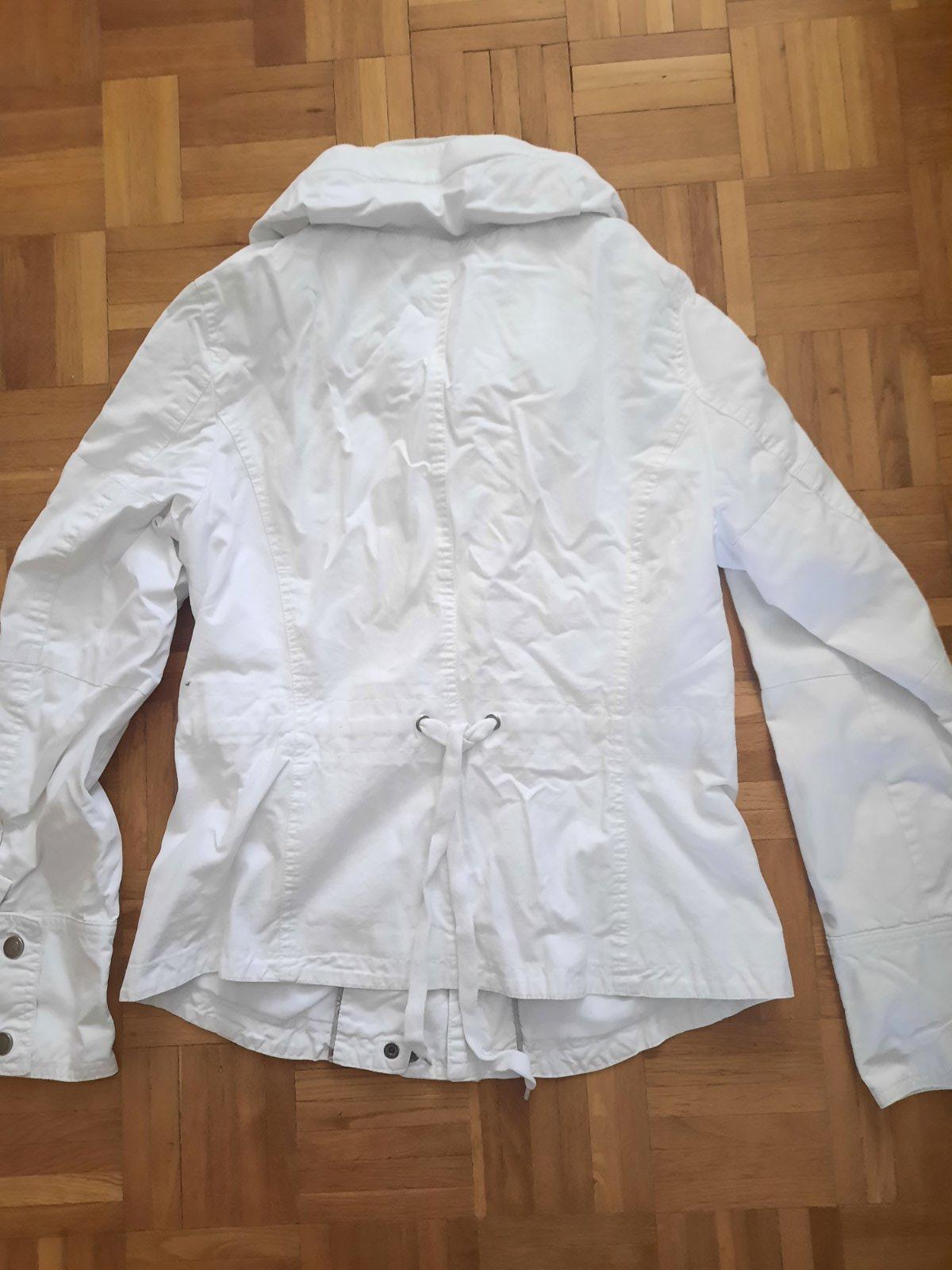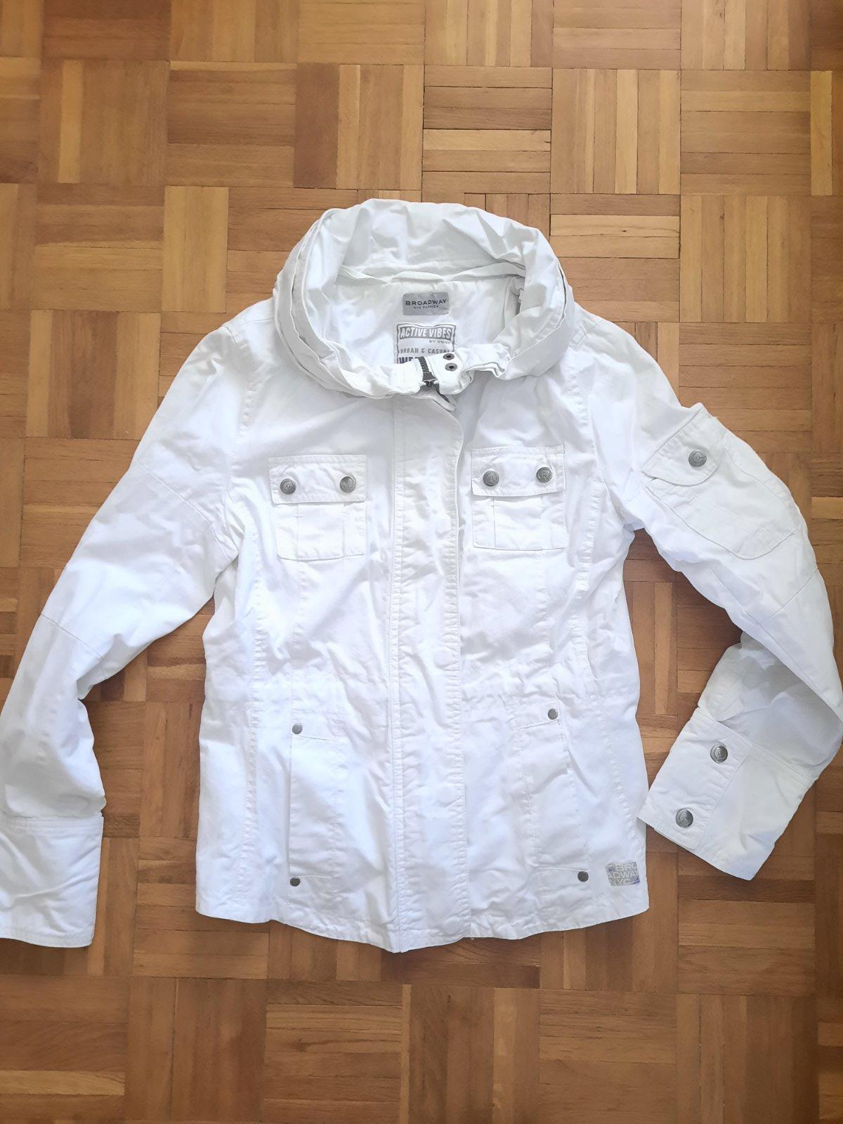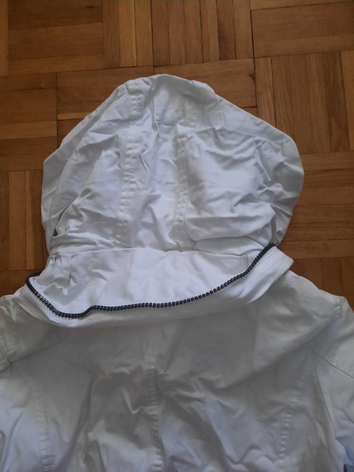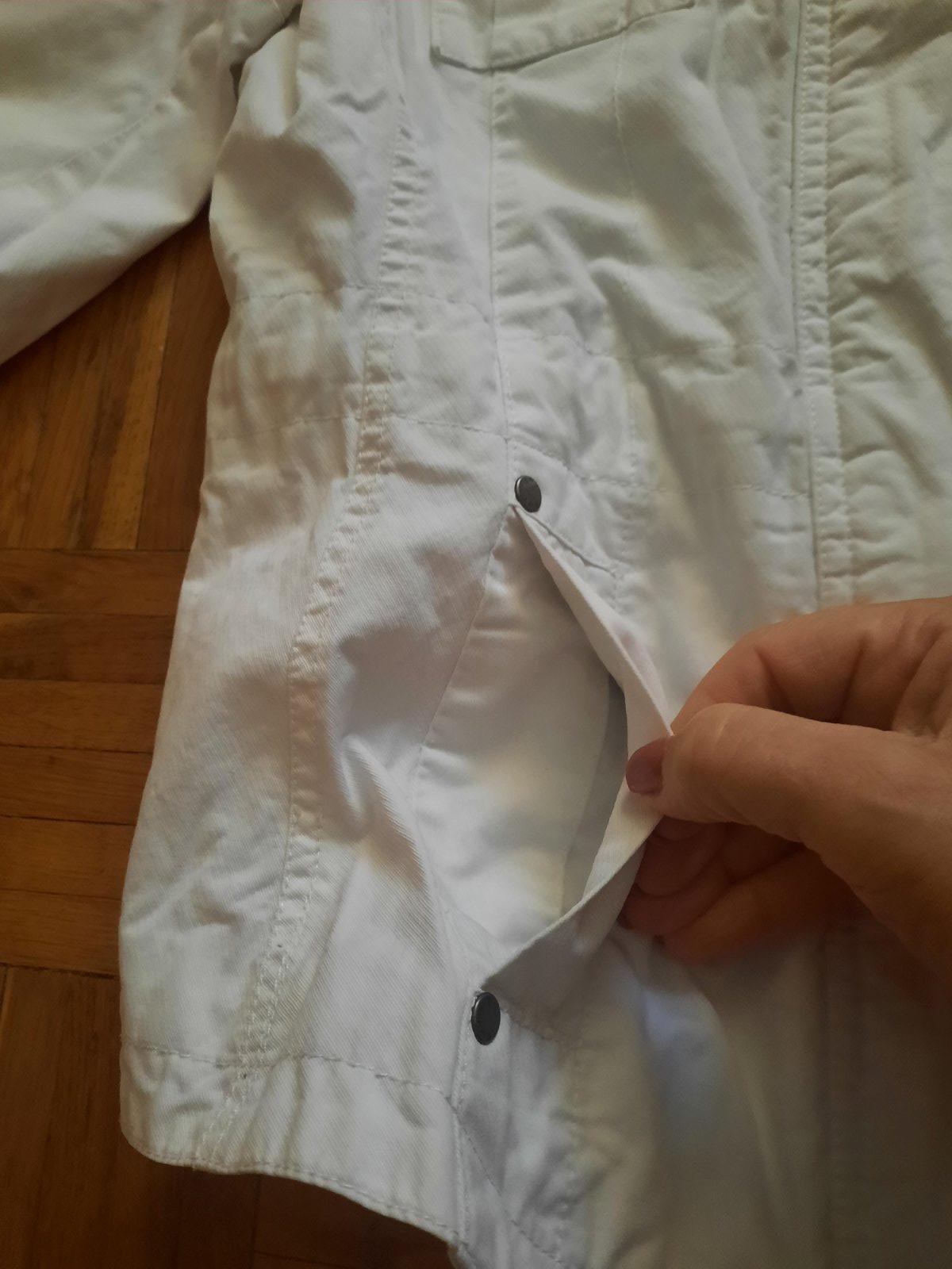 Zaujímavá prechodná bunda na zips+ zapínanie na nit. Vpredu je viac vreciek+ 1 aj na rukáve. Pod golierom je schovaná kapucňa. V páse je šnúrka, ktorá sa dá stiahnuť podľa potreby.