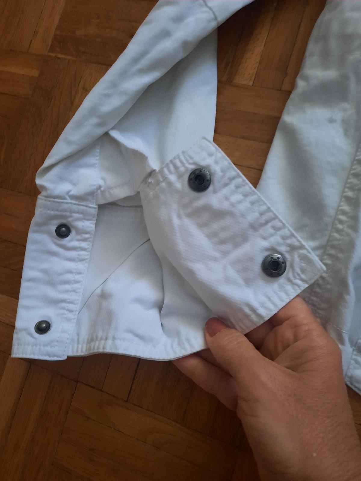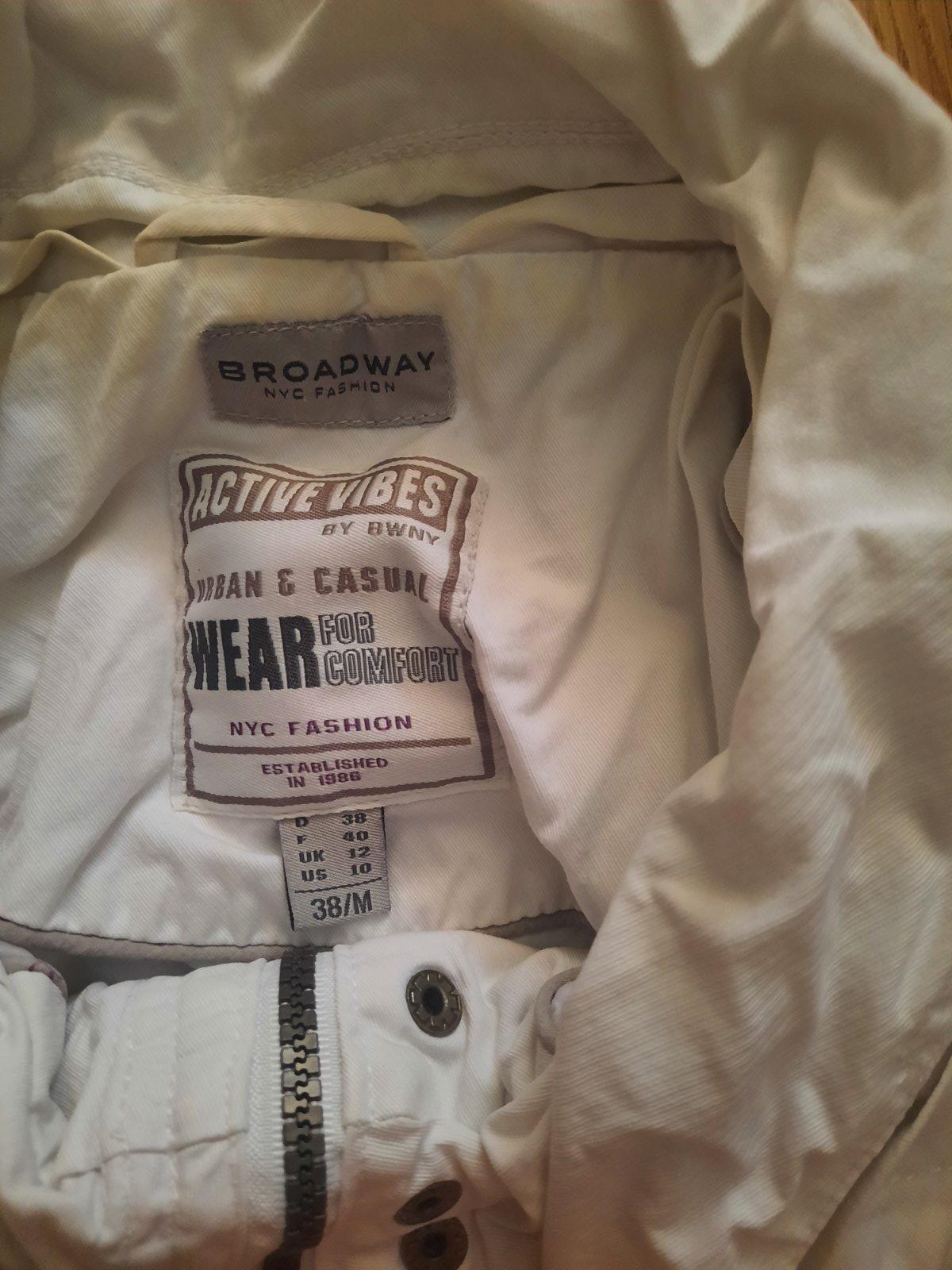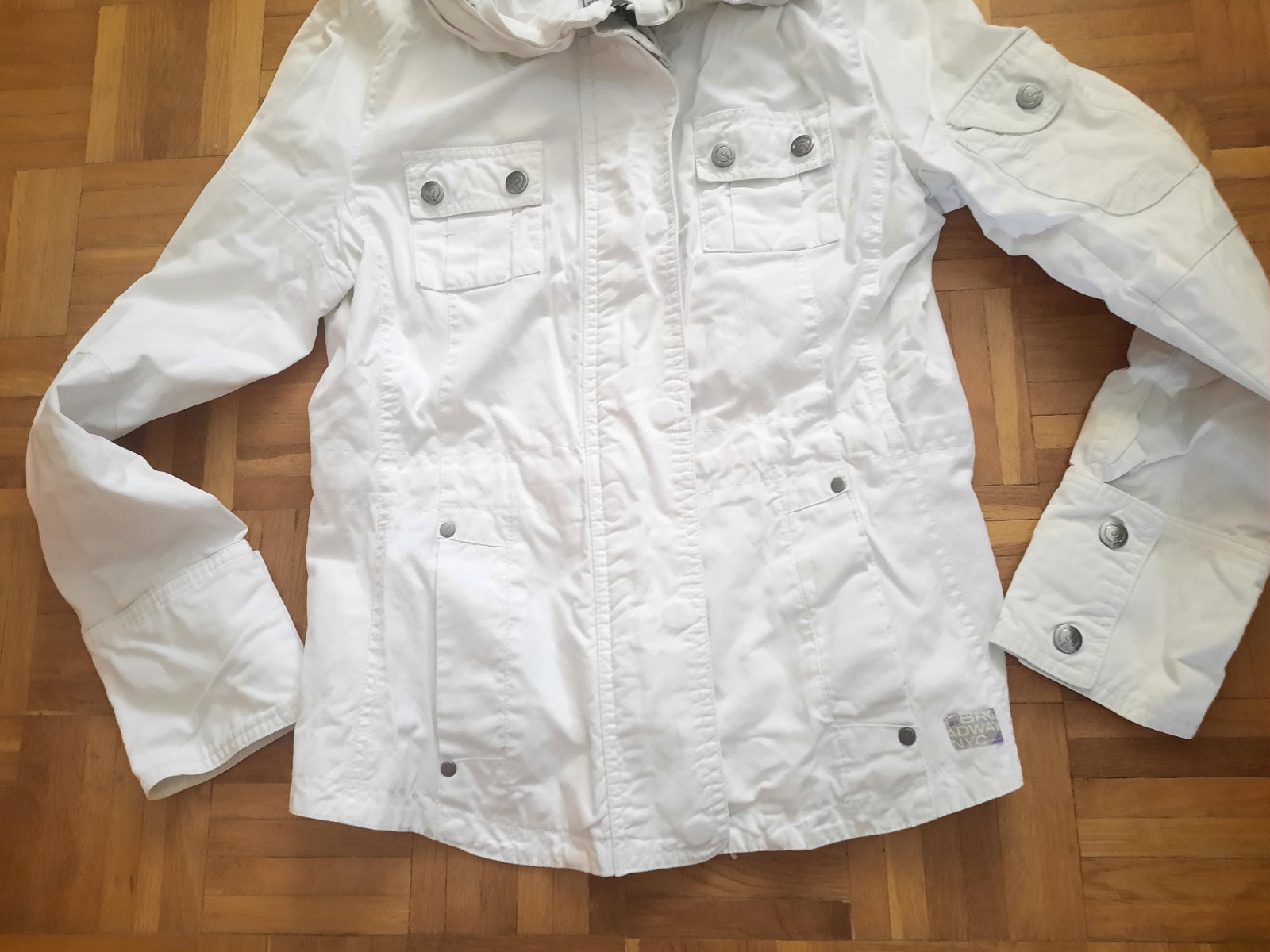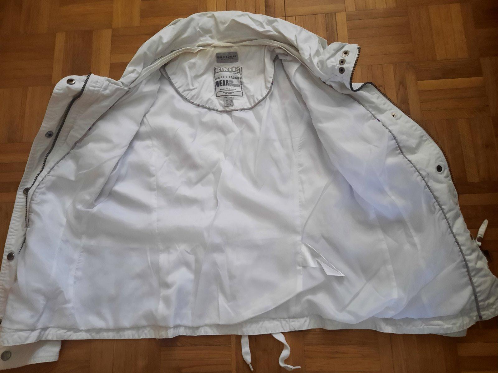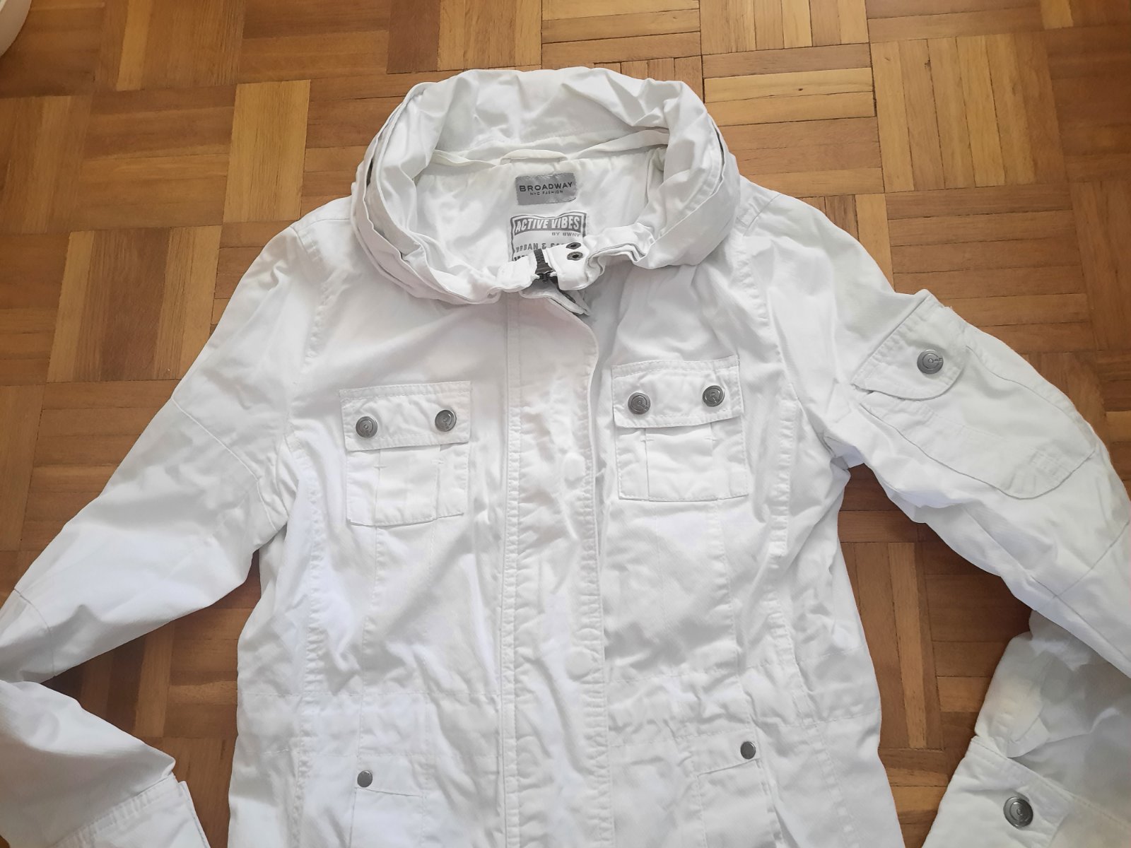 Zaujímavá prechodná bunda na zips+ zapínanie na nit. Vpredu je viac vreciek+ 1 aj na rukáve. Pod golierom je schovaná kapucňa. V páse je šnúrka, ktorá sa dá stiahnuť podľa potreby.