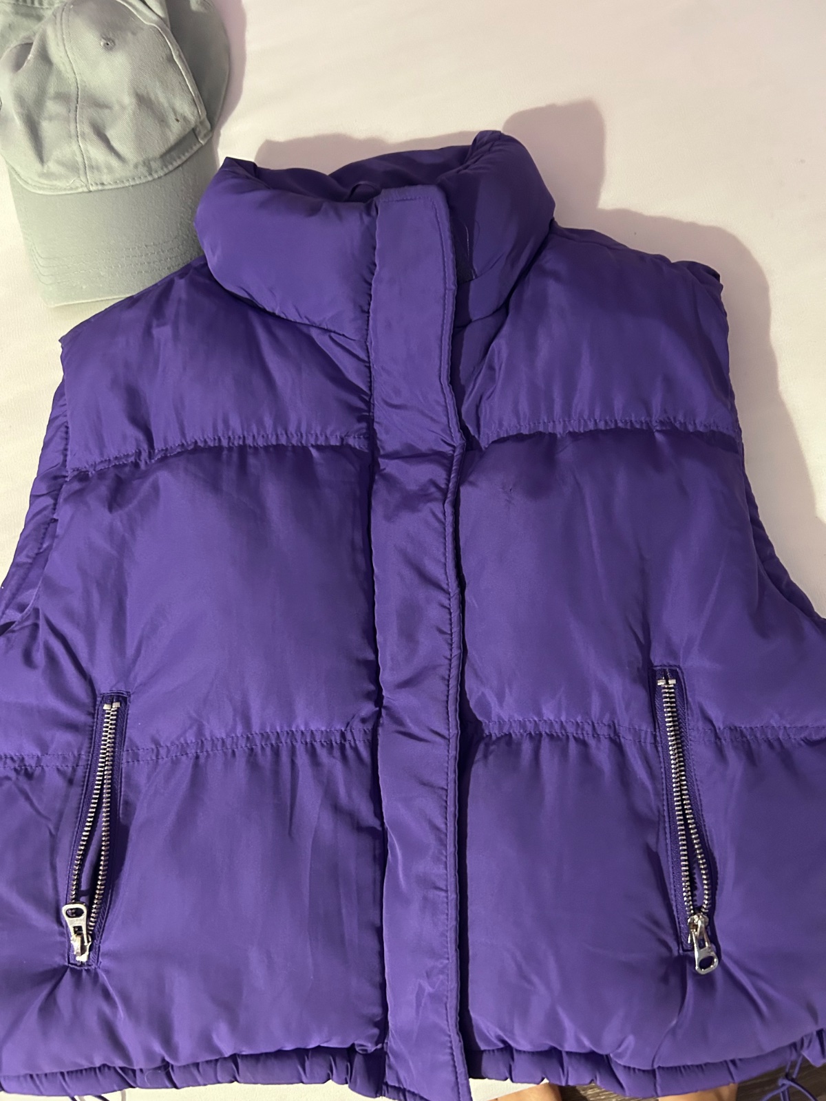 Fialová teplá vesta s kapucňou, kapucňa sa dá odzipsovať, vpredu dva vačky na zips.Vesta málo nosená, ako nová nepoškodená.