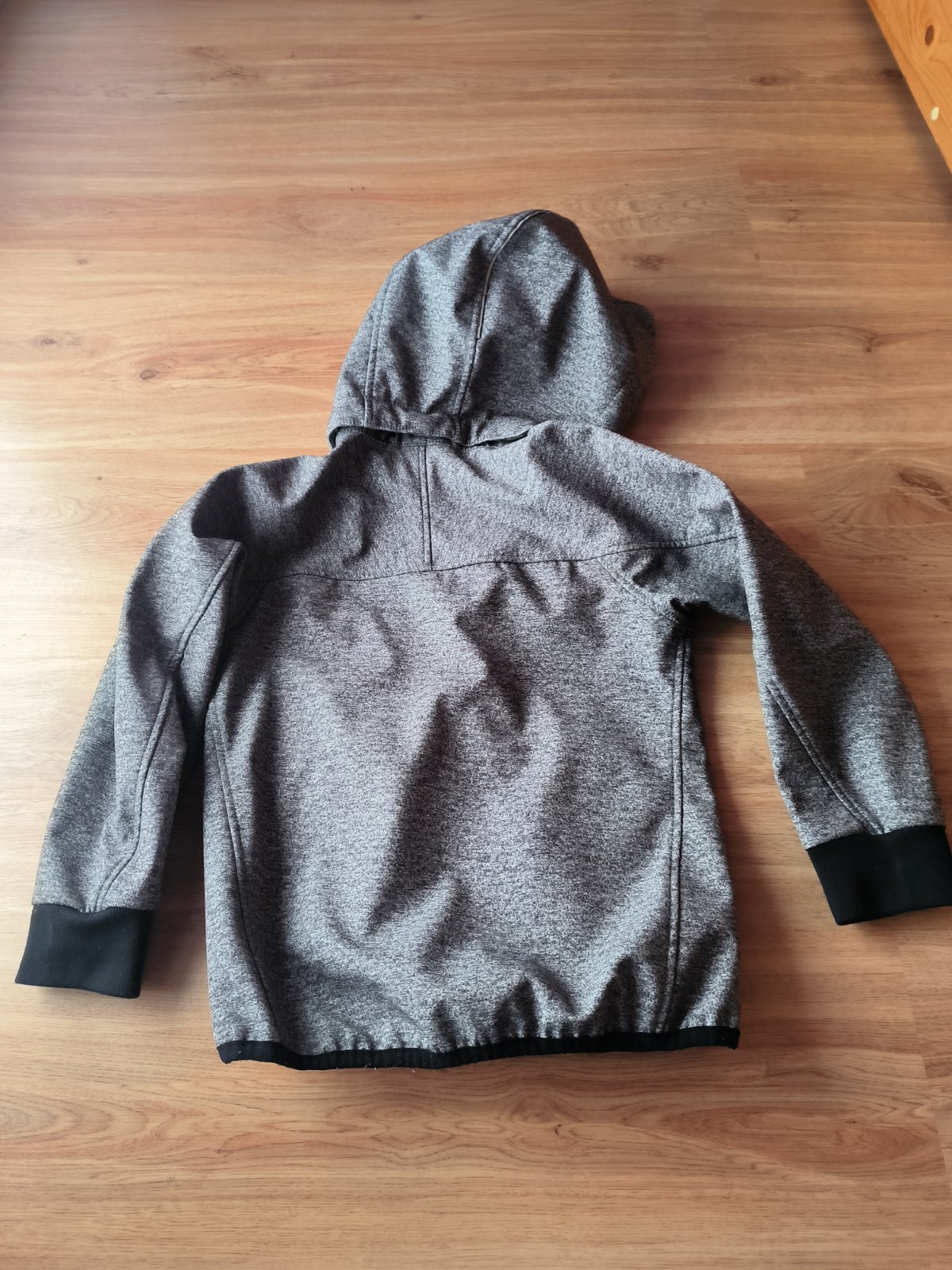 Nie je velmi hruba. Je na zimu, ale nie na velmi chladnu. Ma znamky pouxivania na lemoch rukavov. Stale plne funkcna,s kapucnou.