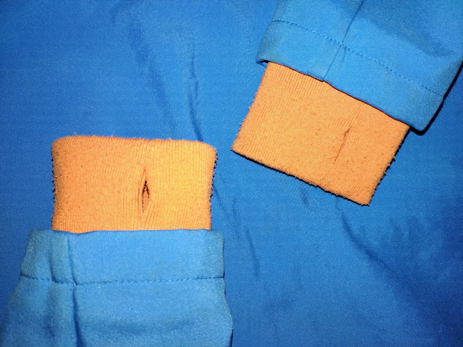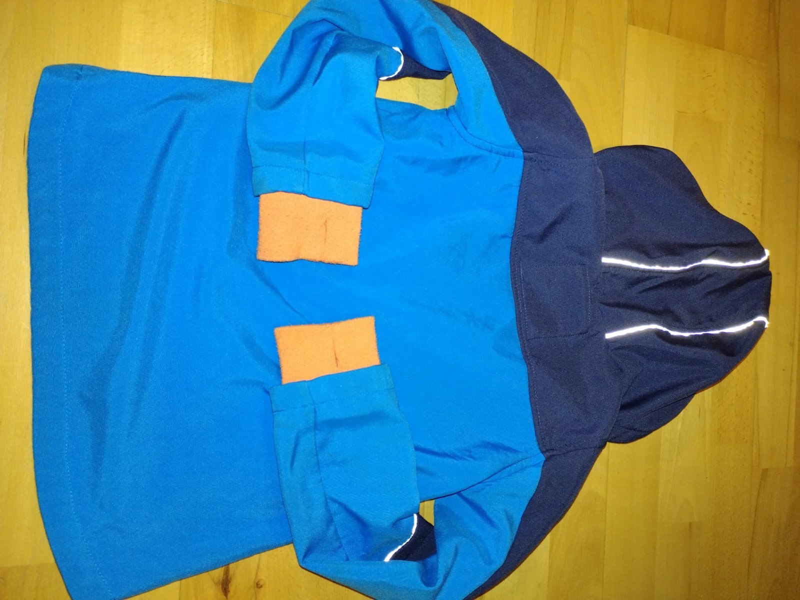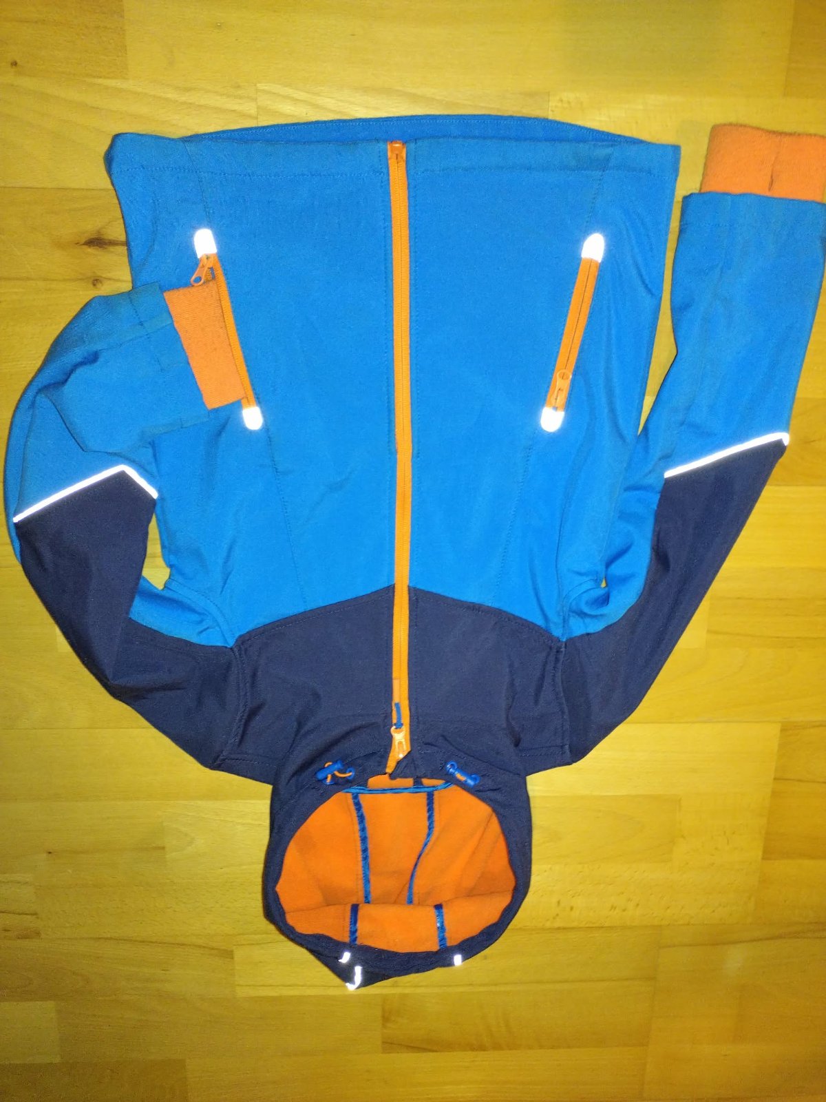 Zachvoalá softshellová bunda, zn. Sinsay, veľ.134, pre chlapcov. Farebná kombinácia modrej a oranžovej, s reflexnými prvkami, kapucňou, s dvomi vreckami a zapínaním na zips. Rukávy majú dierku na palec, na manžetách vidieť mierne opotrebovanie.