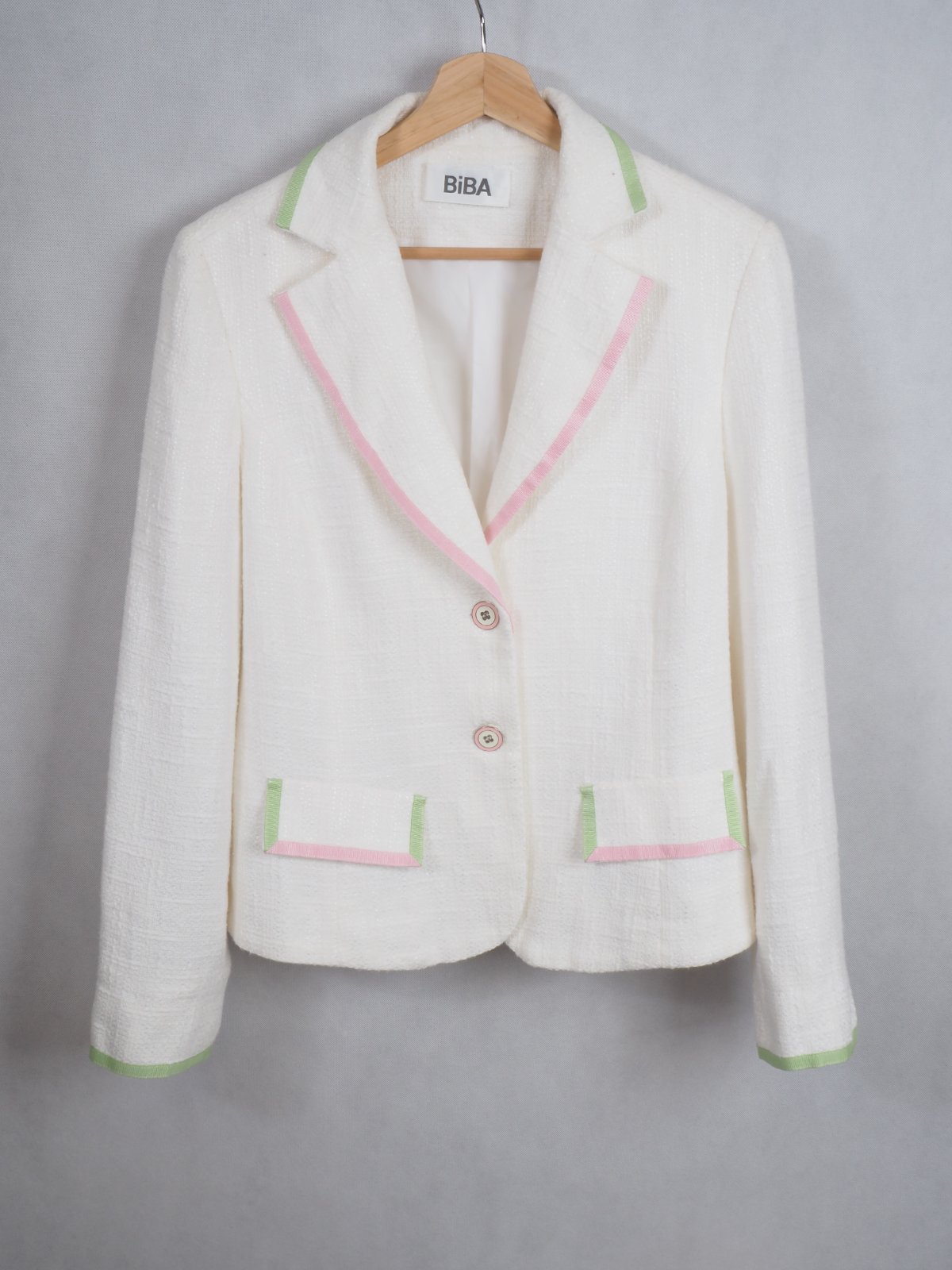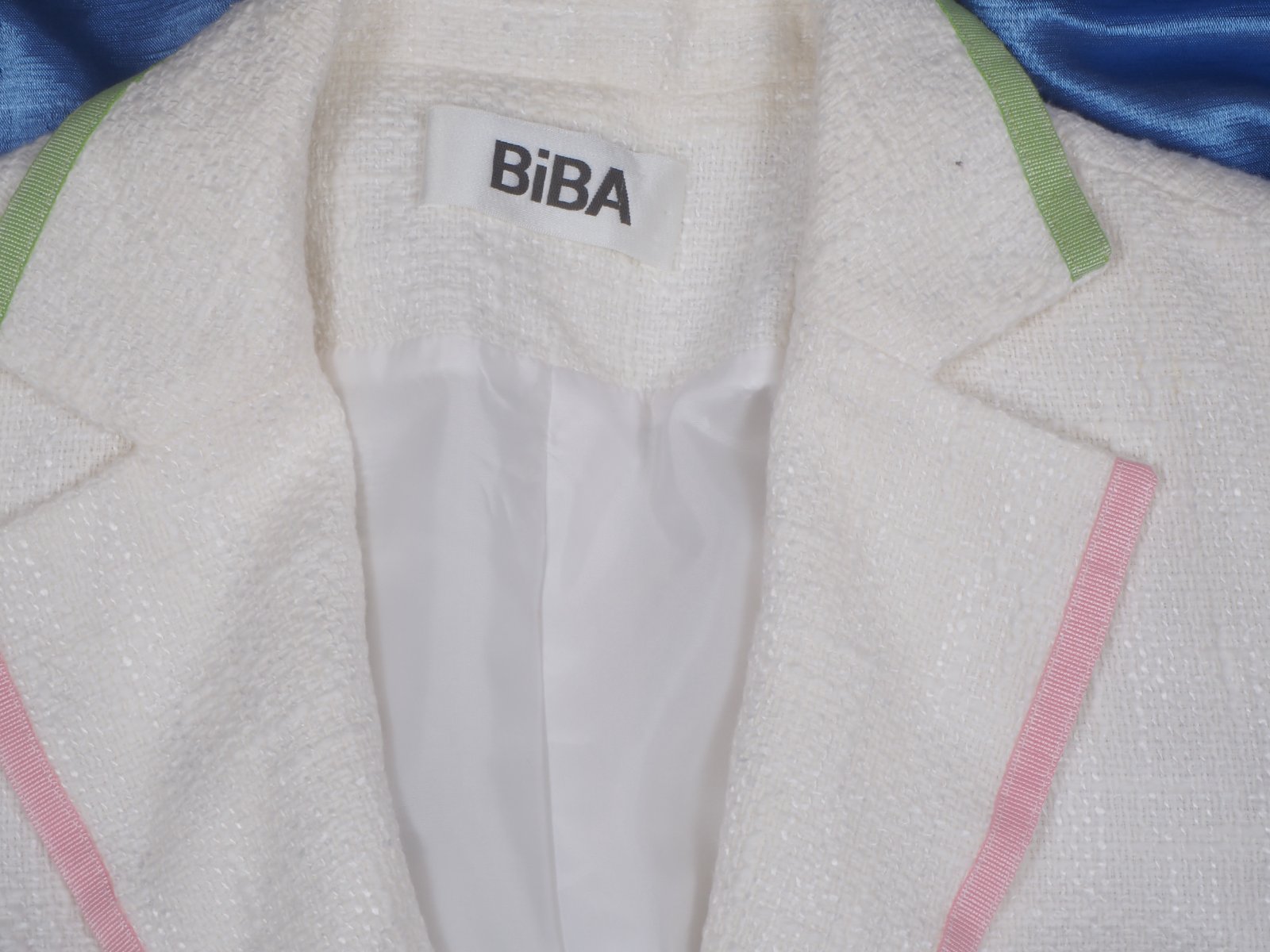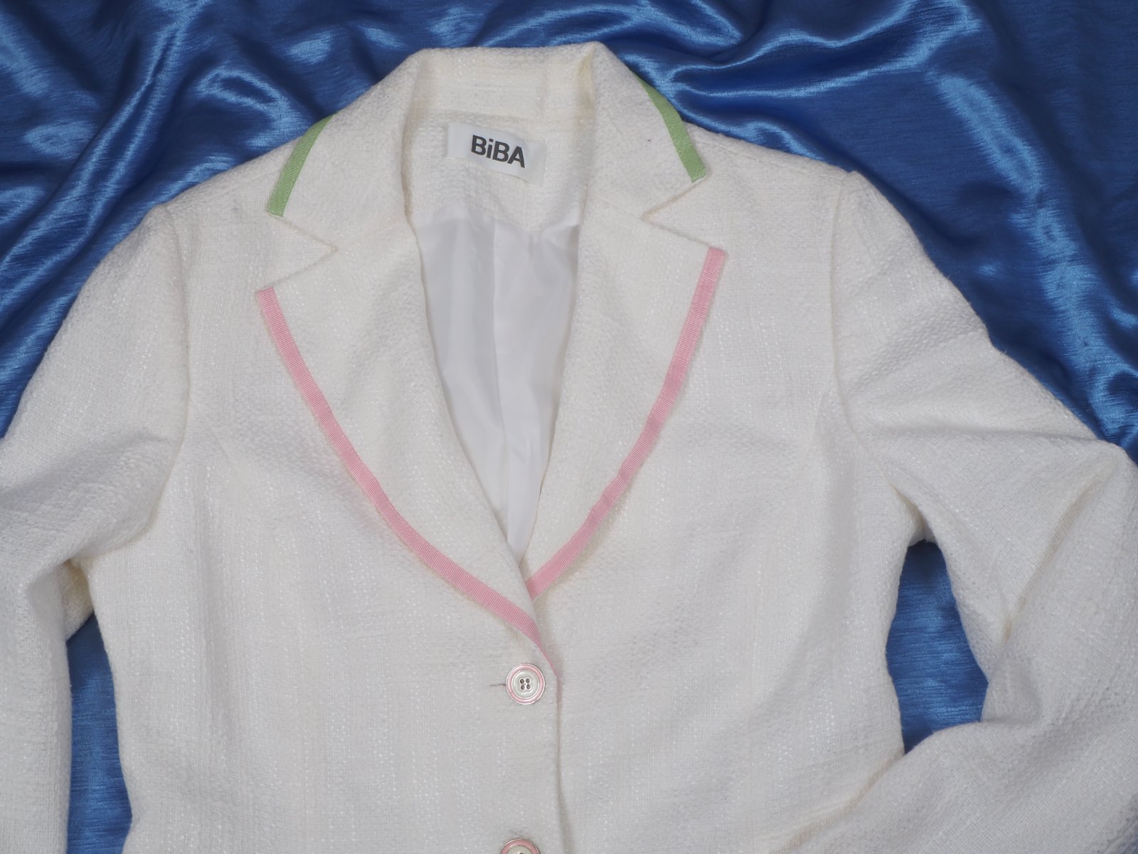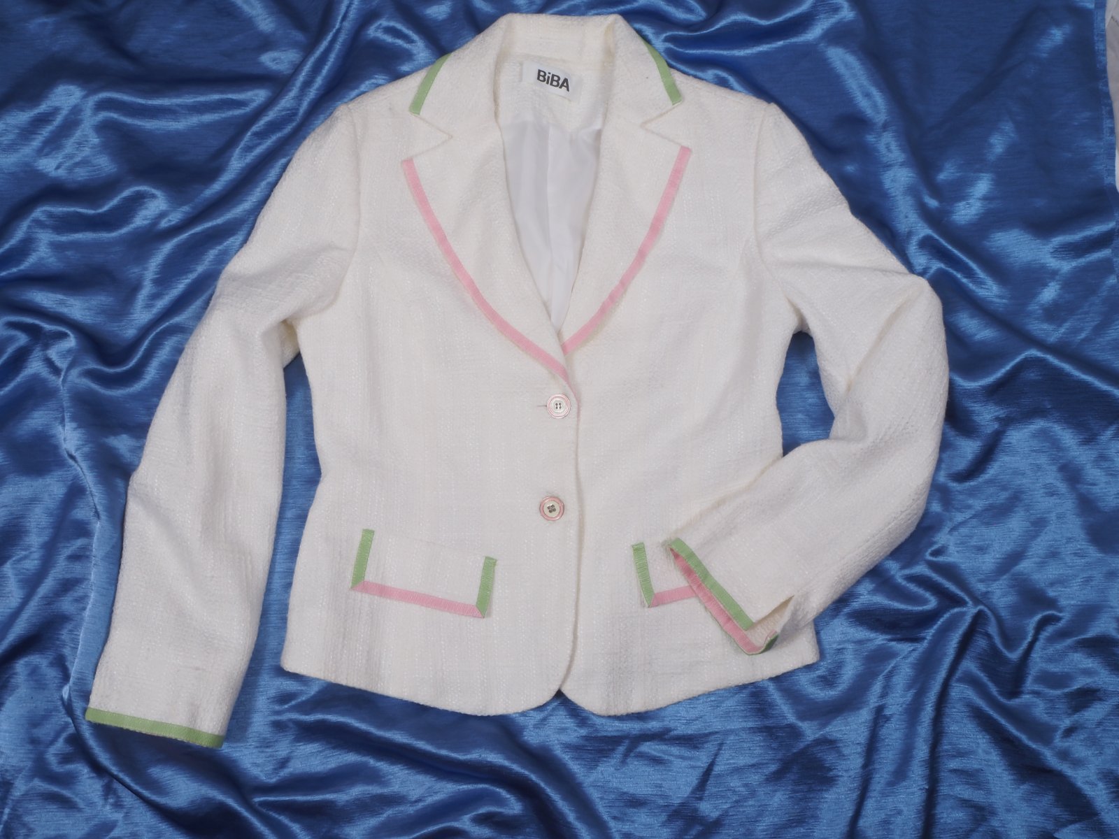Kvalitné trendové sako bielej farby s ružovým a zeleným lemovaním, zapínanie na gombíky, podšité, vrchný materiál 75% bavlna, 25% viskóza, štrukturovaný materiál, super stav.
