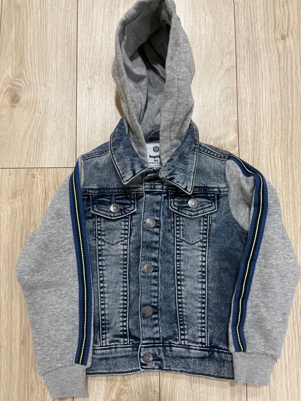 Pekna,100perc bavlnena prechodna bundicka s kapucnou,na jednom mieste flak,ale mozno sa da oprat