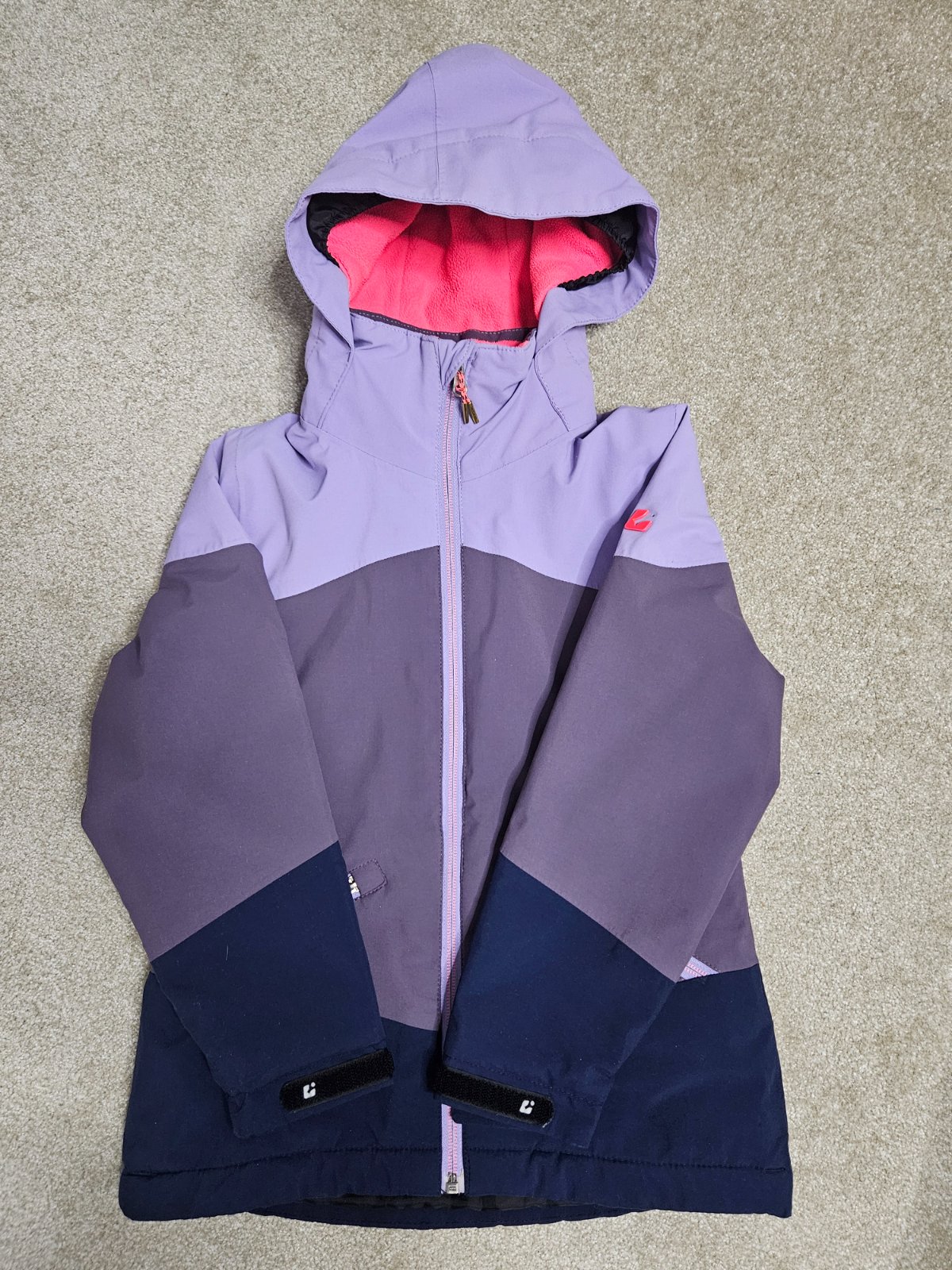 Predám dievčenskú lyžiarsku bundu, veľkosť 128/134. Bunda je kombináciou viacerých farieb - svetlofialovej, tmavofialovej ružovej a bielej farby s reflexnými prvkami a neodnímateľnou kapucňou. Zap...