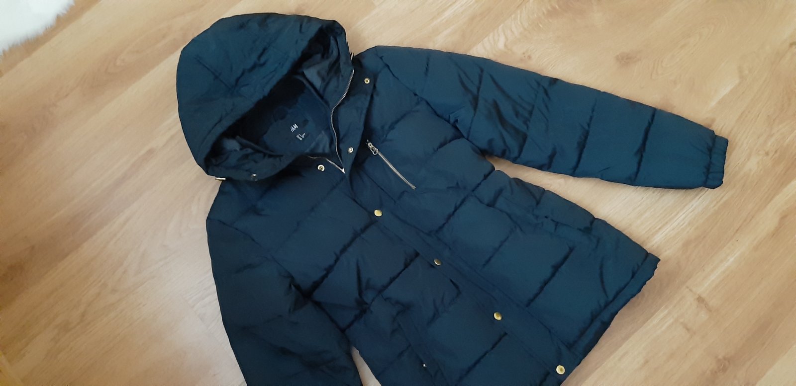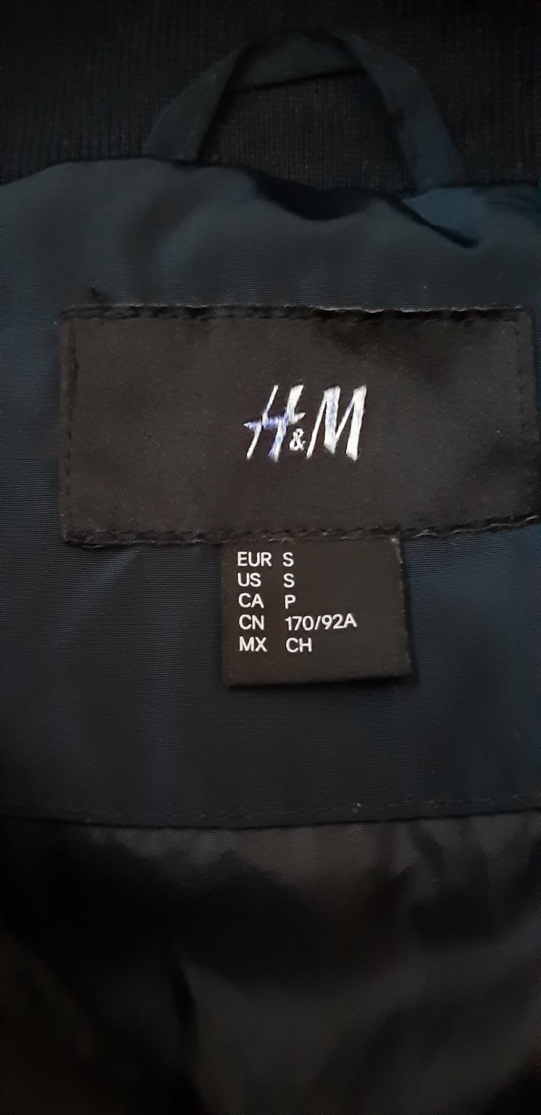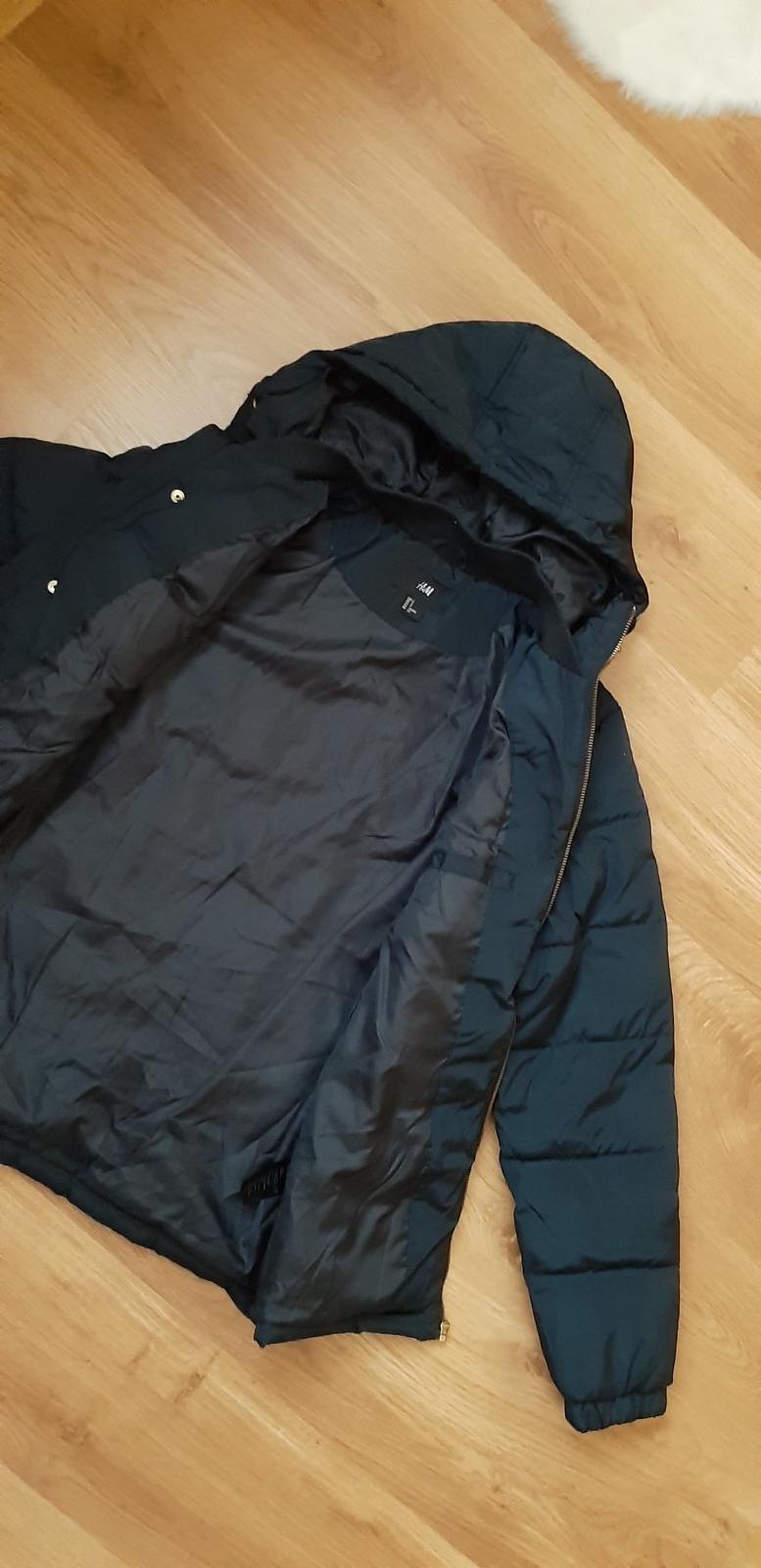 Tmavomodrá zimušná bunda H&M, v zachovalom stave, pod rukávom je zošívaná, no pri nosení vôbec nevidieť.