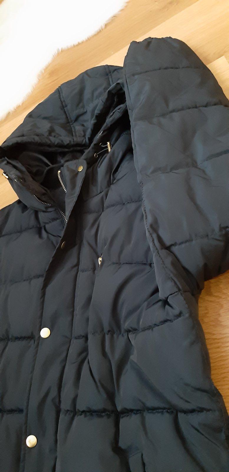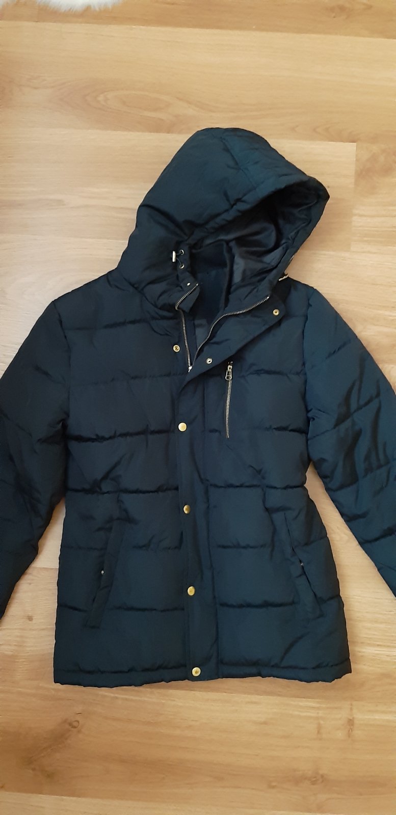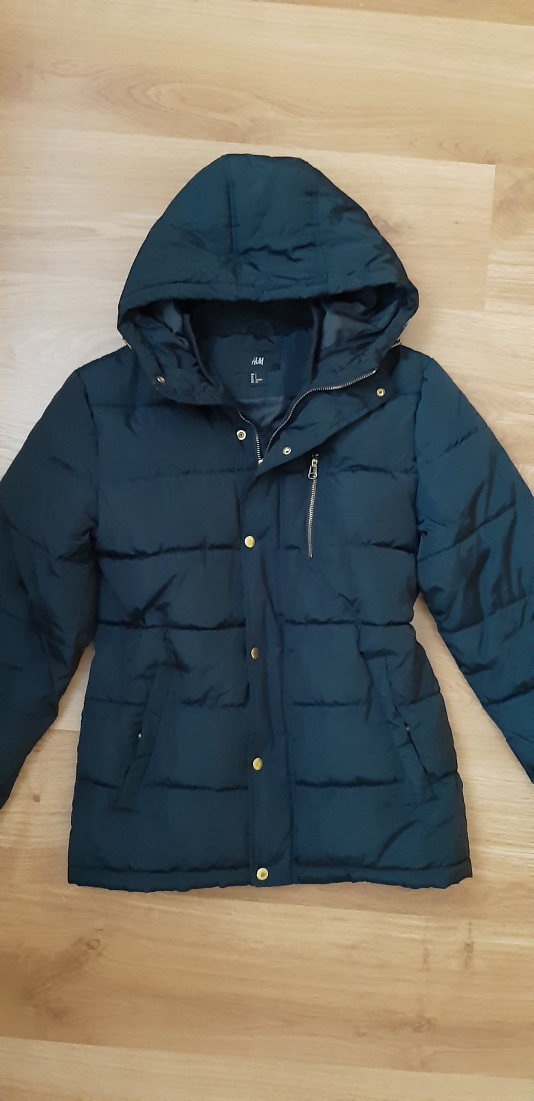 Tmavomodrá zimušná bunda H&M, v zachovalom stave, pod rukávom je zošívaná, no pri nosení vôbec nevidieť.