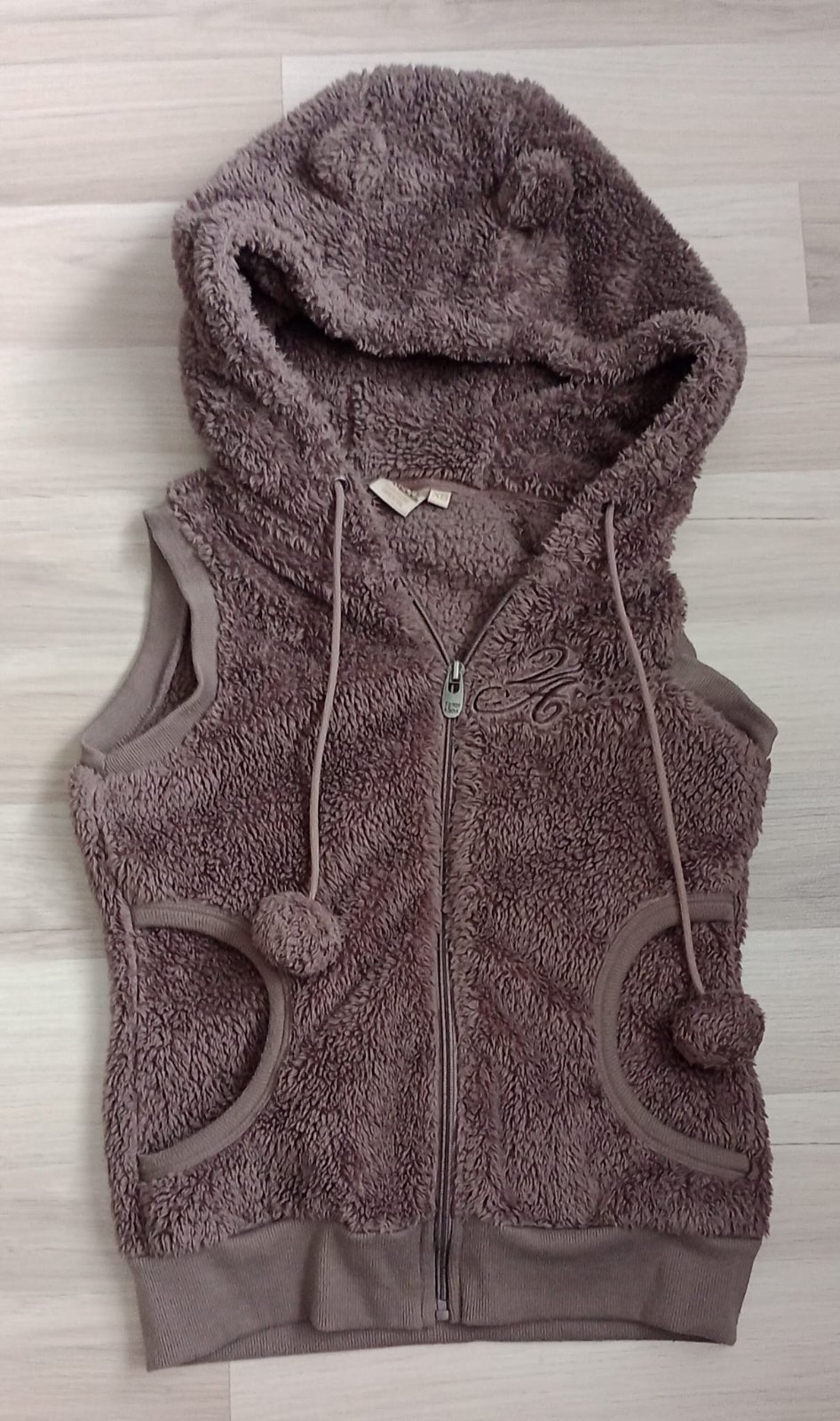 Nadherná zateplená vestička, zvnutra kozusinkou. Pekne spracovana, má upletové patenty v dolnom okraji a na ramenach, tiež ma kapucnu ukončenú kožušinkou., Pekná metalová farba, , oblečená bola pa...