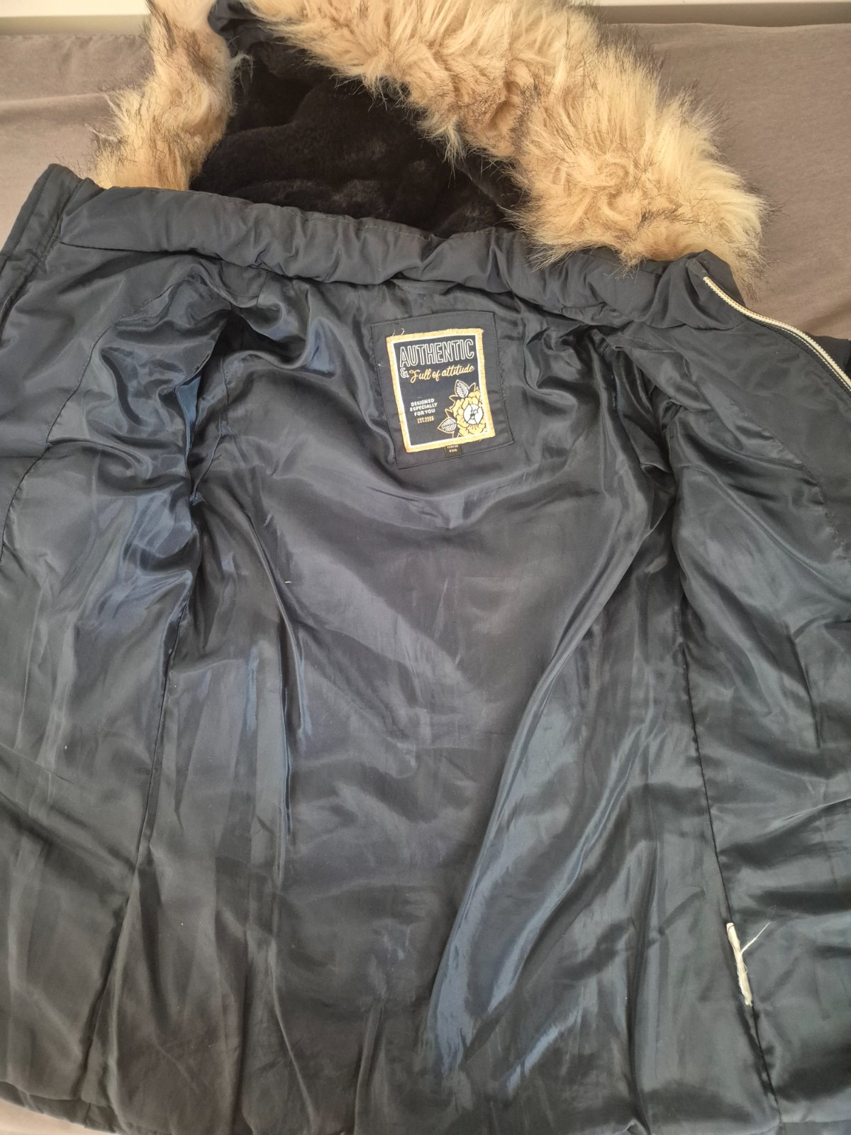 Jednu sezónu nosená veľmi teplá zimná bunda, celá podšitá kožušinou. Predĺžený strih, kapucňa, bez poškodenia. Podľa potreby premeriam. Tmavomodrá až čierna farba. Top stav. Neskutočne sedí.