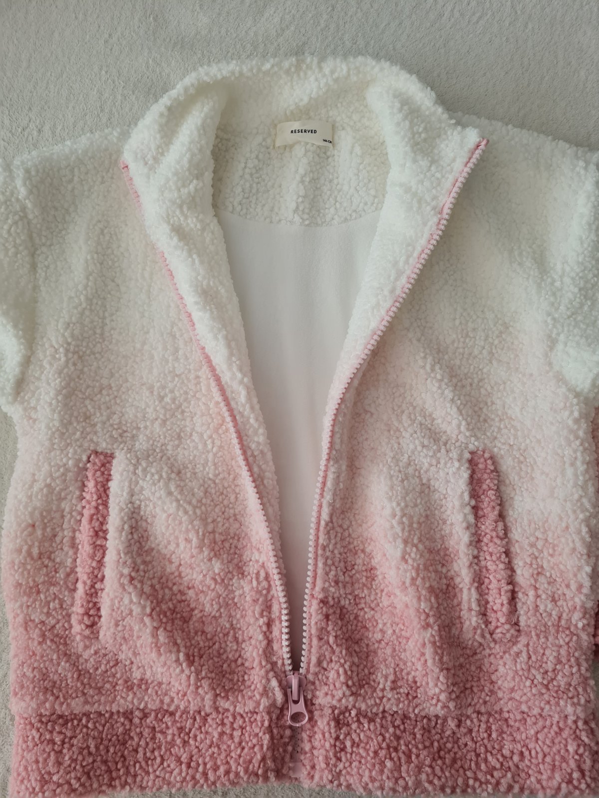 Ružová prechodná bunda veľkosť 146, zn. Reserved, výborný stav. Je perleťovo-ružovej metalickej farby. Rozmery: šírka pod pazucham: 2x43 cm dĺžka: 53 cm dĺžka rukáva úplne od krku: 64,5 cm
