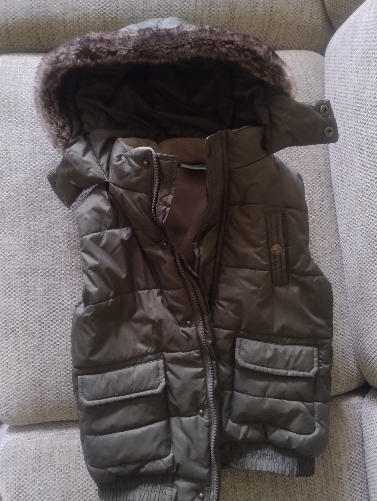 Párkrát oblečená dámska vesta, kúpená na nosenie počas tehotenstva, no už nevyužitá. Dá sa nosiť aj pri nosení dieťatka v nosiči. Skôr na prechodné obdobie. Šírka 55x2 dĺžka od ramena 56 cm.