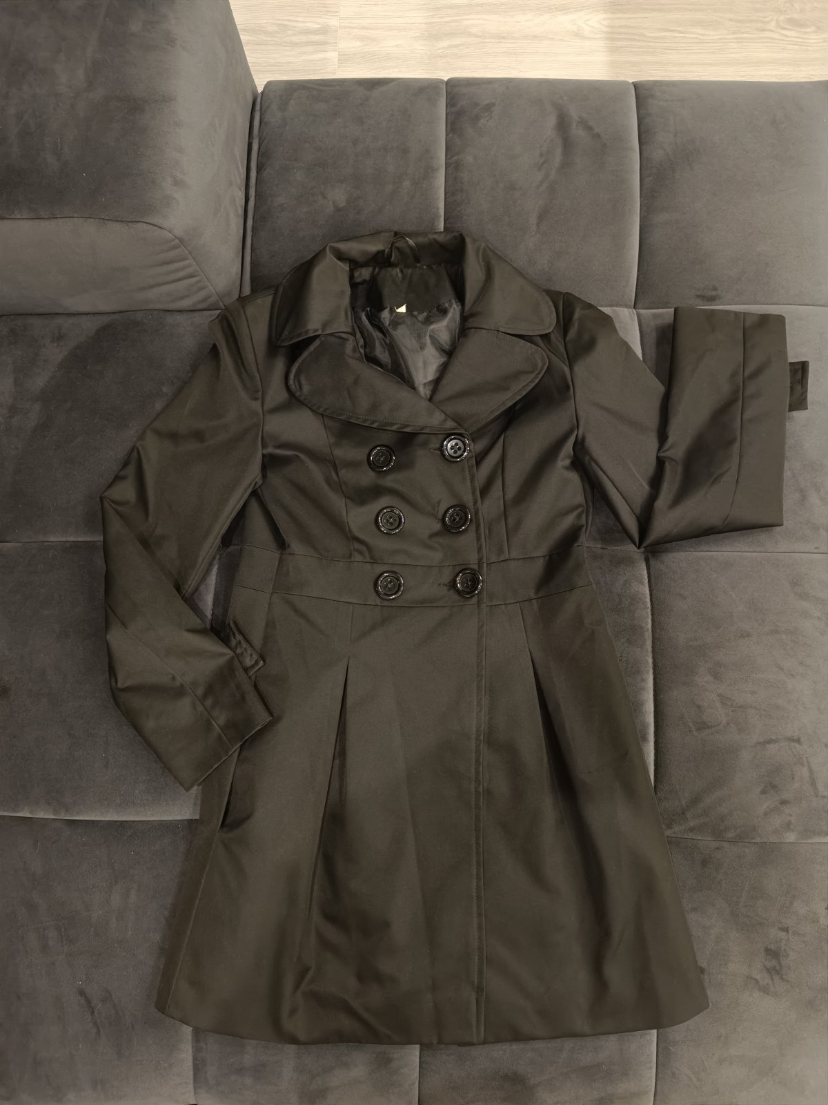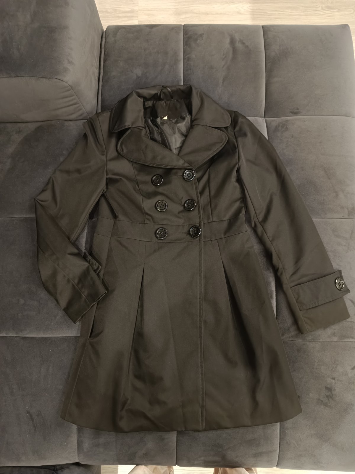 Velmi kvalitný kabátik Made in Italy na prechodné obdobie. S modernými detailami akými sú fazónkový golierik, imitácia opaska a vreciek s ozdobnými zlatistými gombíkmi. Oblecený raz, ako nový bez p...