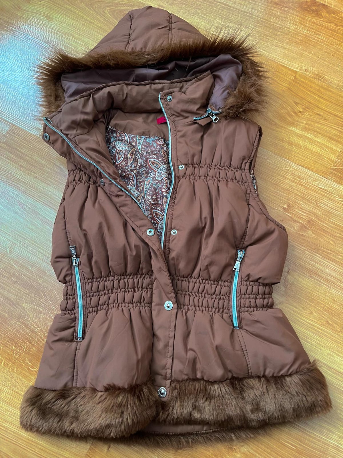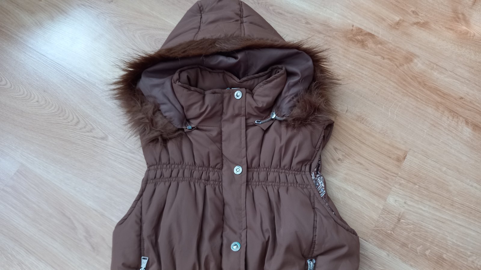 Predám nepoužitú prešívanú vestu s kožušinovým golierom zn. PIETRO FILIPI originál vesta je podšitá, prešívaná, vyformuje pekne postavu 2 vrecká na zips farba hnedá so vzorom ruží Veľmi pekná na ož...