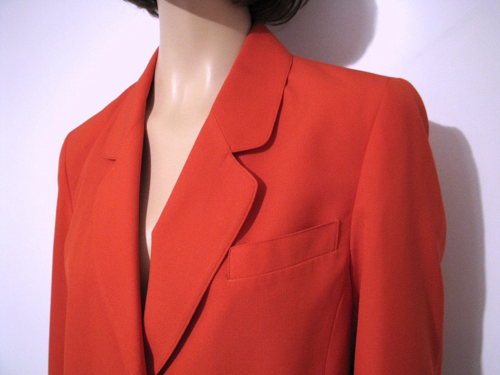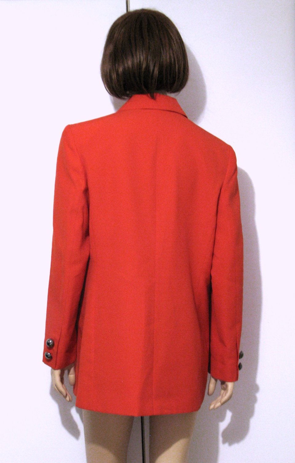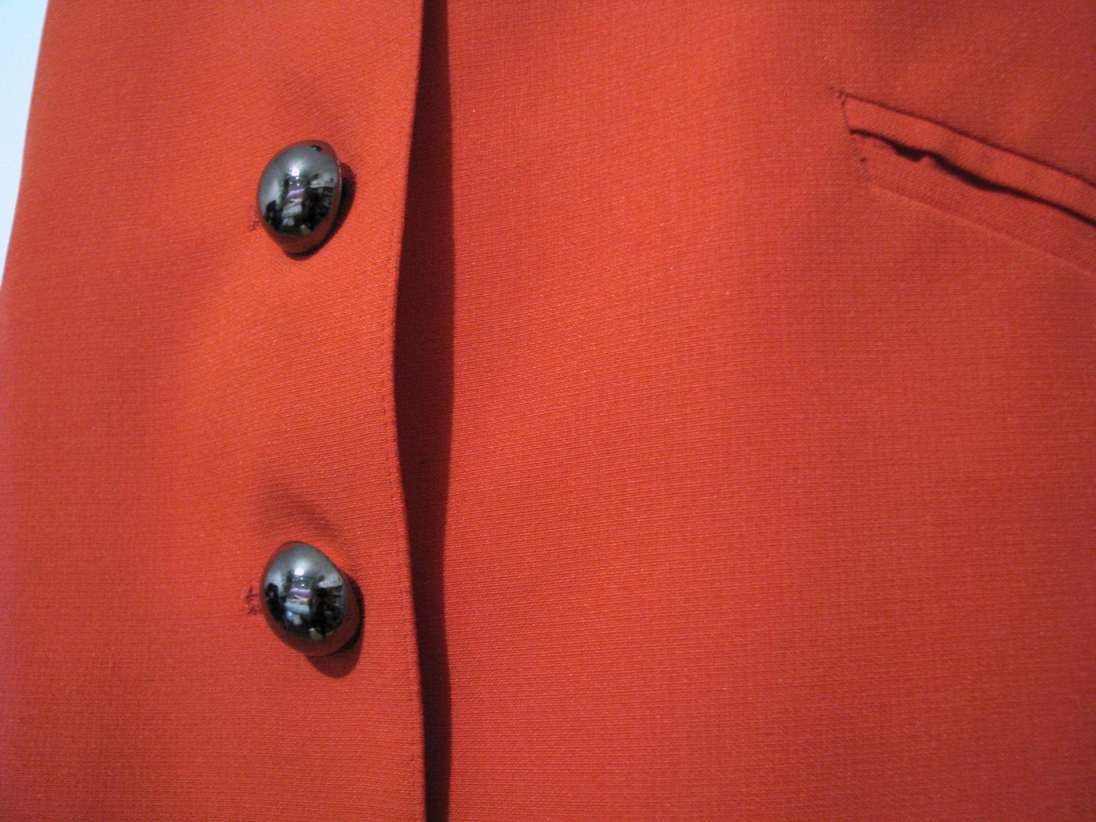 Sako svetlej červenej farby (na fotkách sa zdá byť viac do oranžova a krikľavejšie ako v skutočnosti; je to reálne taká svetlejšia farba nezrelej jahody :) ). Dlhší strih. Výborne zachovalé, bez poškodení. Veľkosť píše 38, no určite aj na 40. V prípade záujmu premeriam.