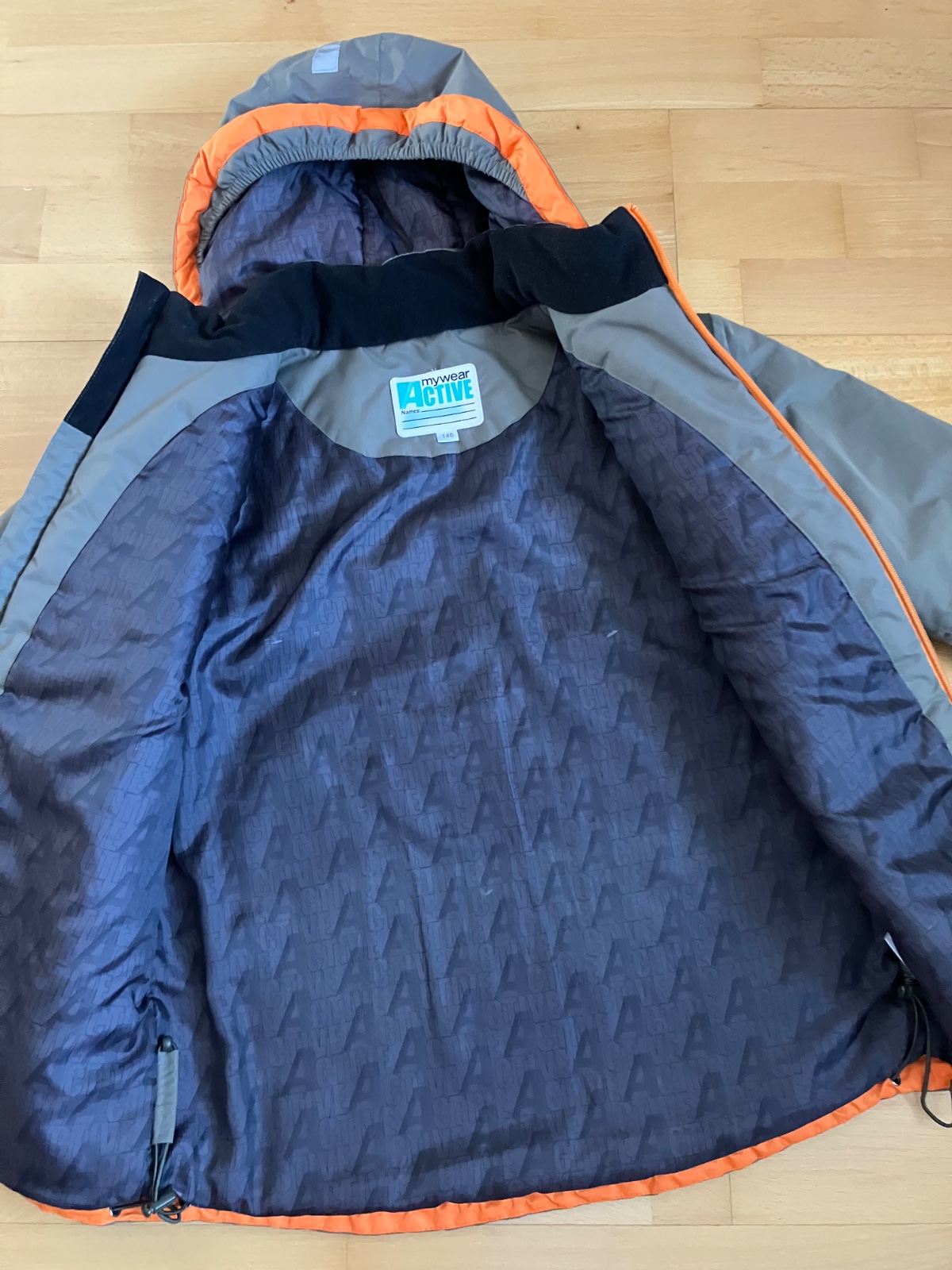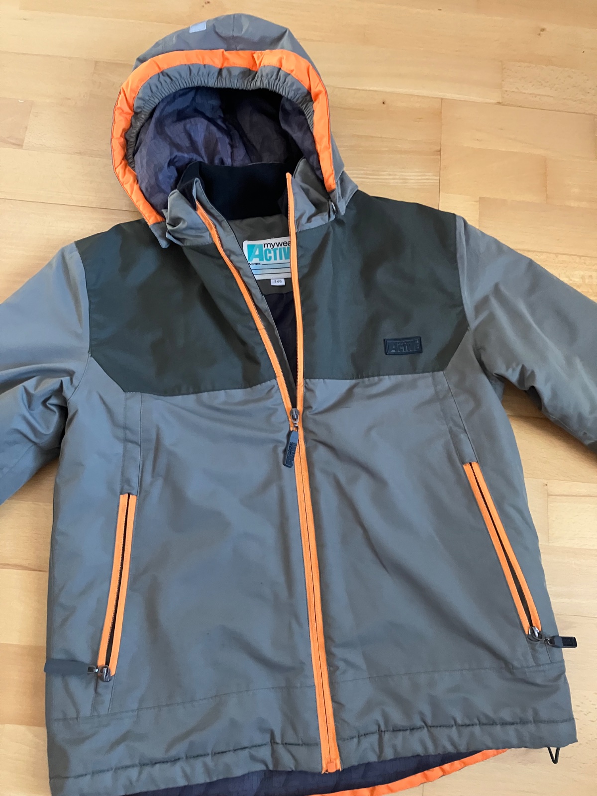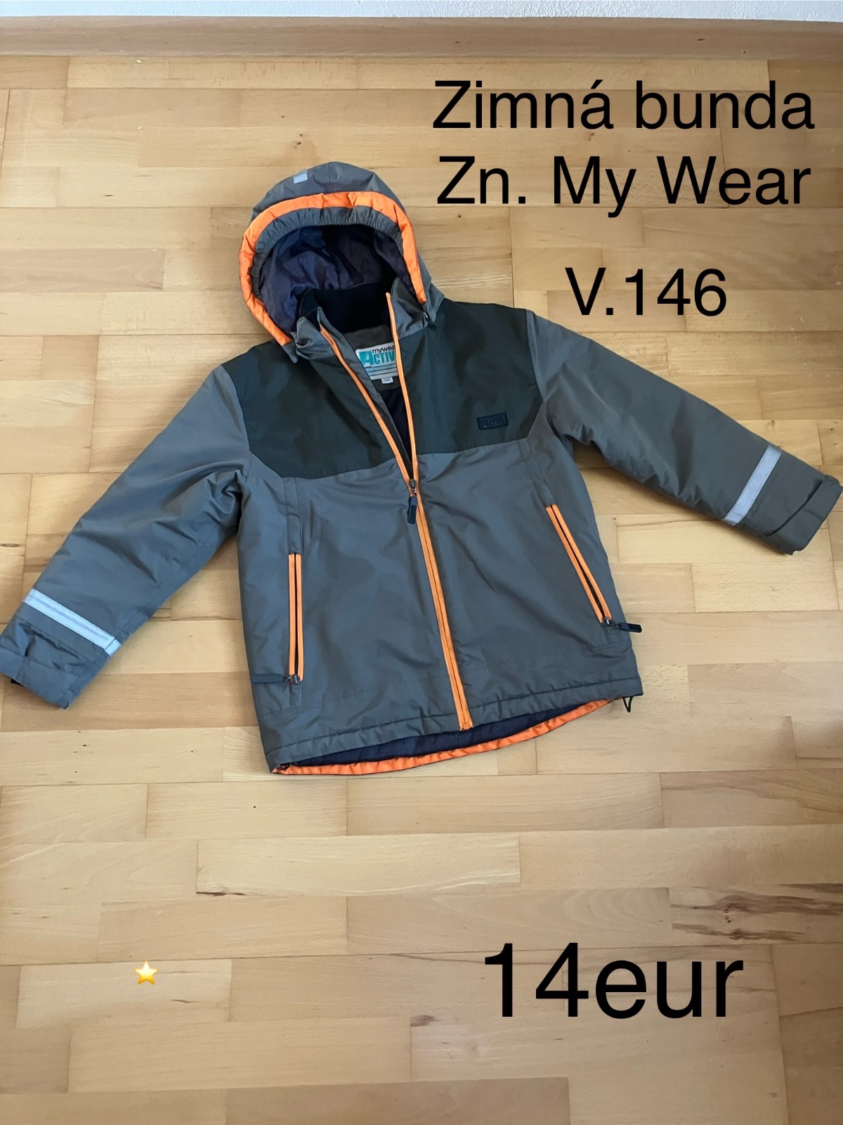 Zimna bunda pre chlapcov11-12 rokiv, nosena, bez poškodení, s refkexnymi prvkami, kapucňa sa da odopinat. Miery: šírka: 50 cm dlzka: 63 cm dlzka rkukava: 50 cm, spolu s plecom: 65 cm