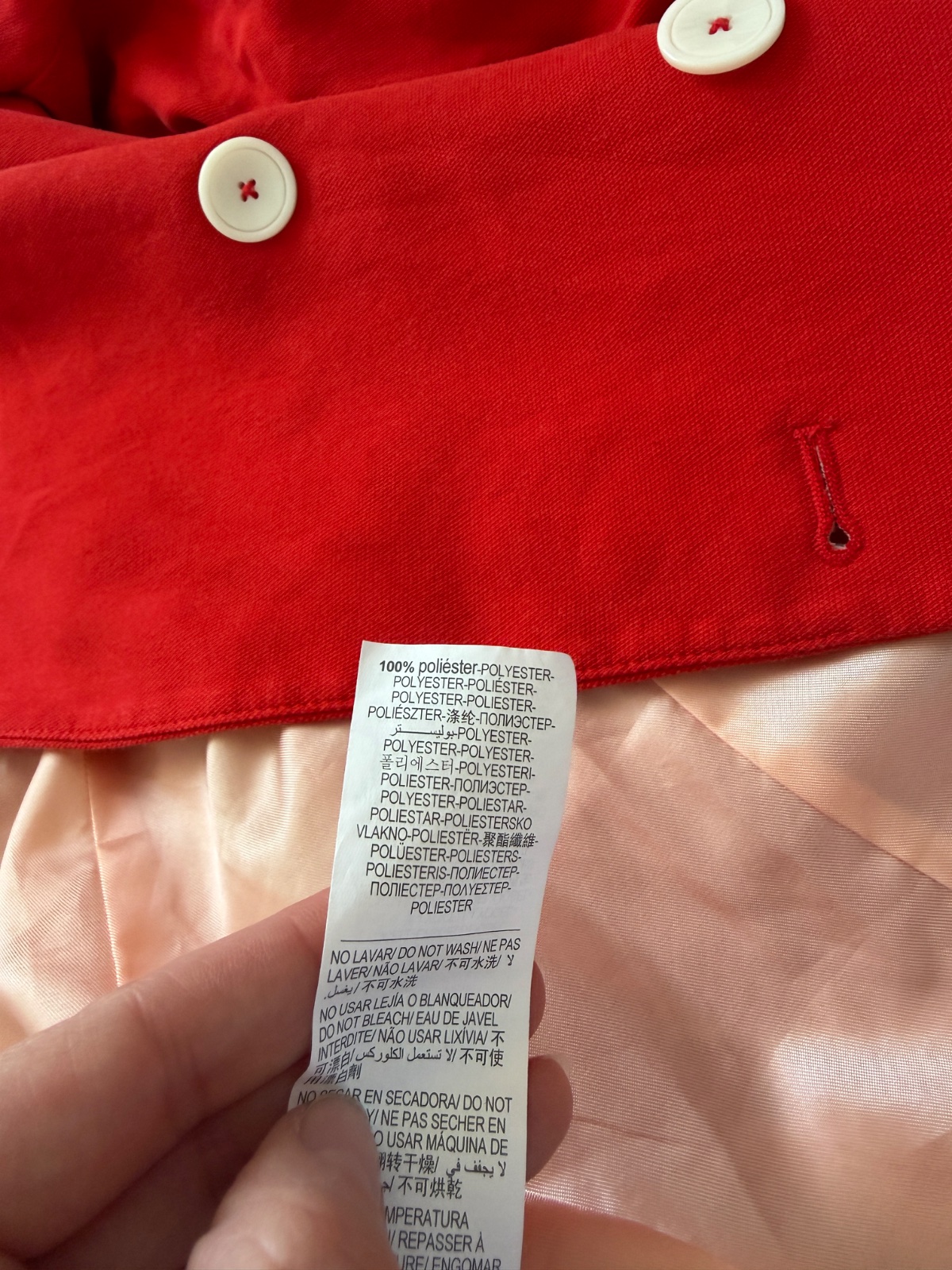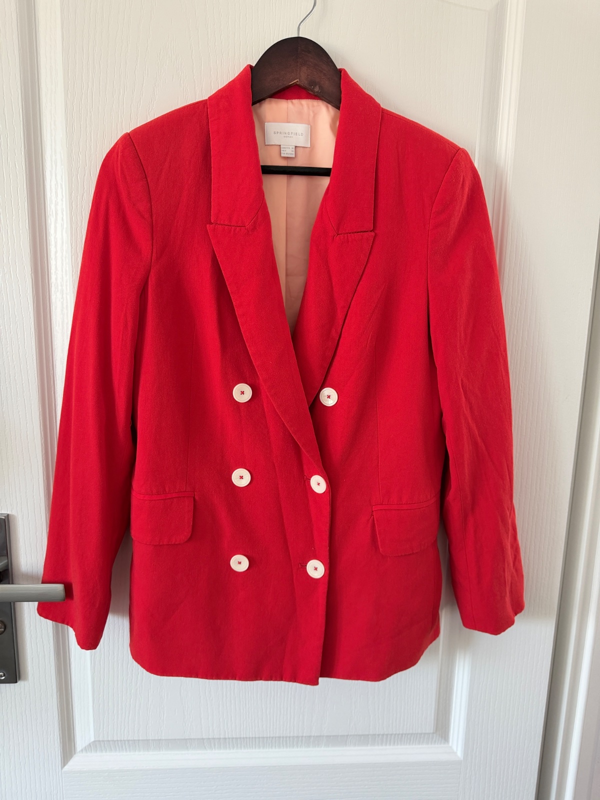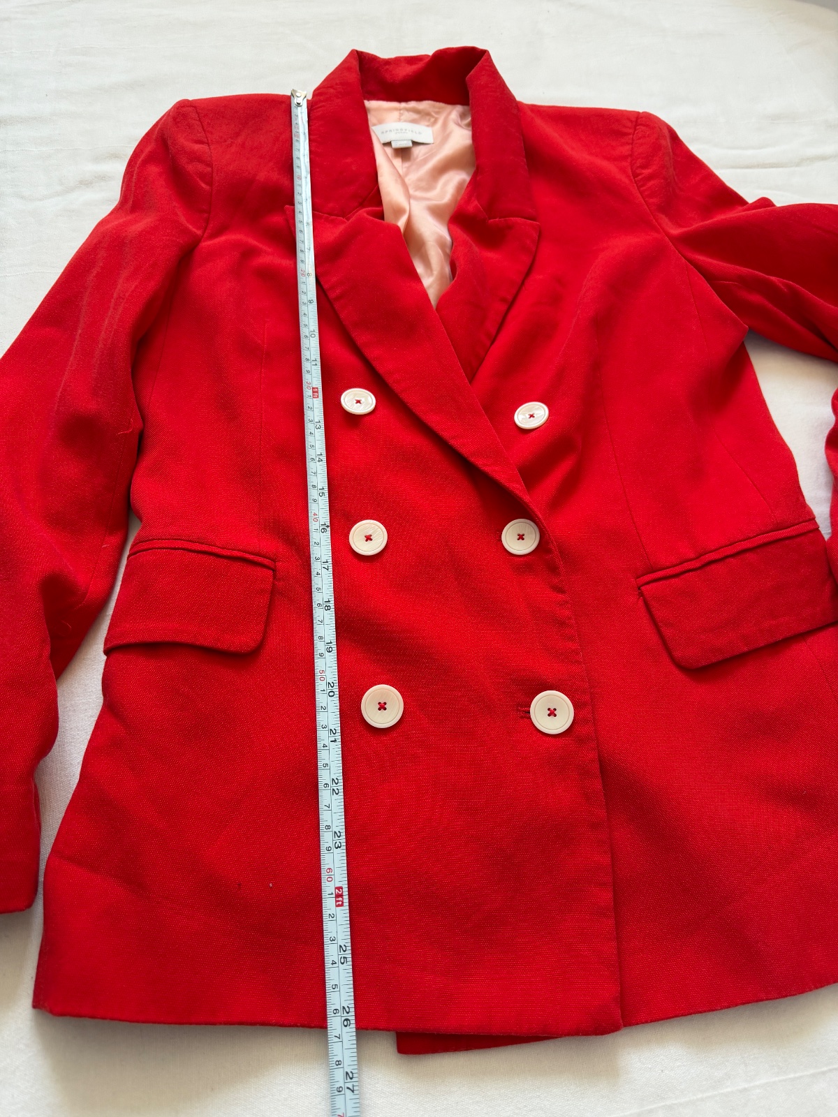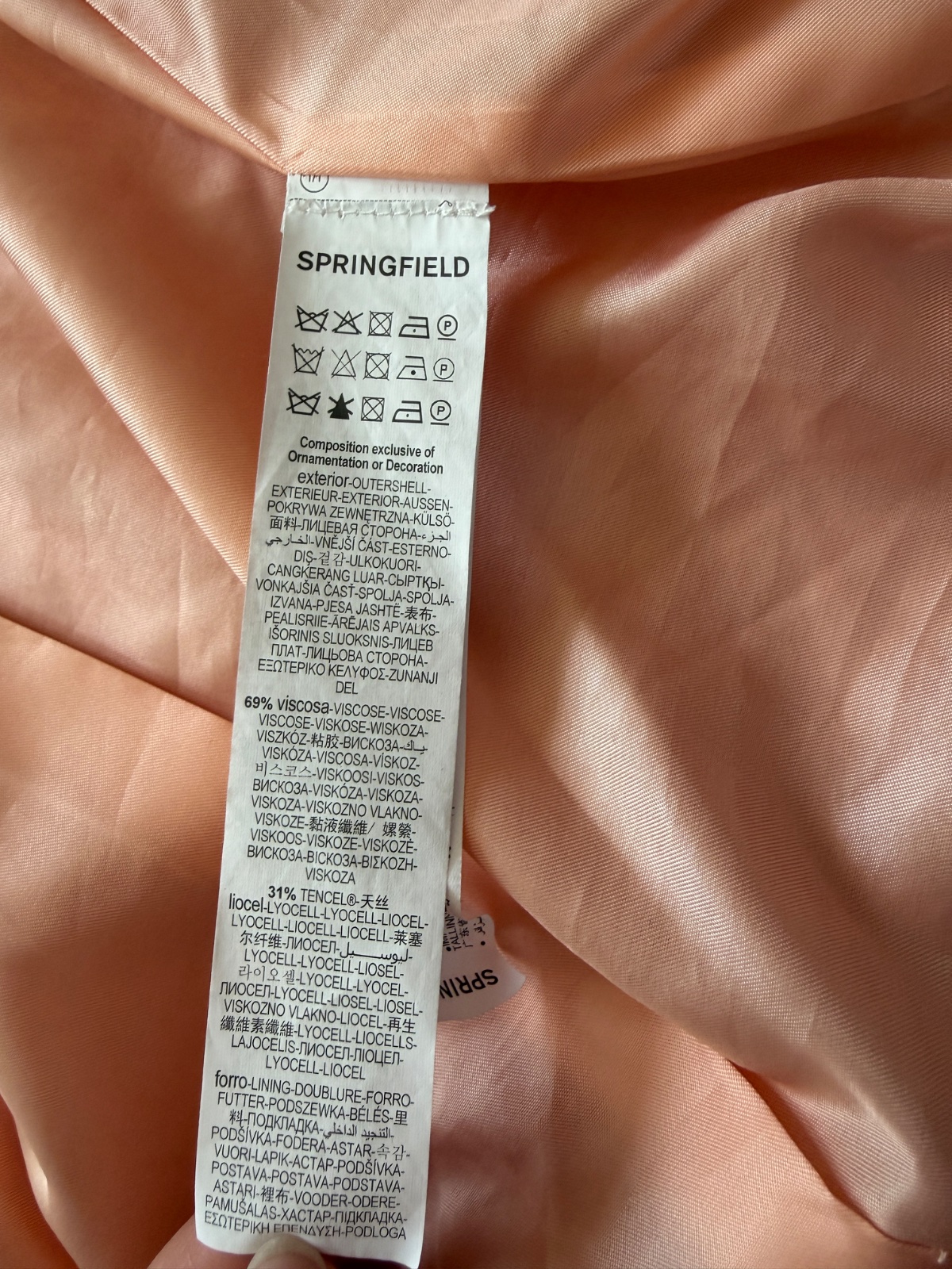 Štýlové dámske červené sako od Springfieldu. Ideálne na elegantný štýl aj na rozptýlenie ležérneho vzhľadu s džínsami. Vďaka zmesi viskózy a Tencelu je látka mäkká na dotyk, priedušná a krásne splýva. Sako má dvojradové zapínanie (ozdobné biele gombíky s červeným prešívaním). Klasické klopy, dve vrecká s klopou a jemné vypchávky na ramenách zvýrazňujú siluetu. Sako má hladkú púdrovo ružovo/béžovú podšívku.