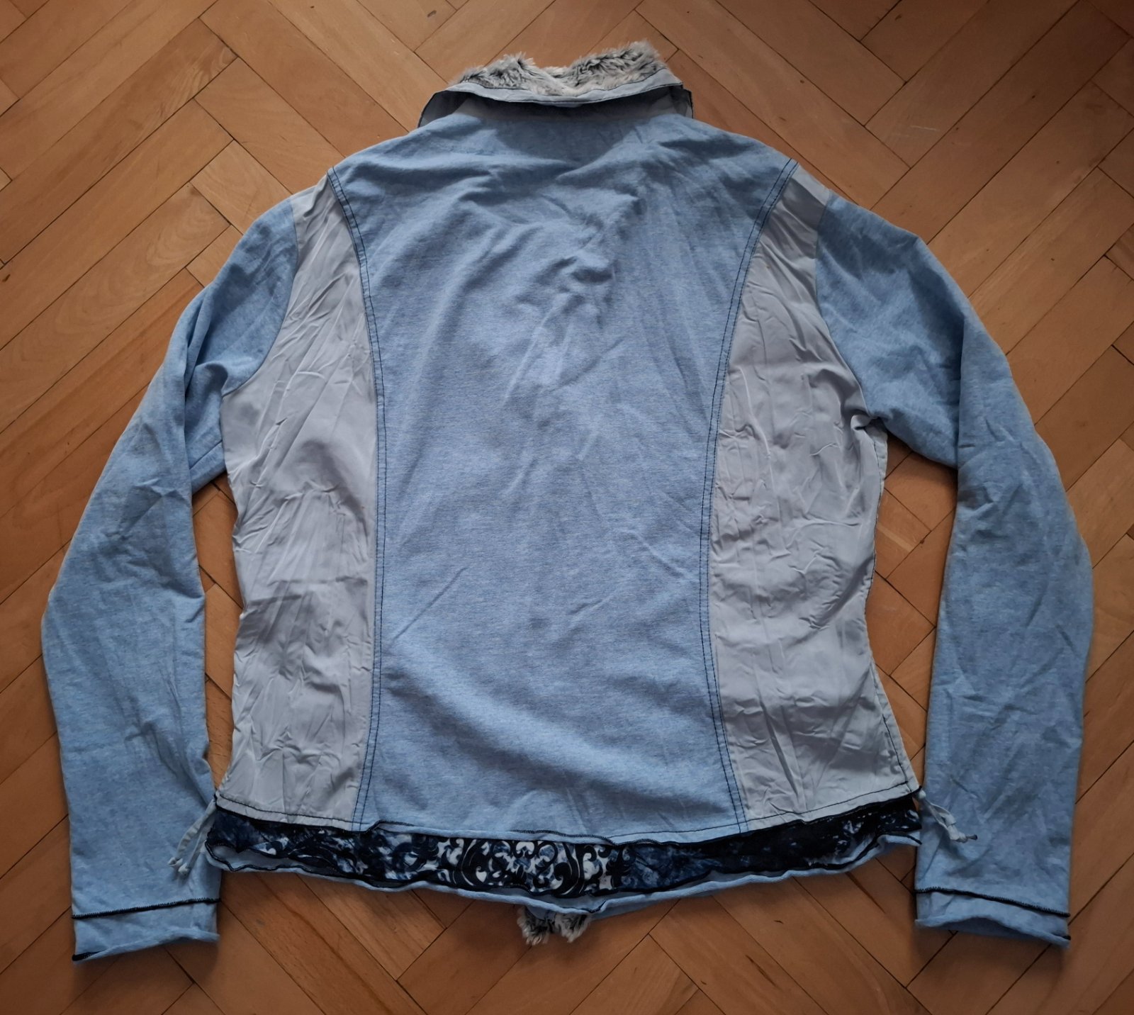 3BK/7 svetlej modrej farby,bezny noseny stav bez vyblednutia,dier ci flakov,material ako teplakovina sirka-44 dlzka-57 rukav-55