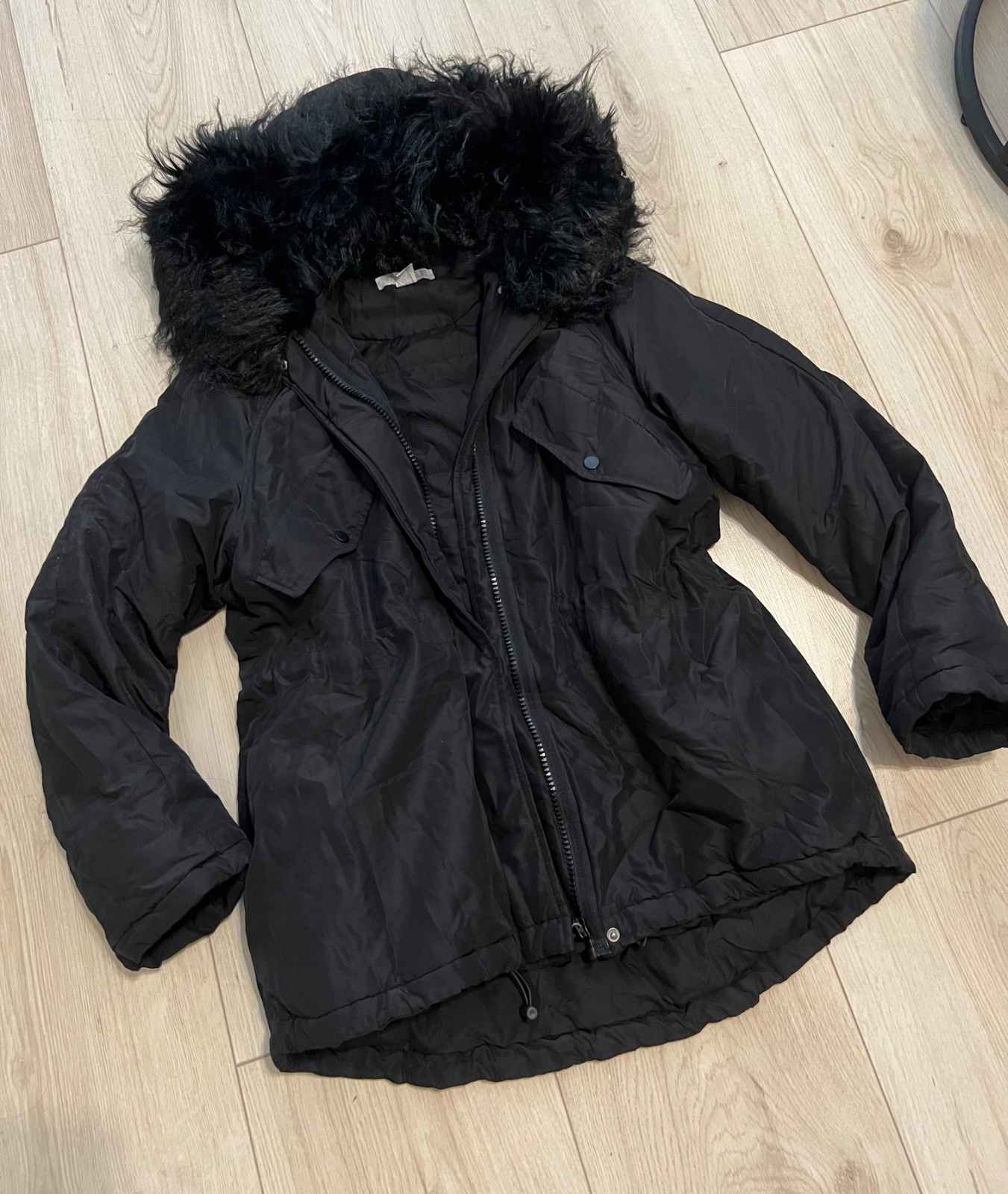 **SUPER stav*. Chybičky na foto č.7. (lesk na lakťoch, 0,5cm mesiačik pravý rukáv) Materiál: 100% polyester, Futro: 100% polyester (mäkký, hladký, ťažší) Miery: dĺ -67cm (chrbát od kapucne) š -51cm...
