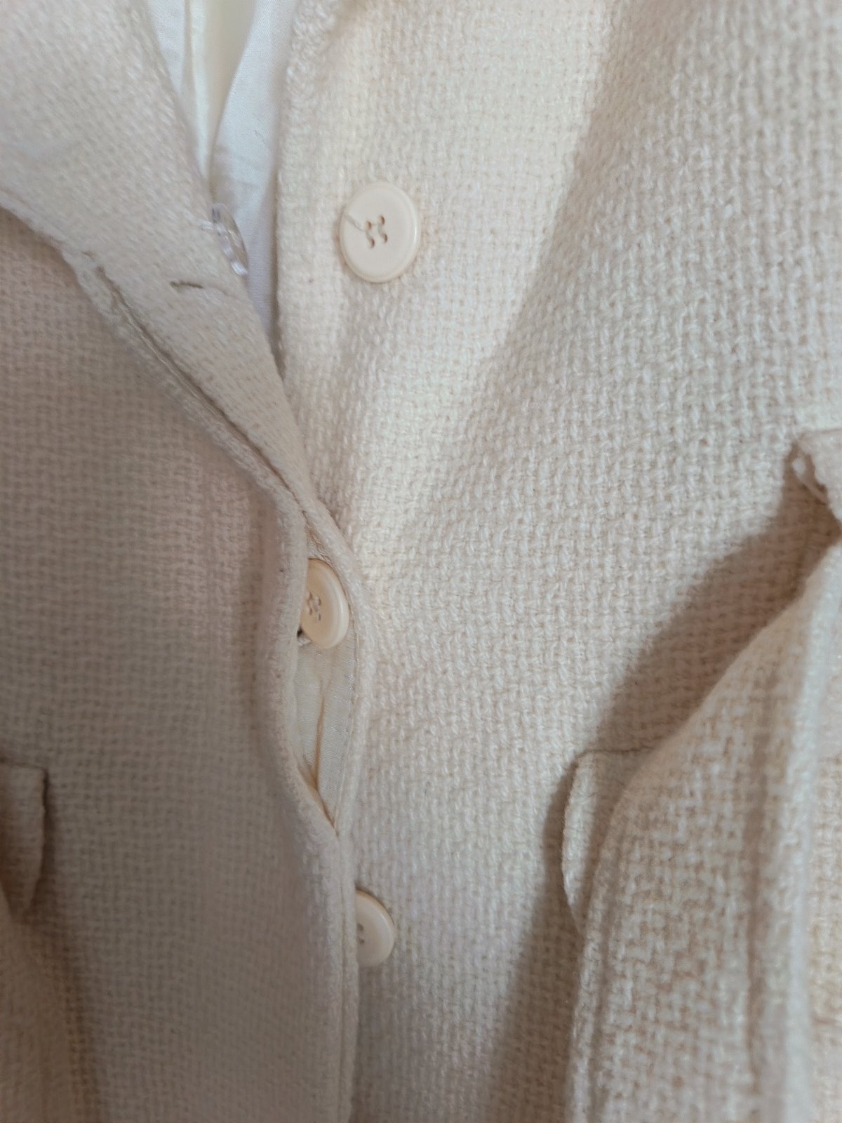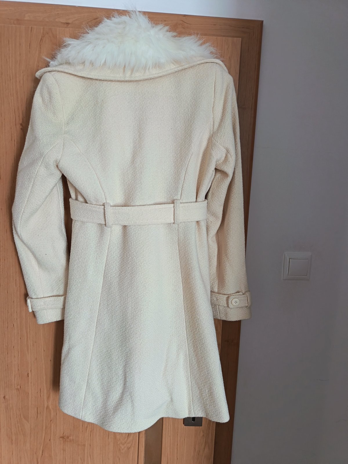Kabat kremovej farby s opaskom talianskej znacky. Velkost 38. Material 65% vlna, 25% polyamid, 5%lycra, 5% kasmir. Dlzka cca 83 cm.