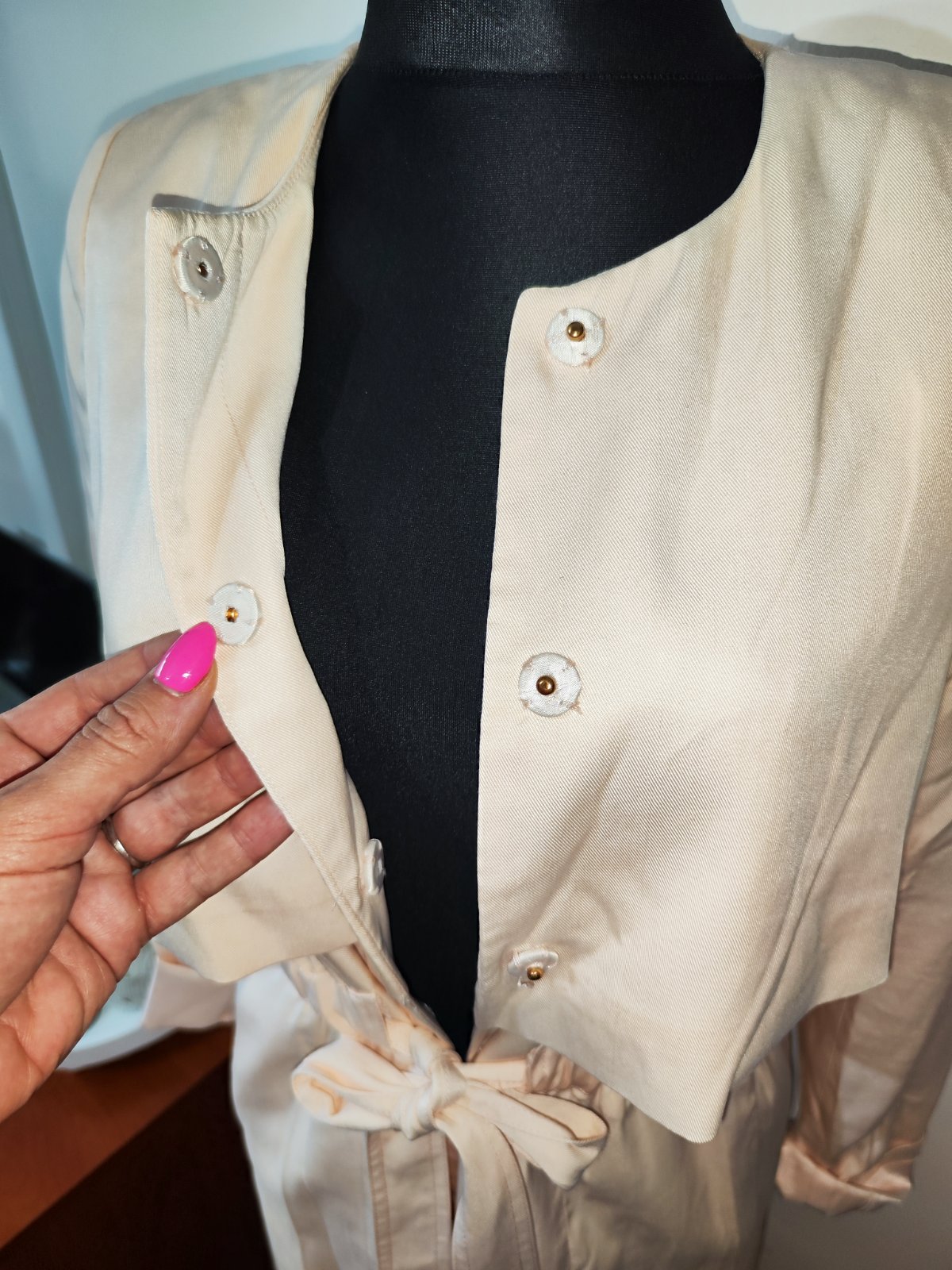 Farba pudrová, objednané z Ali, top stav, namna úzke uz. Velkost M/L, Dlzka 78cm, sirka pod prsami 49cm, pás 41cm, rukàv od pleca 56cm.