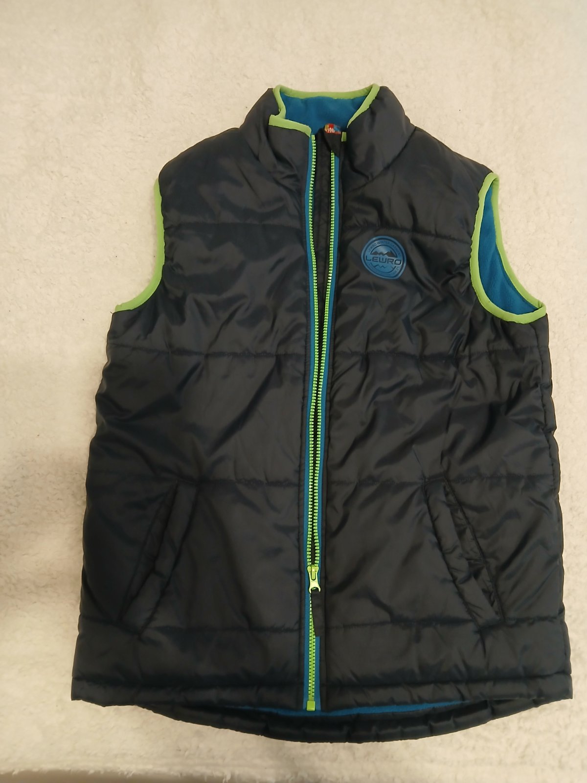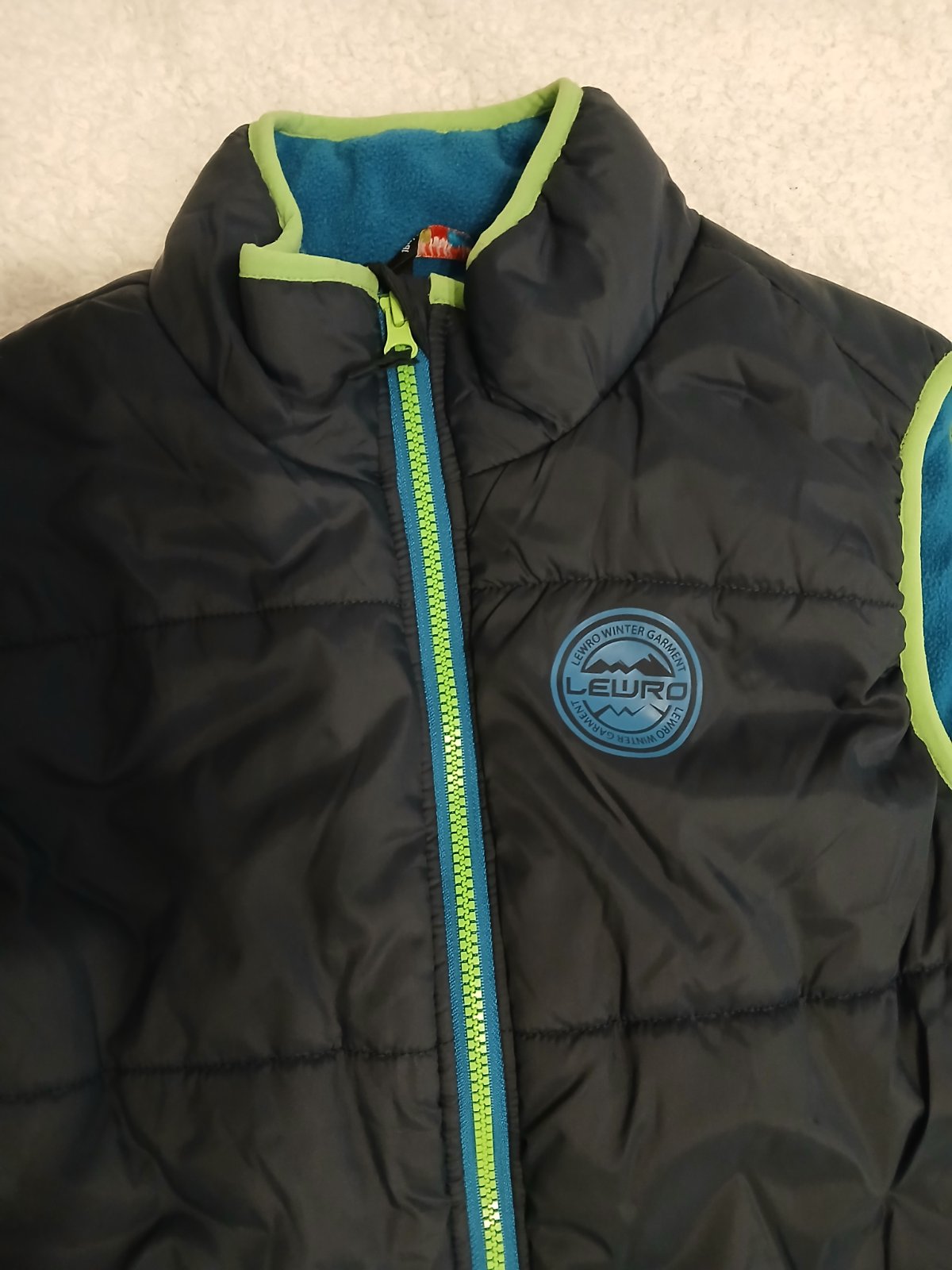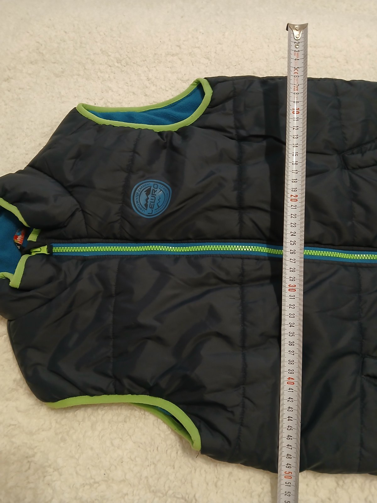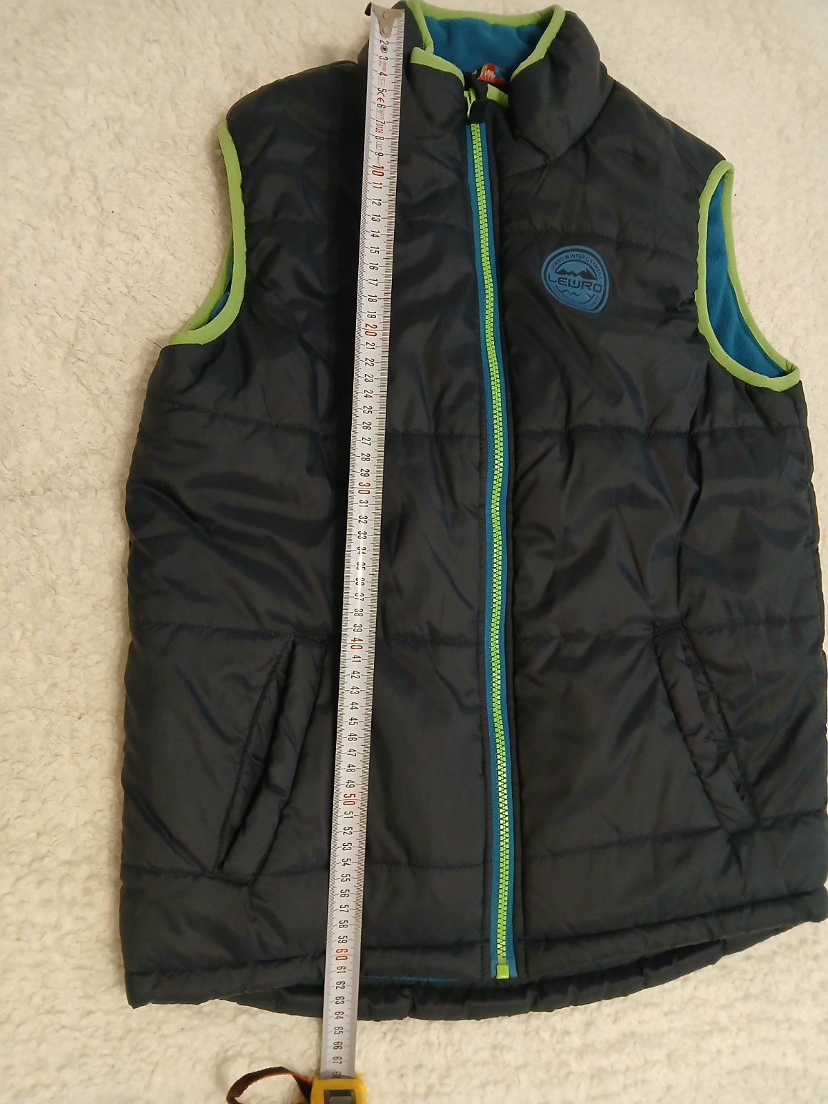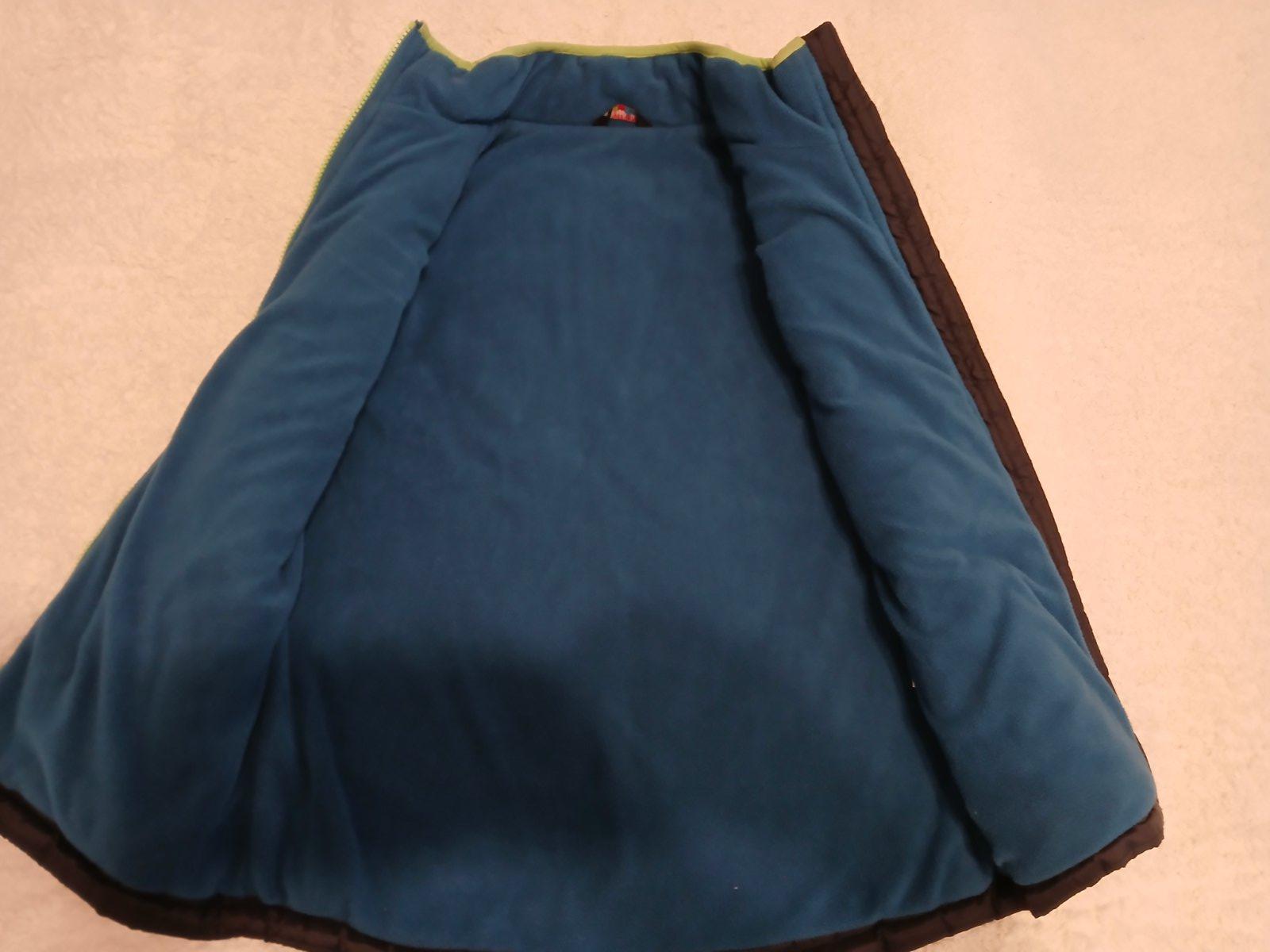 Krásna vesta TOP STAVE AKO NOVÁ tmavomodrá v kombinácii zelený zips svetlejšie modré zateplenie