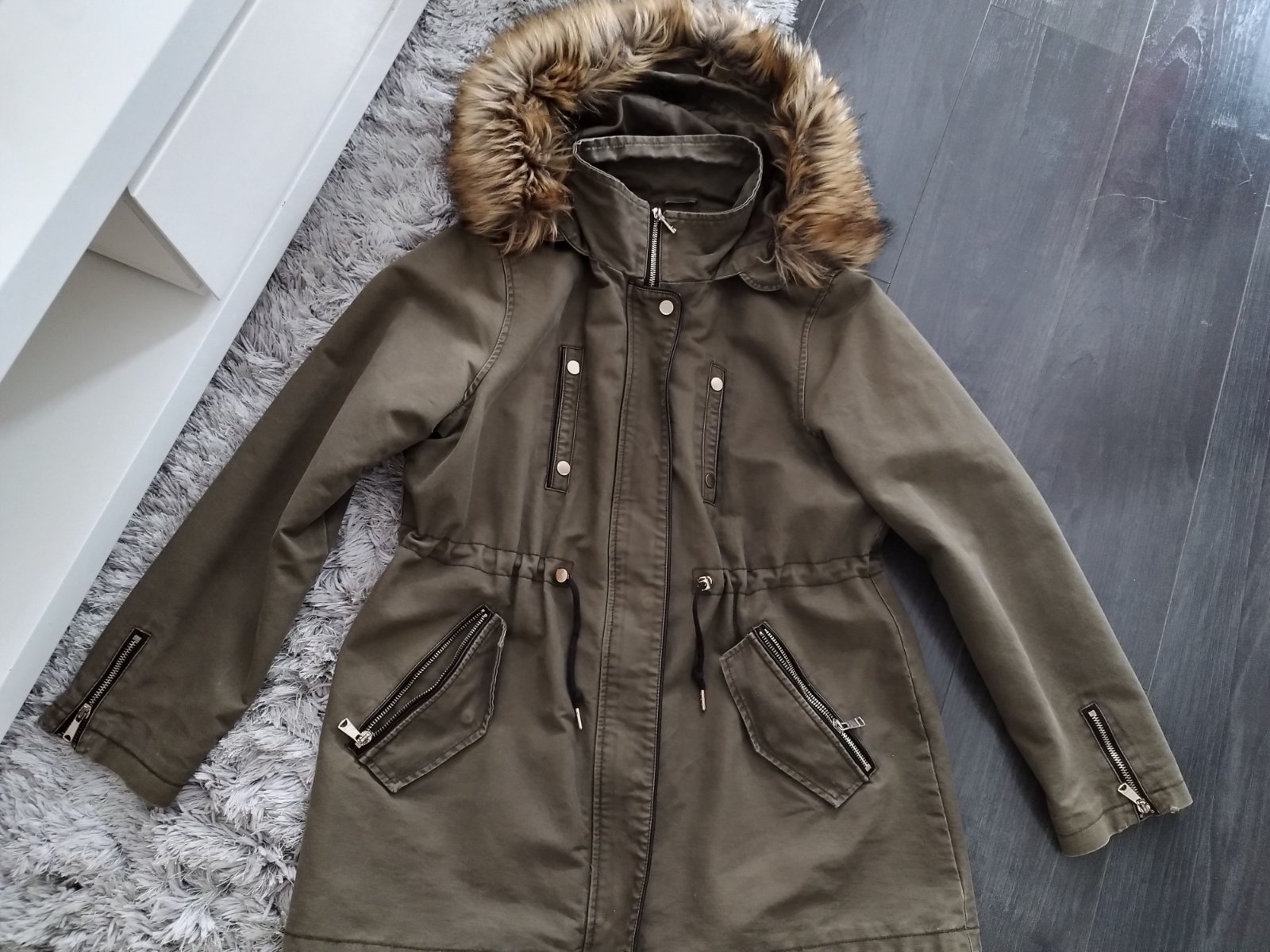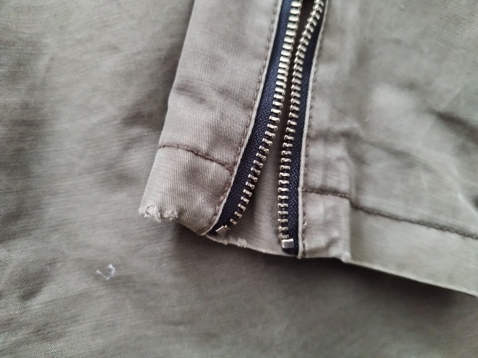 Vynikajúci stav, z vonkajšej strany nemá žiadne známky nosenia takže vyzerá ako nová. Vnútorná vložka je taktiež vo vynikajúcom stave, avšak na spodku je trochu zafarbená od modrých riflí. Na rukávoch vetrovky je vidieť na fotkách maličké poškodenie. Nič vážne. Vetrovka je oproti cene z obchodu za výrazne nízku cenu. Na štítku uvedená veľ.44 no rozhodne je menšia. Sedí na veľ. L/40